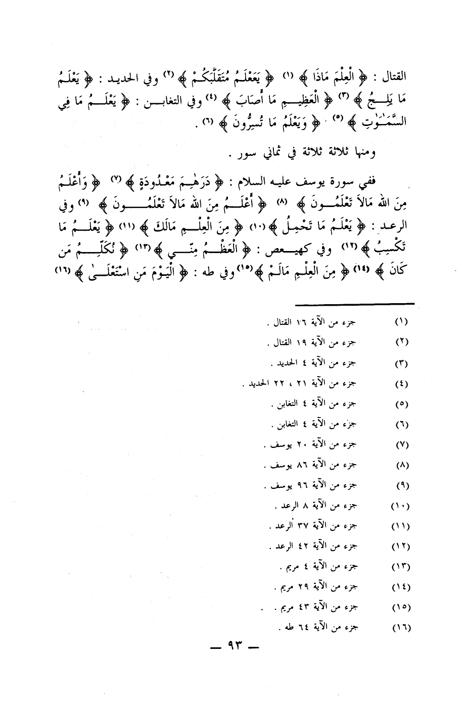 ففي سورة يوسف - عليه السلام -: {دَرَاهِمَ مَعْدُودَةٍ} (¬7) {وَأَعْلَمُ مِنَ الله مَالَا تَعْلَمُونَ} (¬8) {أَعْلَمُ مِنَ اللهِ مَالَا تَعْلَمُونَ} (¬9) وفي الرعد: {يَعْلَمُ مَا تَحْمِلُ} (¬10) {مِنَ الْعِلْمِ مَالَكَ} (¬11) {يَعْلَمُ مَا تَكْسِبُ} (¬12) وفي كهيعص: {الْعَظْمُ مِنِّي} (¬13) {نُكَلِّمُ مَنْ كَانَ} (¬14) {مِنَ الْعِلْمِ مَا لَمْ} (¬15) وفي طه: {الْيَوْمَ مَنِ اسْتَعْلَى} (¬16)
