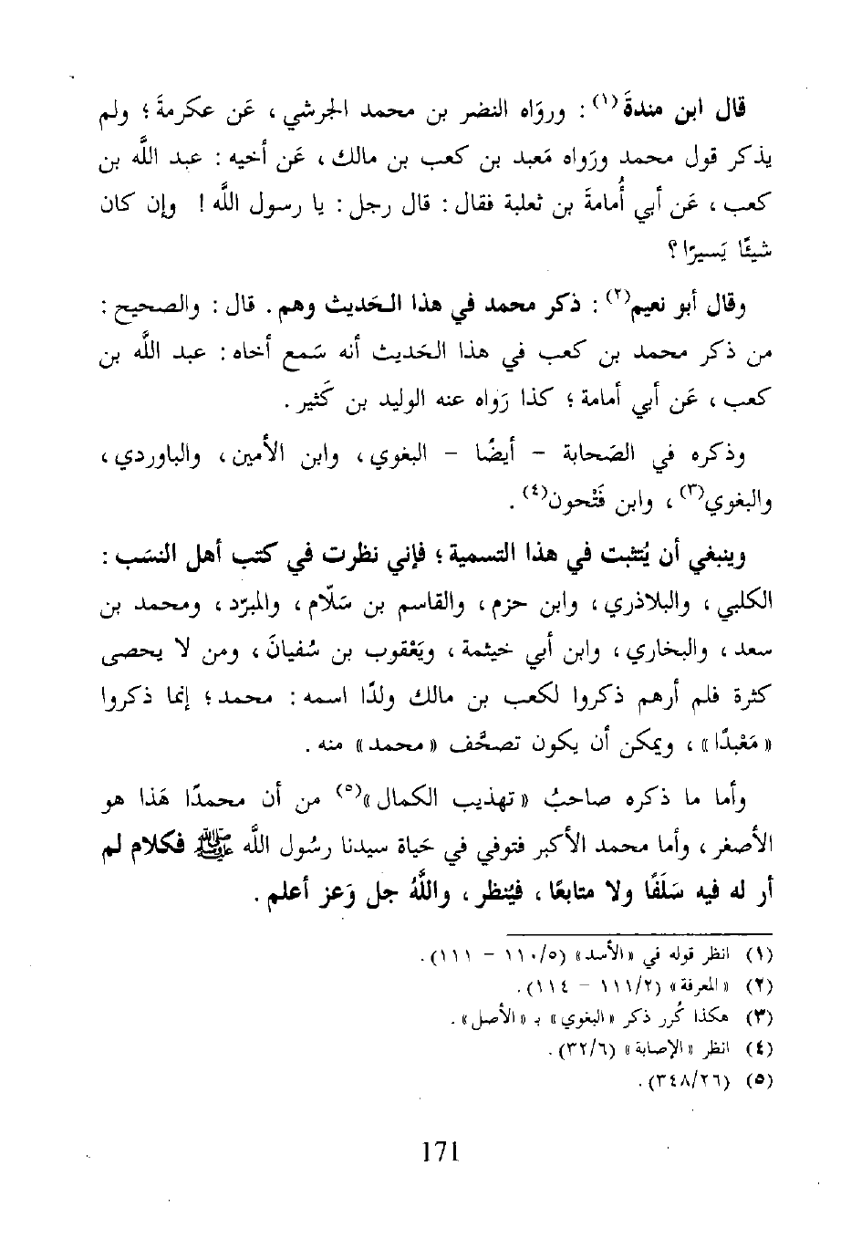 وينبغي أن يُتثبت في هذا التسمية، فإني نظرت في كتب أهل النسَب: الكلبي، والبلاذري، وابن حزم، والقاسم بن سَلّام، والمبرد، ومحمد بن سعد، والبخاري، وابن أبي خيثمة، ويَعْقوب بن سُفيانَ، ومن لا يحصى كثرة فلم أرهم ذكروا لكعب بن مالك ولدًا اسمه: محمد؛ إنما ذكروا "مَعْبدًا"، ويمكن أن يكون تصحَّف "محمد" منه.