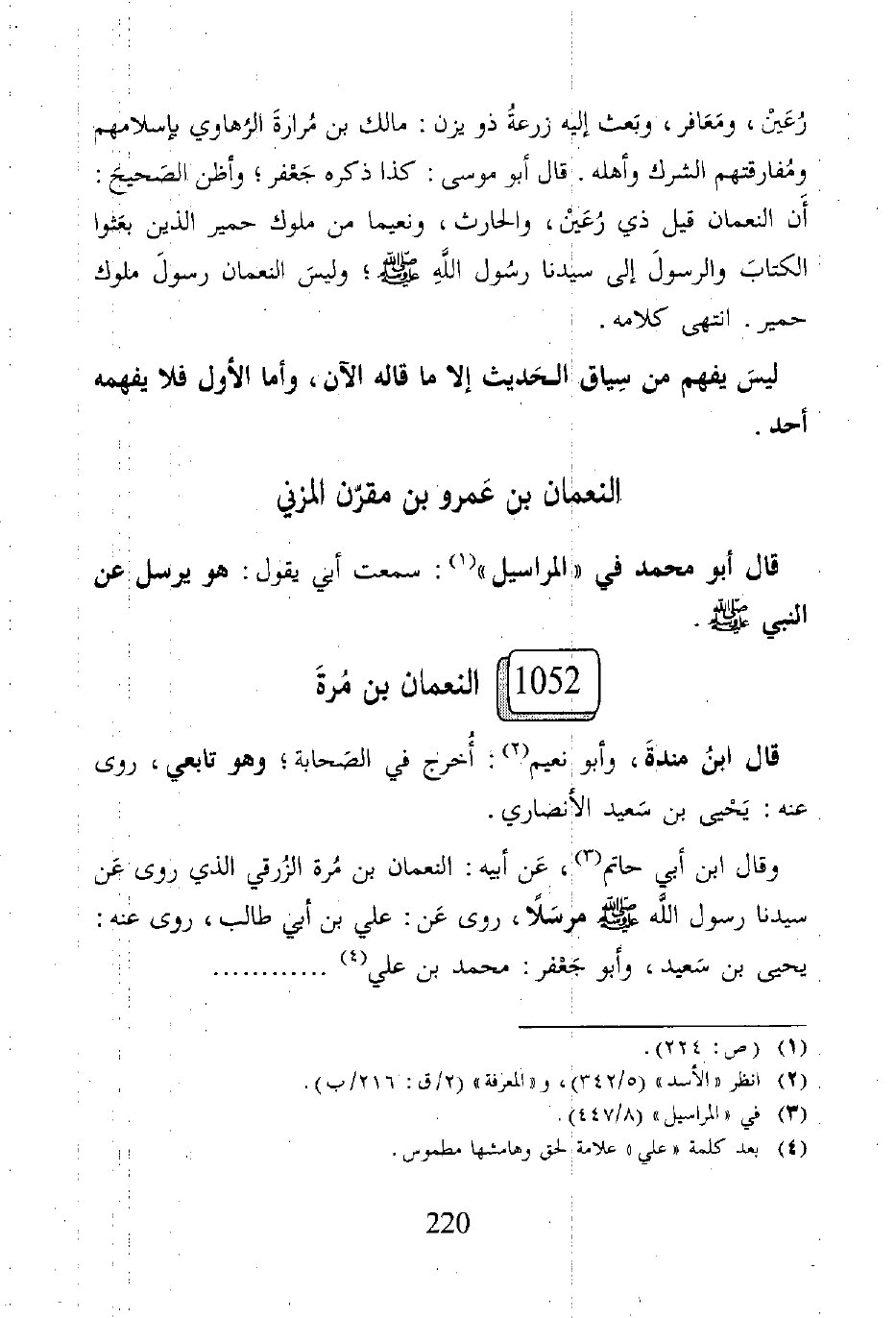 وقال ابن أبي حاتم (٣)، عَن أبيه: النعمان بن مُرة الزرقي الذي روى عَن سيدنا رسول الله - صلى الله عليه وسلم - مرسَلًا، روى عَن: علي بن أبي طالب، روى عنه: يحيى بن سَعيد، وأبو جَعْفر: محمد بن علي (٤). . . .