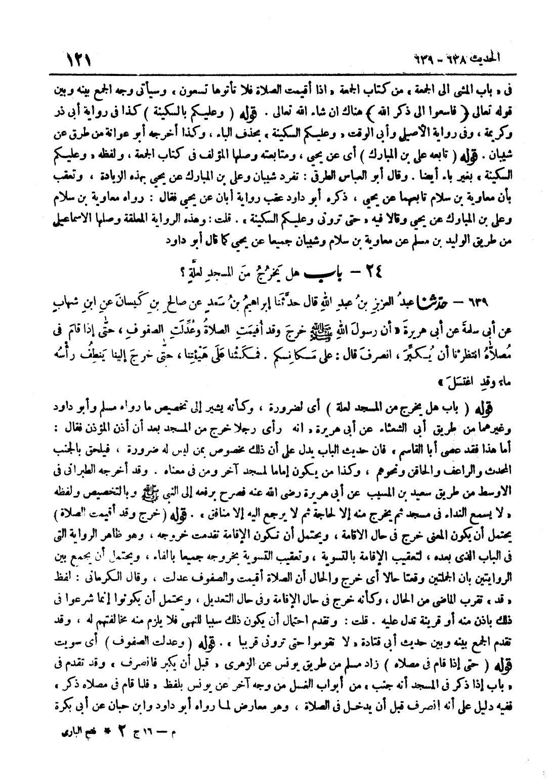 [638] قَوْلُهُ وَعَلَيْكُمْ بِالسَّكِينَةِ كَذَا فِي رِوَايَةِ أَبِي ذَرٍّ وَكَرِيمَةَ وَفِي رِوَايَةِ الْأَصِيلِيِّ وَأَبِي الْوَقْتِ وَعَلَيْكُمُ السَّكِينَةُ بِحَذْفِ الْبَاءِ وَكَذَا أَخْرَجَهُ أَبُو عَوَانَةَ مِنْ طُرُقٍ عَنْ شَيْبَانَ قَوْلُهُ تَابَعَهُ عَلِيُّ بْنُ الْمُبَارَكِ أَيْ عَنْ يَحْيَى وَمُتَابَعَتُهُ وَصَلَهَا الْمُؤَلِّفُ فِي كتاب الْجُمُعَة وَلَفظه وَعَلَيْكُم السَّكِينَةُ بِغَيْرِ بَاءٍ أَيْضًا وَقَالَ أَبُو الْعَبَّاسِ الطَّرْقِيُّ تَفَرَّدَ شَيْبَانُ وَعَلِيُّ بْنِ الْمُبَارَكِ عَنْ يَحْيَى بِهَذِهِ الزِّيَادَةِ وَتُعُقِّبَ بِأَنَّ مُعَاوِيَةَ بْنَ سَلَّامٍ تَابَعَهُمَا عَنْ يَحْيَى ذَكَرَهُ أَبُو دَاوُدَ عَقِبَ رِوَايَةِ أَبَانَ عَنْ يَحْيَى فَقَالَ رَوَاهُ مُعَاوِيَةُ بْنُ سَلَّامٍ وَعَلِيُّ بْنُ الْمُبَارَكِ عَنْ يَحْيَى وَقَالَا فِيهِ حَتَّى تَرَوْنِي وَعَلَيْكُمُ السَّكِينَةُ قُلْتُ وَهَذِهِ الرِّوَايَةُ الْمُعَلَّقَةُ وَصَلَهَا الْإِسْمَاعِيلِيُّ مِنْ طَرِيقِ الْوَلِيدِ بْنِ مُسْلِمٍ عَنْ مُعَاوِيَةَ بْنِ سَلَّامٍ وَشَيْبَانَ جَمِيعًا عَنْ يَحْيَى كَمَا قَالَ أَبُو دَاوُد