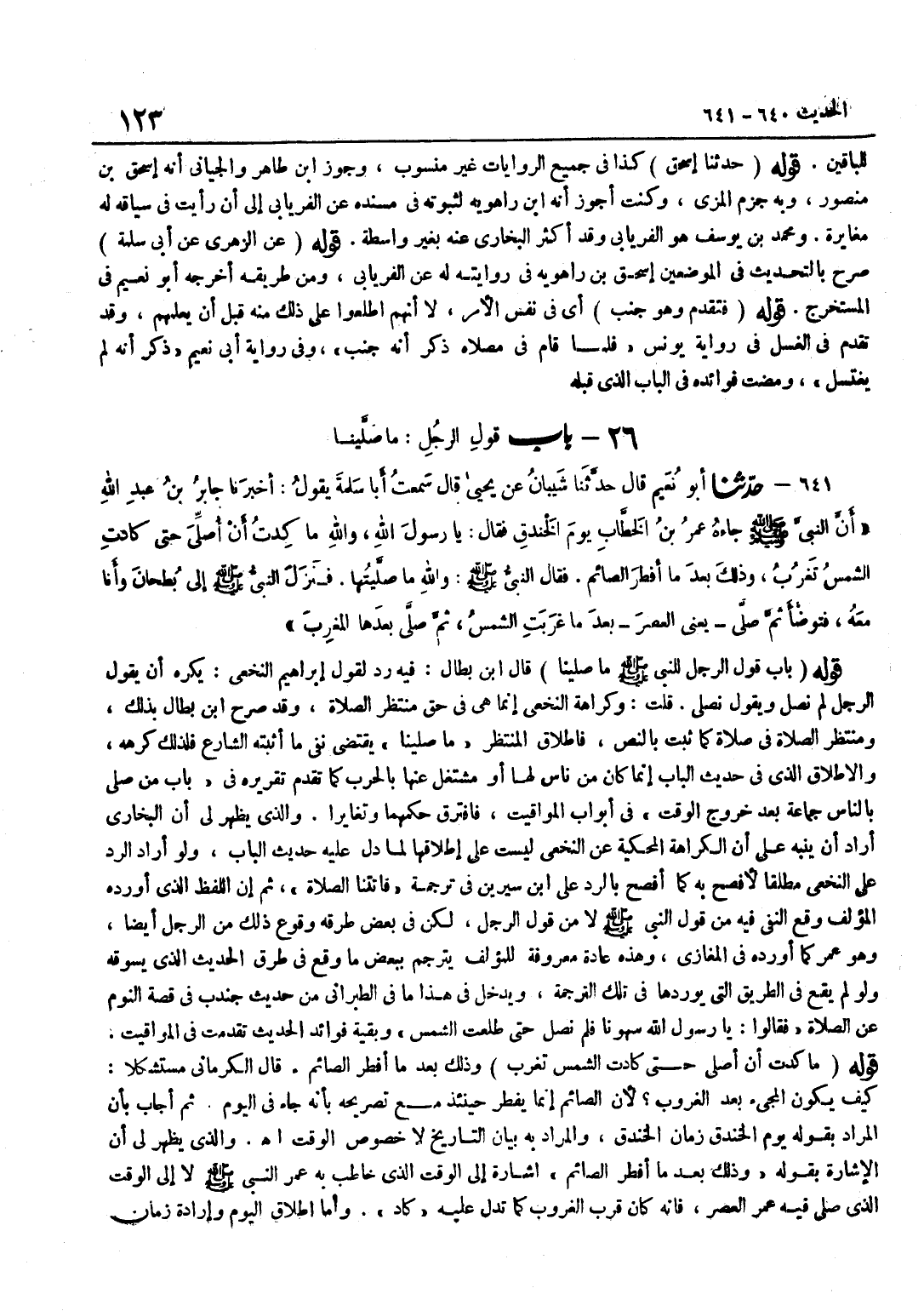[640] قَوْلُهُ حَدَّثَنَا إِسْحَاقُ كَذَا فِي جَمِيعِ الرِّوَايَات غير مَنْسُوب وَجوز بن طَاهِرٍ وَالْجَيَّانِيُّ أَنَّهُ إِسْحَاقُ بْنُ مَنْصُورٍ وَبِهِ جزم الْمزي وَكنت أجوز أَنه بن رَاهْوَيْهِ لِثُبُوتِهِ فِي مُسْنَدِهِ عَنِ الْفِرْيَابِيِّ إِلَى أَنْ رَأَيْتُ فِي سِيَاقِهِ لَهُ مُغَايِرَةً وَمُحَمَّدُ بْنُ يُوسُفَ هُوَ الْفِرْيَابِيُّ وَقَدْ أَكْثَرَ الْبُخَارِيُّ عَنْهُ بِغَيْرِ وَاسِطَةٍ قَوْلُهُ عَنِ الزُّهْرِيِّ عَنْ أَبِي سَلَمَةَ صَرَّحَ بِالتَّحْدِيثِ فِي الْمَوْضِعَيْنِ إِسْحَاقُ بْنُ رَاهْوَيْهِ فِي رِوَايَتِهِ لَهُ عَنِ الْفِرْيَابِيِّ وَمِنْ طَرِيقِهِ أَخْرَجَهُ أَبُو نُعَيْمٍ فِي الْمُسْتَخْرَجِ قَوْلُهُ فَتَقَدَّمَ وَهُوَ جُنُبٌ أَيْ فِي نَفْسِ الْأَمْرِ لَا أَنَّهُمُ اطَّلَعُوا عَلَى ذَلِكَ مِنْهُ قَبْلَ أَنْ يُعْلِمَهُمْ وَقَدْ تَقَدَّمَ فِي الْغُسْلِ فِي رِوَايَةِ يُونُسَ فَلَمَّا قَامَ فِي مُصَلَّاهُ ذَكَرَ أَنَّهُ جُنُبٌ وَفِي رِوَايَةِ أَبِي نُعَيْمٍ ذَكَرَ أَنَّهُ لَمْ يَغْتَسِلْ وَمَضَتْ فَوَائِدُهُ فِي الْبَاب الَّذِي قبله