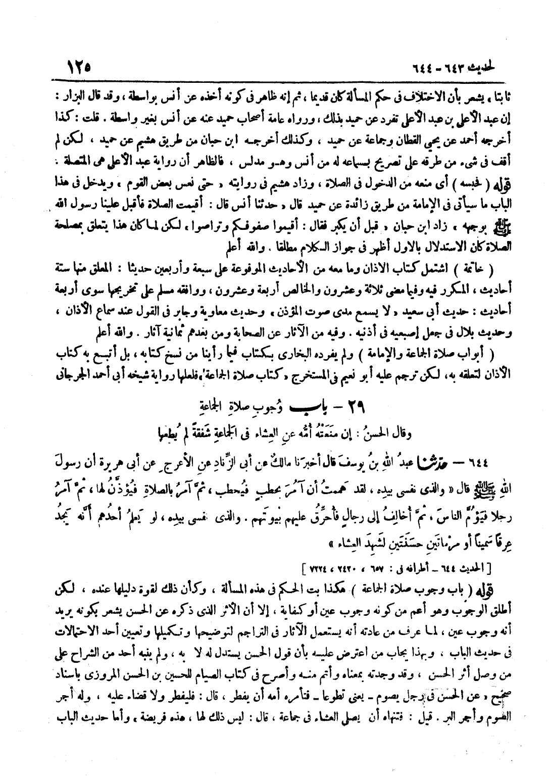 [643] قَوْلُهُ فَحَبَسَهُ أَيْ مَنَعَهُ مِنَ الدُّخُولِ فِي الصَّلَاةِ وَزَادَ هُشَيْمٌ فِي رِوَايَتِهِ حَتَّى نَعَسَ بَعْضُ الْقَوْمِ وَيَدْخُلُ فِي هَذَا الْبَابِ مَا سَيَأْتِي فِي الْإِمَامَةِ مِنْ طَرِيقِ زَائِدَةَ عَنْ حُمَيْدٍ قَالَ حَدَّثَنَا أَنَسٌ قَالَ أُقِيمَتِ الصَّلَاةُ فَأَقْبَلَ عَلَيْنَا رَسُولُ اللَّهِ صَلَّى اللَّهُ عَلَيْهِ وَسَلَّمَ بِوَجْهِهِ زَاد بن حِبَّانَ قَبْلَ أَنْ يُكَبِّرَ فَقَالَ أَقِيمُوا صُفُوفَكُمْ وَتَرَاصُّوا لَكِنْ لَمَّا كَانَ هَذَا يَتَعَلَّقُ بِمَصْلَحَةِ الصَّلَاةِ كَانَ الِاسْتِدْلَالُ بِالْأَوَّلِ أَظْهَرُ فِي جَوَازِ الْكَلَامِ مُطْلَقًا وَاللَّهُ أَعْلَمُ خَاتِمَةٌ اشْتَمَلَ كِتَابُ الْأَذَانِ وَمَا مَعَهُ مِنَ الْأَحَادِيثِ الْمَرْفُوعَةِ عَلَى سَبْعَةٍ وَأَرْبَعِينَ حَدِيثًا الْمُعَلَّقُ مِنْهَا سِتَّةُ أَحَادِيثَ الْمُكَرَّرُ فِيهِ وَفِيمَا مَضَى ثَلَاثَةٌ وَعِشْرُونَ وَالْخَالِصُ أَرْبَعَةٌ وَعِشْرُونَ وَوَافَقَهُ مُسْلِمٌ عَلَى تَخْرِيجِهَا سِوَى أَرْبَعَةِ أَحَادِيثَ حَدِيثِ أَبِي سَعِيدٍ لَا يَسْمَعُ مَدَى صَوْتِ الْمُؤَذِّنِ وَحَدِيثِ مُعَاوِيَةَ وَجَابِرٍ فِي الْقَوْلِ عِنْدَ سَمَاعِ الْأَذَانِ وَحَدِيثِ بِلَالٍ فِي جَعْلِ إِصْبَعَيْهِ فِي أُذُنَيْهِ وَفِيهِ مِنَ الْآثَارِ عَنِ الصَّحَابَةِ وَمَنْ بَعْدَهُمْ ثَمَانِيَةُ آثَارٍ وَاللَّهُ أعلم أَبْوَابُ صَلَاةِ الْجَمَاعَةِ وَالْإِمَامَةِ وَلَمْ يُفْرِدْهُ الْبُخَارِيُّ بِكِتَابٍ فِيمَا رَأَيْنَا مِنْ نُسَخِ كِتَابِهِ بَلْ أَتْبَعَ بِهِ كِتَابَ الْأَذَانِ لِتَعَلُّقِهِ بِهِ لَكِنْ تَرْجَمَ عَلَيْهِ أَبُو نُعَيْمٍ فِي الْمُسْتَخْرَجِ كِتَابُ صَلَاةِ الْجَمَاعَةِ فَلَعَلَّهَا رِوَايَةُ شَيْخِهِ أَبِي أَحْمَدَ الْجُرْجَانِيِّ