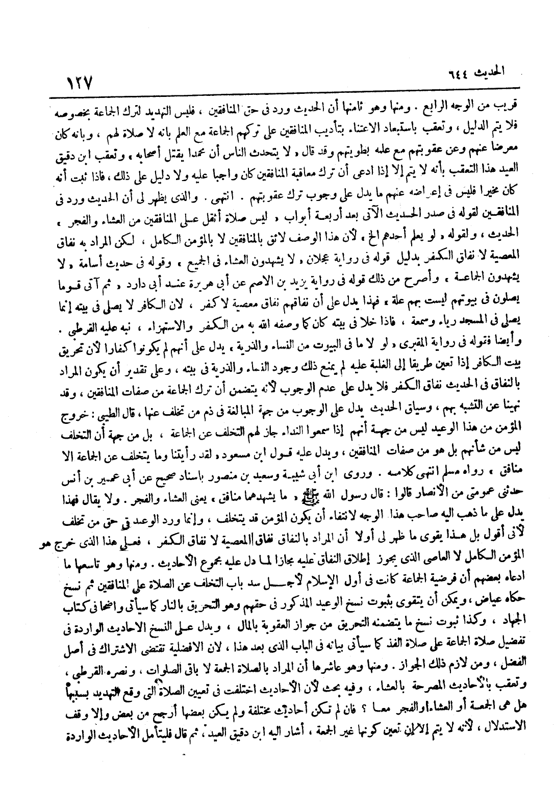 قَرِيبٌ مِنَ الْوَجْهِ الرَّابِعِ وَمِنْهَا وَهُوَ ثَامِنُهَا أَنَّ الْحَدِيثَ وَرَدَ فِي حَقِّ الْمُنَافِقِينَ فَلَيْسَ التَّهْدِيدُ لِتَرْكِ الْجَمَاعَةِ بِخُصُوصِهِ فَلَا يَتِمُّ الدَّلِيلُ وَتُعُقِّبَ بِاسْتِبْعَادِ الِاعْتِنَاءِ بِتَأْدِيبِ الْمُنَافِقِينَ عَلَى تَرْكِهِمُ الْجَمَاعَةَ مَعَ الْعِلْمِ بِأَنَّهُ لَا صَلَاةَ لَهُمْ وَبِأَنَّهُ كَانَ مُعْرِضًا عَنْهُمْ وَعَنْ عُقُوبَتِهِمْ مَعَ عِلْمِهِ بِطَوِيَّتِهِمْ وَقَدْ قَالَ لَا يَتَحَدَّثُ النَّاسُ أَنَّ مُحَمَّدًا يَقْتُلُ أَصْحَابَهُ وَتعقب بن دَقِيق الْعِيد هَذَا التعقب بِأَنَّهُ لَا يَتِمُّ إِلَّا إِذَا ادَّعَى أَنَّ تَرْكَ مُعَاقَبَةِ الْمُنَافِقِينَ كَانَ وَاجِبًا عَلَيْهِ وَلَا دَلِيلَ عَلَى ذَلِكَ فَإِذَا ثَبَتَ أَنَّهُ كَانَ مُخَيَّرًا فَلَيْسَ فِي إِعْرَاضِهِ عَنْهُمْ مَا يَدُلُّ عَلَى وُجُوبِ تَرْكِ عُقُوبَتِهِمْ انْتَهَى وَالَّذِي يَظْهَرُ لِي أَنَّ الْحَدِيثَ وَرَدَ فِي الْمُنَافِقِينَ لِقَوْلِهِ فِي صَدْرِ الْحَدِيثِ الْآتِي بَعْدَ أَرْبَعَةِ أَبْوَابٍ لَيْسَ صَلَاةٌ أَثْقَلَ عَلَى الْمُنَافِقِينَ مِنَ الْعِشَاءِ وَالْفَجْرِ الْحَدِيثَ وَلِقَوْلِهِ لَوْ يَعْلَمُ أَحَدُهُمْ إِلَخْ لِأَنَّ هَذَا الْوَصْفَ لَائِقٌ بِالْمُنَافِقِينَ لَا بِالْمُؤْمِنِ الْكَامِلِ لَكِنِ الْمُرَادُ بِهِ نِفَاقُ الْمَعْصِيَةِ لَا نِفَاقُ الْكُفْرِ بِدَلِيلِ قَوْلِهِ فِي رِوَايَةِ عَجْلَانَ لَا يَشْهَدُونَ الْعِشَاءَ فِي الْجَمِيعِ وَقَوْلِهِ فِي حَدِيثِ أُسَامَةَ لَا يَشْهَدُونَ الْجَمَاعَةَ وَأَصْرَحُ مِنْ ذَلِكَ قَوْلُهُ فِي رِوَايَةِ يَزِيدَ بْنِ الْأَصَمِّ عَنْ أَبِي هُرَيْرَةَ عِنْدَ أَبِي دَاوُدَ ثُمَّ آتِي قَوْمًا يُصَلُّونَ فِي بُيُوتِهِمْ لَيْسَتْ بِهِمْ عِلَّةٌ فَهَذَا يَدُلُّ عَلَى أَنَّ نِفَاقَهُمْ نِفَاقُ مَعْصِيَةٍ لَا كُفْرٍ لِأَنَّ الْكَافِرَ لَا يُصَلِّي فِي بَيْتِهِ إِنَّمَا يُصَلِّي فِي الْمَسْجِدِ رِيَاءً وَسُمْعَةً فَإِذَا خَلَا فِي بَيْتِهِ كَانَ كَمَا وَصَفَهُ اللَّهُ بِهِ مِنَ الْكُفْرِ وَالِاسْتِهْزَاءِ نَبَّهَ عَلَيْهِ الْقُرْطُبِيُّ وَأَيْضًا فَقَوْلُهُ فِي رِوَايَةِ الْمَقْبُرِيِّ لَوْلَا مَا فِي الْبُيُوتِ مِنَ النِّسَاءِ وَالذُّرِّيَّةِ يَدُلُّ عَلَى أَنَّهُمْ لَمْ يَكُونُوا كُفَّارًا لِأَنَّ تَحْرِيقَ بَيْتِ الْكَافِرِ إِذَا تَعَيَّنَ طَرِيقًا إِلَى الْغَلَبَةِ عَلَيْهِ لَمْ يَمْنَعْ ذَلِكَ وُجُودُ النِّسَاءِ وَالذُّرِّيَّةِ فِي بَيْتِهِ وَعَلَى تَقْدِيرِ أَنْ يَكُونَ الْمُرَادُ بِالنِّفَاقِ فِي الْحَدِيثِ نِفَاقَ الْكُفْرِ فَلَا يدل على عدم الْوُجُوب لِأَنَّهُ يتَضَمَّن أَن ترك الْجَمَاعَة من صِفَات الْمُنَافِقين وَقد نهينَا عَن التَّشَبُّه بهم وَسِيَاق الحَدِيث يَدُلُّ عَلَى الْوُجُوبِ مِنْ جِهَةِ الْمُبَالَغَةِ فِي ذَمِّ مَنْ تَخَلَّفَ عَنْهَا قَالَ الطِّيبِيُّ خُرُوجُ الْمُؤْمِنِ مِنْ هَذَا الْوَعِيدِ لَيْسَ مِنْ جِهَةِ أَنَّهُمْ إِذَا سَمِعُوا النِّدَاءَ جَازَ لَهُمُ التَّخَلُّفُ عَنِ الْجَمَاعَةِ بَلْ مِنْ جِهَةِ أَنَّ التَّخَلُّفَ لَيْسَ مِنْ شَأْنِهِمْ بَلْ هُوَ مِنْ صِفَاتِ الْمُنَافِقين وَيدل عَلَيْهِ قَول بن مَسْعُودٍ لَقَدْ رَأَيْتُنَا وَمَا يَتَخَلَّفُ عَنِ الْجَمَاعَةِ إِلَّا مُنَافِقٌ رَوَاهُ مُسْلِمٌ انْتَهَى كَلَامُهُ وَرَوَى بن أَبِي شَيْبَةَ وَسَعِيدُ بْنُ مَنْصُورٍ بِإِسْنَادٍ صَحِيحٍ عَنْ أَبِي عُمَيْرِ بْنِ أَنَسٍ حَدَّثَنِي عُمُومَتِي مِنَ الْأَنْصَارِ قَالُوا قَالَ رَسُولُ اللَّهِ صَلَّى اللَّهُ عَلَيْهِ وَسَلَّمَ مَا يَشْهَدُهُمَا مُنَافِقٌ يَعْنِي الْعِشَاءَ وَالْفَجْرَ وَلَا يُقَالُ فَهَذَا يَدُلُّ عَلَى مَا ذَهَبَ إِلَيْهِ صَا