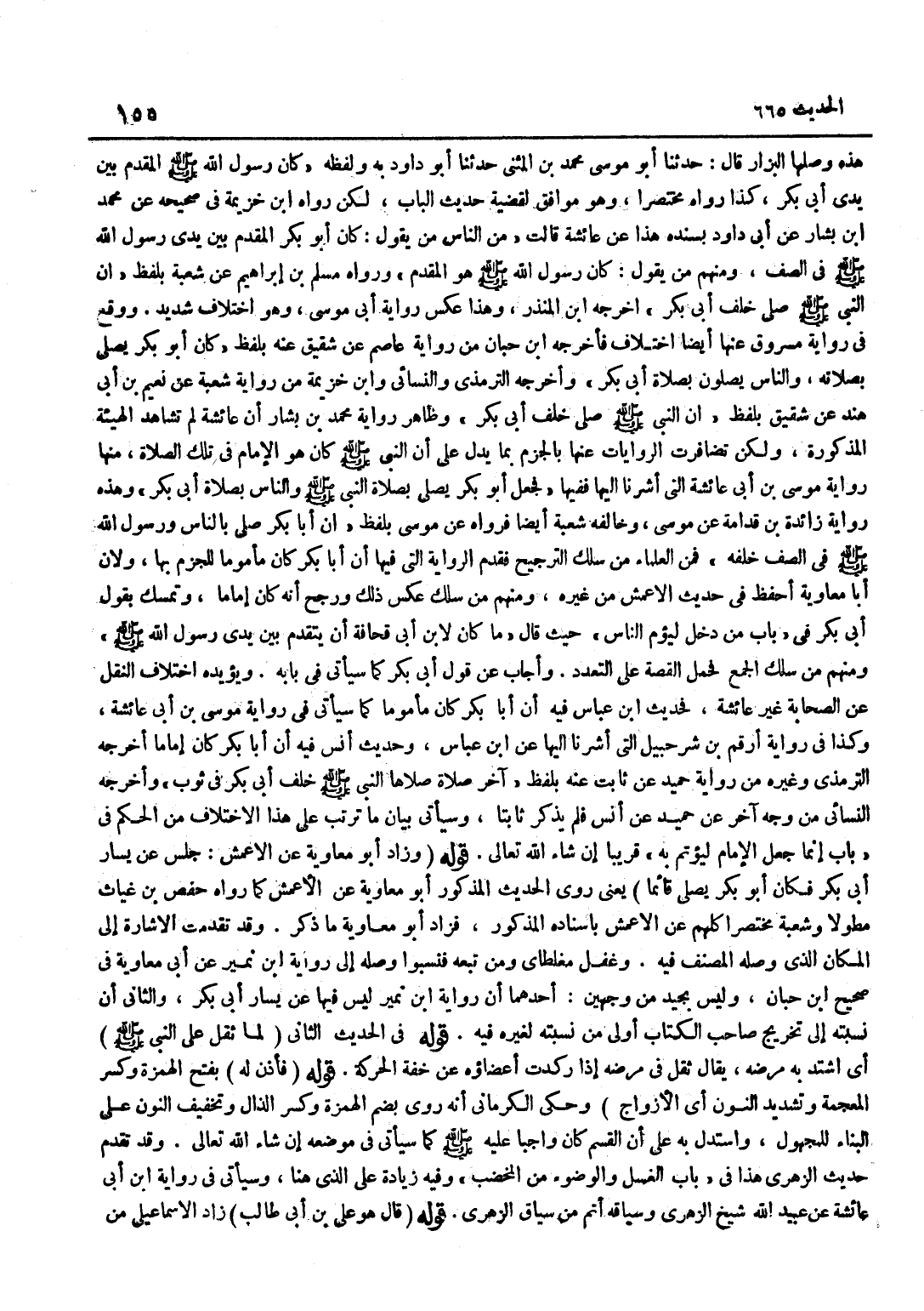هَذِهِ وَصَلَهَا الْبَزَّارُ قَالَ حَدَّثَنَا أَبُو مُوسَى مُحَمَّدُ بْنُ الْمُثَنَّى حَدَّثَنَا أَبُو دَاوُدَ بِهِ وَلَفْظُهُ كَانَ رَسُولُ اللَّهِ صَلَّى اللَّهُ عَلَيْهِ وَسَلَّمَ الْمُقَدَّمُ بَيْنَ يَدَيْ أَبِي بَكْرٍ كَذَا رَوَاهُ مُخْتَصَرًا وَهُوَ مُوَافِقٌ لِقَضِيَّةِ حَدِيثِ الْبَابِ لَكِن رَوَاهُ بن خُزَيْمَةَ فِي صَحِيحِهِ عَنْ مُحَمَّدِ بْنِ بَشَّارٍ عَنْ أَبِي دَاوُدَ بِسَنَدِهِ هَذَا عَنْ عَائِشَةَ قَالَتْ مِنَ النَّاسِ مَنْ يَقُولُ كَانَ أَبُو بَكْرٍ الْمُقَدَّمُ بَيْنَ يَدَيْ رَسُولِ اللَّهِ صَلَّى اللَّهُ عَلَيْهِ وَسَلَّمَ فىالصف وَمِنْهُمْ مَنْ يَقُولُ كَانَ رَسُولُ اللَّهِ صَلَّى اللَّهُ عَلَيْهِ وَسَلَّمَ هُوَ الْمُقَدَّمُ وَرَوَاهُ مُسْلِمُ بْنُ إِبْرَاهِيمَ عَنْ شُعْبَةَ بِلَفْظِ أَنَّ النَّبِيَّ صَلَّى اللَّهُ عَلَيْهِ وَسَلَّمَ صَلَّى خَلْفَ أَبِي بكر أخرجه بن الْمُنْذِرِ وَهَذَا عَكْسُ رِوَايَةِ أَبِي مُوسَى وَهُوَ اخْتِلَافٌ شَدِيدٌ وَوَقَعَ فِي رِوَايَةِ مَسْرُوقٍ عَنْهَا أَيْضا اخْتِلَاف فَأخْرجهُ بن حِبَّانَ مِنْ رِوَايَةِ عَاصِمٍ عَنْ شَقِيقٍ عَنْهُ بِلَفْظِ كَانَ أَبُو بَكْرٍ يُصَلِّي بِصَلَاتِهِ وَالنَّاسُ يُصَلُّونَ بِصَلَاةِ أَبِي بَكْرٍ وَأَخْرَجَهُ التِّرْمِذِيُّ وَالنَّسَائِيُّ وبن خُزَيْمَةَ مِنْ رِوَايَةِ شُعْبَةَ عَنْ نُعَيْمِ بْنِ أَبِي هِنْدٍ عَنْ شَقِيقٍ بِلَفْظِ أَنَّ النَّبِيَّ صَلَّى اللَّهُ عَلَيْهِ وَسَلَّمَ صَلَّى خَلْفَ أَبِي بَكْرٍ وَظَاهِرُ رِوَايَةِ مُحَمَّدِ بْنِ بَشَّارٍ أَنَّ عَائِشَةَ لَمْ تُشَاهِدِ الْهَيْئَةَ الْمَذْكُورَةَ وَلَكِنْ تَضَافَرَتِ الرِّوَايَاتُ عَنْهَا بِالْجَزْمِ بِمَا يَدُلُّ عَلَى أَنَّ النَّبِيَّ صَلَّى اللَّهُ عَلَيْهِ وَسَلَّمَ كَانَ هُوَ الْإِمَامُ فِي تِلْكَ الصَّلَاةِ مِنْهَا رِوَايَةُ مُوسَى بن أَبِي عَائِشَةَ الَّتِي أَشَرْنَا إِلَيْهَا فَفِيهَا فَجَعَلَ أَبُو بَكْرٍ يُصَلِّي بِصَلَاةِ النَّبِيِّ صَلَّى اللَّهُ عَلَيْهِ وَسَلَّمَ وَالنَّاسُ بِصَلَاةِ أَبِي بَكْرٍ وَهَذِهِ رِوَايَةُ زَائِدَةَ بْنِ قُدَامَةَ عَنْ مُوسَى وَخَالَفَهُ شُعْبَةُ أَيْضًا فَرَوَاهُ عَنْ مُوسَى بِلَفْظِ أَنَّ أَبَا بَكْرٍ صَلَّى بِالنَّاسِ وَرَسُولُ اللَّهِ صَلَّى اللَّهُ عَلَيْهِ وَسَلَّمَ فِي الصَّفِّ خَلْفَهُ فَمِنَ الْعُلَمَاءِ مَنْ سَلَكَ التَّرْجِيحَ فَقَدَّمَ الرِّوَايَةَ الَّتِي فِيهَا أَنَّ أَبَا بَكْرٍ كَانَ مَأْمُومًا لِلْجَزْمِ بِهَا وَلِأَنَّ أَبَا مُعَاوِيَةَ أَحْفَظُ فِي حَدِيثِ الْأَعْمَشِ مِنْ غَيْرِهِ وَمِنْهُمْ مَنْ سَلَكَ عَكْسَ ذَلِكَ وَرَجَّحَ أَنَّهُ كَانَ إِمَامًا وَتَمَسَّكَ بِقَوْلِ أَبِي بَكْرٍ فِي بَابِ مَنْ دَخَلَ لِيَؤُمَّ النَّاسَ حَيْثُ قَالَ مَا كَانَ لِابْنِ أَبِي قُحَافَةَ أَنْ يَتَقَدَّمَ بَيْنَ يَدَيْ رَسُولِ اللَّهِ صَلَّى اللَّهُ عَلَيْهِ وَسَلَّمَ وَمِنْهُمْ مَنْ سَلَكَ الْجَمْعَ فَحَمَلَ الْقِصَّةَ عَلَى التَّعَدُّدِ وَأَجَابَ عَنْ قَوْلِ أَبِي بَكْرٍ كَمَا سَيَأْتِي فِي بَابِهِ وَيُؤَيِّدُهُ اخْتِلَافُ النَّقْلِ عَنِ الصَّحَابَةِ غَيْرِ عَائِشَةَ فَحَدِيث بن عَبَّاسٍ فِيهِ أَنَّ أَبَا بَكْرٍ كَانَ مَأْمُومًا كَمَا سَيَأْتِي فِي رِوَايَةِ مُوسَى بْنِ أَبِي عَائِشَةَ وَكَذَا فِي رِوَايَةِ أَرْقَمَ بْنِ شُرَحْبِيلَ الَّتِي أَشَرنَا إِلَيْهَا عَن بن عَبَّاسٍ وَحَدِيثِ أَنَسٍ فِيهِ أَنَّ أَبَا بَكْرٍ كَانَ إِمَامًا أَخْرَجَهُ التِّرْمِذِيُّ وَغَيْرُهُ مِنْ رِوَايَةِ حُمَيْدٍ عَنْ ثَابِتٍ عَنْهُ بِلَفْظِ آخِرُ صَلَاةٍ صَلَّاهَا النَّبِيُّ صَلَّى اللَّهُ عَلَيْهِ وَسَلَّمَ خَلْفَ أَبِي بَكْرٍ فِي ثَوْبٍ وَأَخْرَجَهُ النَّسَائِيُّ مِنْ وَجْهٍ آخَرَ 