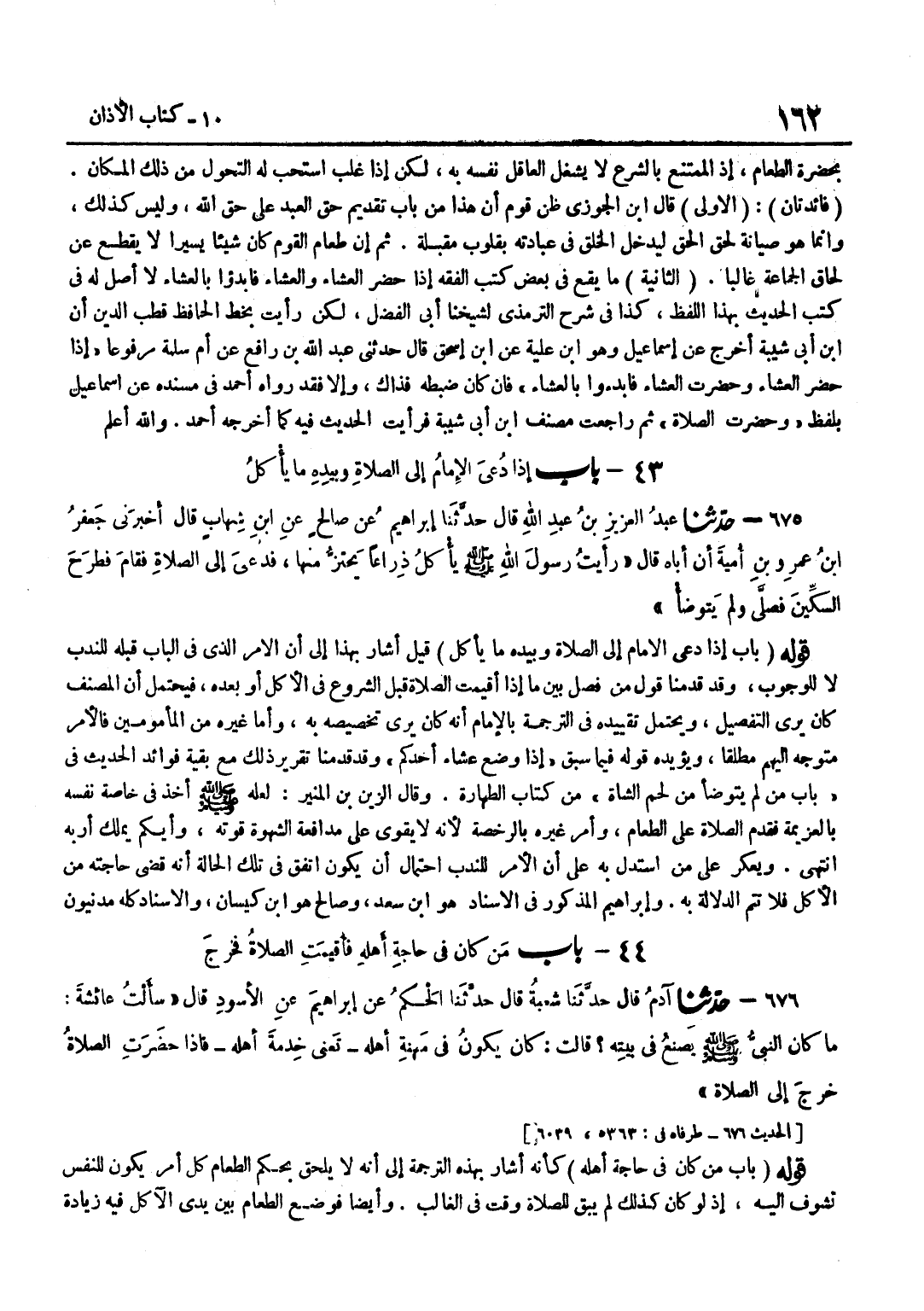 قِيلَ أَشَارَ بِهَذَا إِلَى أَنَّ الْأَمْرَ الَّذِي فِي الْبَابِ قَبْلَهُ لِلنَّدْبِ لَا لِلْوُجُوبِ وَقَدْ قَدَّمْنَا قَوْلَ مَنْ فَصَلَ بَيْنَ مَا إِذَا أُقِيمَتِ الصَّلَاةُ قَبْلَ الشُّرُوعِ فِي الْأَكْلِ أَوْ بَعْدَهُ فَيُحْتَمَلُ أَنَّ الْمُصَنِّفَ كَانَ يَرَى التَّفْصِيلَ وَيُحْتَمَلُ تَقْيِيدُهُ فِي التَّرْجَمَةِ بِالْإِمَامِ أَنَّهُ كَانَ يَرَى تَخْصِيصَهُ بِهِ وَأَمَّا غَيْرُهُ مِنَ الْمَأْمُومِينَ فَالْأَمْرُ مُتَوَجِّهٌ إِلَيْهِمْ مُطْلَقًا وَيُؤَيِّدُهُ قَوْلُهُ فِيمَا سَبَقَ إِذَا وُضِعَ عَشَاءُ أَحَدِكُمْ وَقَدْ قَدَّمْنَا تَقْرِيرَ ذَلِكَ مَعَ بَقِيَّةِ فَوَائِدِ الْحَدِيثِ فِي بَابِ مَنْ لَمْ يَتَوَضَّأْ مِنْ لَحْمِ الشَّاةِ مِنْ كِتَابِ الطَّهَارَةِ وَقَالَ الزَّيْنُ بْنُ الْمُنِيرِ لَعَلَّهُ صَلَّى اللَّهُ عَلَيْهِ وَسَلَّمَ أَخَذَ فِي خَاصَّةِ نَفْسِهِ بِالْعَزِيمَةِ فَقَدَّمَ الصَّلَاةَ عَلَى الطَّعَامِ وَأَمَرَ غَيْرَهُ بِالرُّخْصَةِ لِأَنَّهُ لَا يَقْوَى عَلَى مُدَافَعَةِ الشَّهْوَةِ قُوَّتُهُ وَأَيُّكُمْ يَمْلِكُ إِرْبَهُ انْتَهَى وَيُعَكِّرُ عَلَى مَنِ اسْتَدَلَّ بِهِ عَلَى أَنَّ الْأَمْرَ لِلنَّدْبِ احْتِمَالُ أَنْ يَكُونَ اتُّفِقَ فِي تِلْكَ الْحَالَةِ أَنَّهُ قَضَى حَاجته من الْأكل فَلَا تتمّ الدَّلَالَةُ بِهِ وَإِبْرَاهِيمُ الْمَذْكُورُ فِي الْإِسْنَادِ هُوَ بن سعد وَصَالح هُوَ بن كيسَان والإسناد كُله مدنيون قَوْلُهُ بَابُ مَنْ كَانَ فِي حَاجَةِ أَهْلِهِ كَأَنَّهُ أَشَارَ بِهَذِهِ التَّرْجَمَةِ إِلَى أَنَّهُ لَا يَلْحَقُ بِحُكْمِ الطَّعَامِ كُلُّ أَمْرٍ يَكُونُ لِلنَّفْسِ تَشَوُّفٌ إِلَيْهِ إِذْ لَوْ كَانَ كَذَلِكَ لَمْ يَبْقَ لِلصَّلَاةِ وَقْتٌ فِي الْغَالِبِ وَأَيْضًا فَوَضْعُ الطَّعَامِ بَيْنَ يَدَيِ الْآكِلِ فِيهِ زِيَادَةُ