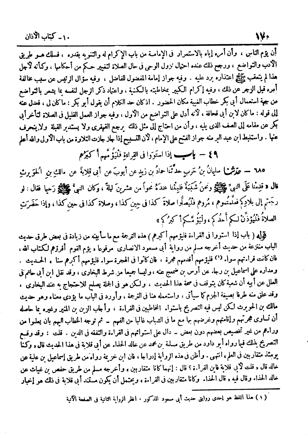 هَذِهِ التَّرْجَمَةُ مَعَ مَا سَأُبَيِّنُهُ مِنْ زِيَادَةٍ فِي بَعْضِ طُرُقِ حَدِيثِ الْبَابِ مُنْتَزَعَةٌ مِنْ حَدِيثٍ أَخْرَجَهُ مُسْلِمٌ مِنْ رِوَايَةِ أَبِي مَسْعُودٍ الْأَنْصَارِيِّ مَرْفُوعًا يَؤُمُّ الْقَوْمَ أَقْرَؤُهُمْ لِكِتَابِ اللَّهِ فَإِنْ كَانَتْ قِرَاءَتُهُمْ سَوَاءً فَلْيَؤُمَّهُمْ أَقْدَمُهُمْ هِجْرَةً فَإِنْ كَانُوا فِي الْهِجْرَةِ سَوَاءً فَلْيَؤُمَّهُمْ أَكْبَرُهُمْ سِنًّا الْحَدِيثَ وَمَدَارُهُ عَلَى إِسْمَاعِيلَ بْنِ رَجَاءٍ عَنْ أَوْسِ بْنِ ضَمْعَجٍ عَنْهُ وَلَيْسَا جَمِيعًا من شَرط البُخَارِيّ وَقد نقل بن أَبِي حَاتِمٍ فِي الْعِلَلِ عَنْ أَبِيهِ أَنَّ شُعْبَةَ كَانَ يَتَوَقَّفُ فِي صِحَّةِ هَذَا الْحَدِيثِ وَلَكِنْ هُوَ فِي الْجُمْلَةِ يَصْلُحُ لِلِاحْتِجَاجِ بِهِ عِنْدَ الْبُخَارِيِّ وَقَدْ عَلَّقَ مِنْهُ طَرَفًا بِصِيغَةِ الْجَزْمِ كَمَا سَيَأْتِي وَاسْتَعْمَلَهُ هُنَا فِي التَّرْجَمَةِ وَأَوْرَدَ فِي الْبَابِ مَا يُؤَدِّي مَعْنَاهُ وَهُوَ حَدِيثُ مَالِكِ بْنِ الْحُوَيْرِثِ لَكِنْ لَيْسَ فِيهِ التَّصْرِيحُ بِاسْتِوَاءِ الْمُخَاطَبِينَ فِي الْقِرَاءَةِ وَأَجَابَ الزَّيْنُ بْنُ الْمُنِيرِ وَغَيْرُهُ بِمَا حَاصِلُهُ أَنَّ تَسَاوِيَ هِجْرَتِهِمْ وَإِقَامَتِهِمْ وَغَرَضِهِمْ بِهَا مَعَ مَا فِي الشَّبَابِ غَالِبًا مِنَ الْفَهْمِ ثُمَّ تَوَجُّهُ الْخِطَابِ إِلَيْهِمْ بِأَنْ يَعْلَمُوا مَنْ وَرَاءَهُمْ مِنْ غَيْرِ تَخْصِيصِ بَعْضِهِمْ دُونَ بَعْضٍ دَالٌّ عَلَى اسْتِوَائِهِمْ فِي الْقِرَاءَةِ وَالتَّفَقُّهِ فِي الدِّينِ قُلْتُ وَقَدْ وَقَعَ التَّصْرِيحُ بِذَلِكَ فِيمَا رَوَاهُ أَبُو دَاوُدَ مِنْ طَرِيقِ مَسْلَمَةَ بْنِ مُحَمَّدٍ عَنْ خَالِدٍ الْحَذَّاءِ عَنْ أَبِي قِلَابَةَ فِي هَذَا الْحَدِيثِ قَالَ وَكُنَّا يَوْمَئِذٍ مُتَقَارِبِينَ فِي الْعِلْمِ انْتَهَى وأظن فىهذه الرِّوَايَة إدراجا فَإِن بن خُزَيْمَةَ رَوَاهُ مِنْ طَرِيقِ إِسْمَاعِيلَ بْنِ عُلَيَّةَ عَنْ خَالِدٍ قَالَ قُلْتُ لِأَبِي قِلَابَةَ فَأَيْنَ الْقِرَاءَةُ قَالَ إِنَّهُمَا كَانَا مُتَقَارِبَيْنِ وَأَخْرَجَهُ مُسْلِمٌ مِنْ طَرِيقِ حَفْصِ بْنِ غِيَاثٍ عَنْ خَالِدٍ الْحَذَّاءِ وَقَالَ فِيهِ قَالَ الْحَذَّاءُ وَكَانَا مُتَقَارِبَيْنِ فِي الْقِرَاءَةِ وَيُحْتَمَلُ أَنْ يَكُونَ مُسْتَنَدَ أَبِي قِلَابَةَ فِي ذَلِكَ هُوَ إِخْبَارُ