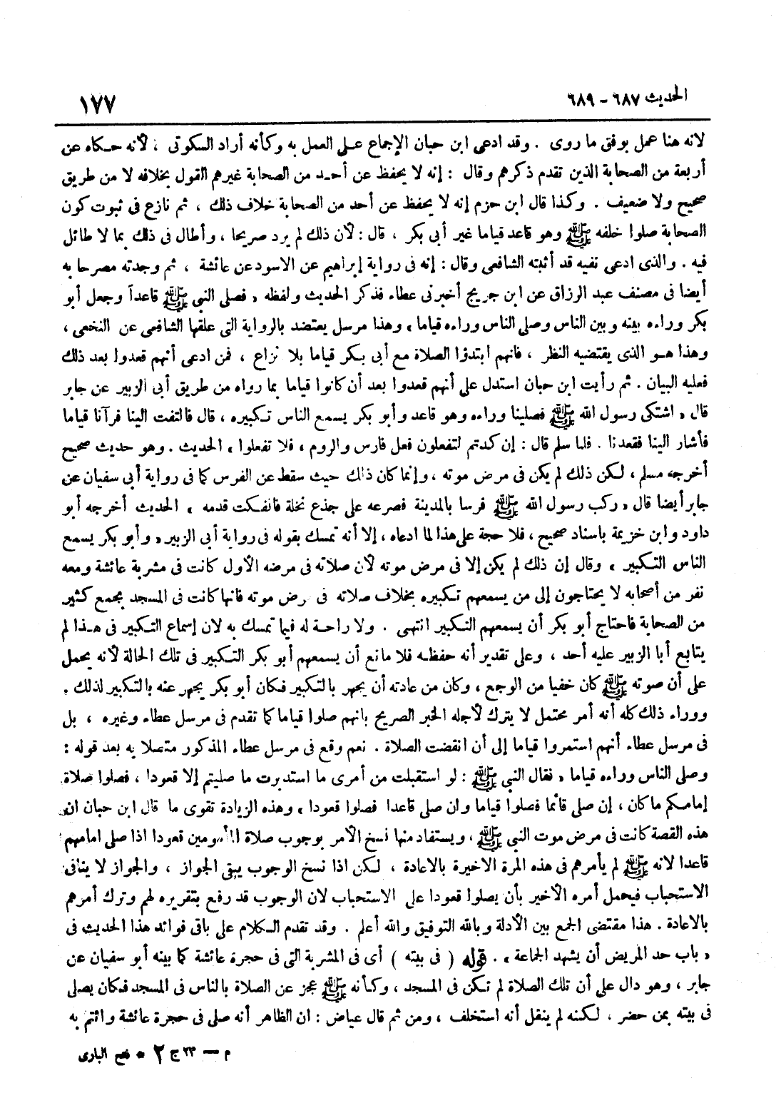 لِأَنَّهُ هُنَا عَمِلَ بِوَفْقِ مَا رَوَى وَقَدِ ادّعى بن حِبَّانَ الْإِجْمَاعَ عَلَى الْعَمَلِ بِهِ وَكَأَنَّهُ أَرَادَ السكوتى لِأَنَّهُ حَكَاهُ عَنْ أَرْبَعَةٍ مِنَ الصَّحَابَةِ الَّذِينَ تَقَدَّمَ ذِكْرُهُمْ وَقَالَ إِنَّهُ لَا يُحْفَظُ عَنْ أَحَدٍ مِنَ الصَّحَابَةِ غَيْرِهِمُ الْقَوْلَ بِخِلَافِهِ لَا مِنْ طَرِيقٍ صَحِيحٍ وَلَا ضَعِيفٍ وَكَذَا قَالَ بن حَزْمٍ إِنَّهُ لَا يُحْفَظُ عَنْ أَحَدٍ مِنَ الصَّحَابَةِ خِلَافَ ذَلِكَ ثُمَّ نَازَعَ فِي ثُبُوتِ كَوْنِ الصَّحَابَةِ صَلَّوْا خَلْفَهُ صَلَّى اللَّهُ عَلَيْهِ وَسَلَّمَ وَهُوَ قَاعِدٌ قِيَامًا غَيْرَ أَبِي بَكْرٍ قَالَ لِأَنَّ ذَلِكَ لَمْ يَرِدْ صَرِيحًا وَأَطَالَ فِي ذَلِكَ بِمَا لَا طَائِلَ فِيهِ وَالَّذِي ادَّعَى نَفْيَهُ قَدْ أَثْبَتَهُ الشَّافِعِيُّ وَقَالَ إِنَّهُ فِي رِوَايَةِ إِبْرَاهِيمَ عَنِ الْأَسْوَدِ عَنْ عَائِشَةَ ثُمَّ وَجَدْتُهُ مُصَرَّحًا بِهِ أَيْضًا فِي مُصَنَّفِ عبد الرَّزَّاق عَن بن جُرَيْجٍ أَخْبَرَنِي عَطَاءٌ فَذَكَرَ الْحَدِيثَ وَلَفْظُهُ فَصَلَّى النَّبِيُّ صَلَّى اللَّهُ عَلَيْهِ وَسَلَّمَ قَاعِدًا وَجَعَلَ أَبُو بَكْرٍ وَرَاءَهُ بَيْنَهُ وَبَيْنَ النَّاسِ وَصَلَّى النَّاسُ وَرَاءَهُ قِيَامًا وَهَذَا مُرْسَلٌ يَعْتَضِدُ بِالرِّوَايَةِ الَّتِي عَلَّقَهَا الشَّافِعِيُّ عَنِ النَّخَعِيِّ وَهَذَا هُوَ الَّذِي يَقْتَضِيهِ النّظر فَإِنَّهُم ابتدؤا الصَّلَاةَ مَعَ أَبِي بَكْرٍ قِيَامًا بِلَا نِزَاعٍ فَمَنِ ادَّعَى أَنَّهُمْ قَعَدُوا بَعْدَ ذَلِكَ فَعَلَيْهِ الْبَيَان ثمَّ رَأَيْت بن حِبَّانَ اسْتَدَلَّ عَلَى أَنَّهُمْ قَعَدُوا بَعْدَ أَنْ كَانُوا قِيَامًا بِمَا رَوَاهُ مِنْ طَرِيقِ أَبِي الزُّبَيْرِ عَنْ جَابِرٍ قَالَ اشْتَكَى رَسُولُ اللَّهِ صَلَّى اللَّهُ عَلَيْهِ وَسَلَّمَ فَصَلَّيْنَا وَرَاءَهُ وَهُوَ قَاعِدٌ وَأَبُو بَكْرٍ يُسْمِعُ النَّاسَ تَكْبِيرَهُ قَالَ فَالْتَفَتَ إِلَيْنَا فَرَآنَا قِيَامًا فَأَشَارَ إِلَيْنَا فَقَعَدْنَا فَلَمَّا سَلَّمَ قَالَ إِنْ كِدْتُمْ لَتَفْعَلُونَ فِعْلَ فَارِسَ وَالرُّومِ فَلَا تَفْعَلُوا الْحَدِيثَ وَهُوَ حَدِيثٌ صَحِيحٌ أَخْرَجَهُ مُسْلِمٌ لَكِنَّ ذَلِكَ لَمْ يَكُنْ فِي مَرَضِ مَوْتِهِ وَإِنَّمَا كَانَ ذَلِكَ حَيْثُ سَقَطَ عَنِ الْفَرَسِ كَمَا فِي رِوَايَةِ أَبِي سُفْيَانَ عَنْ جَابِرٍ أَيْضًا قَالَ رَكِبَ رَسُولُ اللَّهِ صَلَّى اللَّهُ عَلَيْهِ وَسَلَّمَ فَرَسًا بِالْمَدِينَةِ فَصَرَعَهُ عَلَى جِذْعِ نَخْلَةٍ فَانْفَكَّتْ قَدَمُهُ الْحَدِيثُ أخرجه أَبُو دَاوُد وبن خُزَيْمَةَ بِإِسْنَادٍ صَحِيحٍ فَلَا حُجَّةَ عَلَى هَذَا لِمَا ادَّعَاهُ إِلَّا أَنَّهُ تَمَسَّكَ بِقَوْلِهِ فِي رِوَايَةِ أَبِي الزُّبَيْرِ وَأَبُو بَكْرٍ يُسْمِعُ النَّاسَ التَّكْبِيرَ وَقَالَ إِنَّ ذَلِكَ لَمْ يَكُنْ إِلَّا فِي مَرَضِ مَوْتِهِ لِأَنَّ صَلَاتَهُ فِي مَرَضِهِ الْأَوَّلِ كَانَتْ فِي مَشْرَبَةِ عَائِشَةَ وَمَعَهُ نَفَرٌ مِنْ أَصْحَابِهِ لَا يَحْتَاجُونَ إِلَى مَنْ يُسْمِعُهُمْ تَكْبِيرَهُ بِخِلَافِ صَلَاتِهِ فِي مَرَضِ مَوْتِهِ فَإِنَّهَا كَانَتْ فِي الْمَسْجِدِ بِجَمْعٍ كَثِيرٍ مِنَ الصَّحَابَةِ فَاحْتَاجَ أَبُو بَكْرٍ أَنْ يُسْمِعَهُمُ التَّكْبِيرَ انْتَهَى وَلَا رَاحَةَ لَهُ فِيمَا تَمَسَّكَ بِهِ لِأَنَّ إِسْمَاعَ التَّكْبِيرِ فِي هَذَا لَمْ يُتَابِعْ أَبَا الزُّبَيْرِ عَلَيْهِ أَحَدٌ وَعَلَى تَقْدِيرِ أَنَّهُ حَفِظَهُ فَلَا مَانِعَ أَنْ يُسْمِعَهُمْ أَبُو بَكْرٍ التَّكْبِيرَ فِي تِلْكَ الْحَالَةِ لِأَنَّهُ يُحْمَلُ عَلَى أَنَّ صَوْتَهُ صَلَّى اللَّهُ عَلَيْهِ وَسَلَّمَ كَانَ خَفِيًّا مِنَ الْوَجَعِ وَكَانَ مِنْ عَادَتِهِ أَنْ يَجْهَرَ بِالتَّكْب