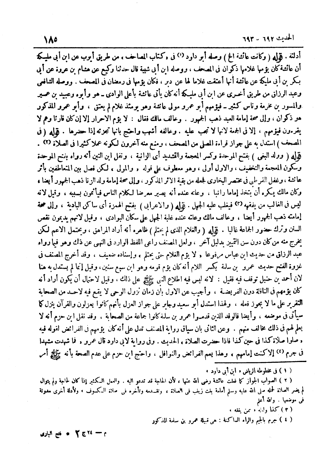 أَدِلَّتَهُ قَوْلُهُ وَكَانَتْ عَائِشَةُ إِلَخْ وَصَلَهُ أَبُو دَاوُدَ فِي كِتَابِ الْمَصَاحِفِ مِنْ طَرِيقِ أَيُّوبَ عَن بن أَبِي مُلَيْكَةَ أَنَّ عَائِشَةَ كَانَ يَؤُمُّهَا غُلَامُهَا ذكْوَان فِي الْمُصحف وَوَصله بن أَبِي شَيْبَةَ قَالَ حَدَّثَنَا وَكِيعٌ عَنْ هِشَامِ بْنِ عُرْوَةَ عَنْ أَبِي بَكْرِ بْنِ أَبِي مُلَيْكَةَ عَنْ عَائِشَةَ أَنَّهَا أَعْتَقَتْ غُلَامًا لَهَا عَنْ دُبُرٍ فَكَانَ يَؤُمُّهَا فِي رَمَضَانَ فِي الْمُصْحَفِ وَوَصَلَهُ الشَّافِعِيُّ وَعَبْدُ الرَّزَّاقِ مِنْ طَرِيقٍ أُخْرَى عَن بن أَبِي مُلَيْكَةَ أَنَّهُ كَانَ يَأْتِي عَائِشَةَ بِأَعْلَى الْوَادِي هُوَ وَأَبُوهُ وَعُبَيْدُ بْنُ عُمَيْرٍ وَالْمِسْوَرُ بْنُ مَخْرَمَةَ وَنَاسٌ كَثِيرٌ فَيَؤُمُّهُمْ أَبُو عَمْرٍو مَوْلَى عَائِشَةَ وَهُوَ يَوْمَئِذٍ غُلَامٌ لَمْ يُعْتَقْ وَأَبُو عَمْرٍو الْمَذْكُورُ هُوَ ذَكْوَانُ وَإِلَى صِحَّةِ إِمَامَةِ الْعَبْدِ ذَهَبَ الْجُمْهُورُ وَخَالَفَ مَالِكٌ فَقَالَ لَا يَؤُمُّ الْأَحْرَارَ إِلَّا إِنْ كَانَ قَارِئًا وهم لَا يقرؤون فَيَؤُمُّهُمْ إِلَّا فِي الْجُمُعَةِ لِأَنَّهَا لَا تَجِبُ عَلَيْهِ وَخَالَفَهُ أَشْهَبُ وَاحْتَجَّ بِأَنَّهَا تُجْزِئُهُ إِذَا حَضَرَهَا قَوْلُهُ فِي الْمُصْحَفِ اسْتُدِلَّ بِهِ عَلَى جَوَازِ قِرَاءَةِ الْمُصَلِّي مِنَ الْمُصْحَفِ وَمَنَعَ مِنْهُ آخَرُونَ لِكَوْنِهِ عَمَلًا كَثِيرًا فِي الصَّلَاةِ قَوْلُهُ وَوَلَدُ الْبَغِيِّ بِفَتْحِ الْمُوَحَّدَةِ وَكَسْرِ الْمُعْجَمَةِ وَالتَّشْدِيدِ أَي الزَّانِيَة وَنقل بن التِّينِ أَنَّهُ رَوَاهُ بِفَتْحِ الْمُوَحَّدَةِ وَسُكُونِ الْمُعْجَمَةِ وَالتَّخْفِيفِ وَالْأَوَّلُ أَوْلَى وَهُوَ مَعْطُوفٌ عَلَى قَوْلِهِ وَالْمَوْلَى لَكِنْ فُصِلَ بَيْنَ الْمُتَعَاطِفَيْنِ بِأَثَرِ عَائِشَةَ وَغَفَلَ الْقُرْطُبِيُّ فِي مُخْتَصَرِ الْبُخَارِيِّ فَجَعَلَهُ مِنْ بَقِيَّةِ الْأَثَرِ الْمَذْكُورِ وَإِلَى صِحَّةِ إِمَامَةِ وَلَدِ الزِّنَا ذَهَبَ الْجُمْهُورُ أَيْضًا وَكَانَ مَالِكٌ يَكْرَهُ أَنْ يُتَّخَذَ إِمَامًا رَاتِبًا وَعِلَّتُهُ عِنْدَهُ أَنَّهُ يعير مُعَرَّضًا لِكَلَامِ النَّاسِ فَيَأْثَمُونَ بِسَبَبِهِ وَقِيلَ لِأَنَّهُ لَيْسَ فِي الْغَالِبِ مَنْ يَفْقَهُهُ فَيَغْلِبُ عَلَيْهِ الْجَهْلُ قَوْلُهُ وَالْأَعْرَابِيُّ بِفَتْحِ الْهَمْزَةِ أَيْ سَاكِنُ الْبَادِيَةِ وَإِلَى صِحَّةِ إِمَامَتِهِ ذَهَبَ الْجُمْهُورُ أَيْضًا وَخَالَفَ مَالِكٌ وَعِلَّتُهُ عِنْدَهُ غَلَبَةُ الْجَهْلِ عَلَى سكان الْبَوَادِي وَقِيلَ لِأَنَّهُمْ يُدِيمُونَ نَقْصَ السُّنَنِ وَتَرْكَ حُضُورِ الْجَمَاعَةِ غَالِبًا قَوْلُهُ وَالْغُلَامُ الَّذِي لَمْ يَحْتَلِمْ ظَاهِرُهُ أَنَّهُ أَرَادَ الْمُرَاهِقَ وَيُحْتَمَلُ الْأَعَمَّ لَكِنْ يَخْرُجُ مِنْهُ مَنْ كَانَ دُونَ سِنِّ التَّمْيِيزِ بِدَلِيلٍ آخَرَ وَلَعَلَّ الْمُصَنِّفَ رَاعَى اللَّفْظَ الْوَارِدَ فِي النَّهْيِ عَنْ ذَلِكَ وَهُوَ فِيمَا رَوَاهُ عبد الرَّزَّاق من حَدِيث بن عَبَّاسٍ مَرْفُوعًا لَا يَؤُمُّ الْغُلَامَ حَتَّى يَحْتَلِمَ وَإِسْنَادُهُ ضَعِيفٌ وَقَدْ أَخْرَجَ الْمُصَنِّفُ فِي غَزْوَةِ الْفَتْحِ حَدِيثَ عَمْرِو بْنِ سَلِمَةَ بِكَسْرِ اللَّامِ أَنه كَانَ يؤم قومه وَهُوَ بن سَبْعِ سِنِينَ وَقِيلَ إِنَّمَا لَمْ يُسْتَدَلَّ بِهِ هُنَا لِأَنَّ أَحْمَدَ بْنَ حَنْبَلٍ تَوَقَّفَ فِيهِ فَقِيلَ لِأَنَّهُ لَيْسَ فِيهِ اطِّلَاعُ النَّبِيِّ صَلَّى اللَّهُ عَلَيْهِ وَسَلَّمَ عَلَى ذ لَك وَقِيلَ لِاحْتِمَالِ أَنْ يَكُونَ أَرَادَ أَنَّهُ كَانَ يَؤُمُّهُمْ فِي النَّافِلَةِ دُونَ الْفَرِيضَةِ وَأُجِيبَ عَنِ الْأَوَّلِ بِأَنَّ زَمَانَ نُزُولِ الْوَحْيِ لَا يَقَعُ فِيهِ ل