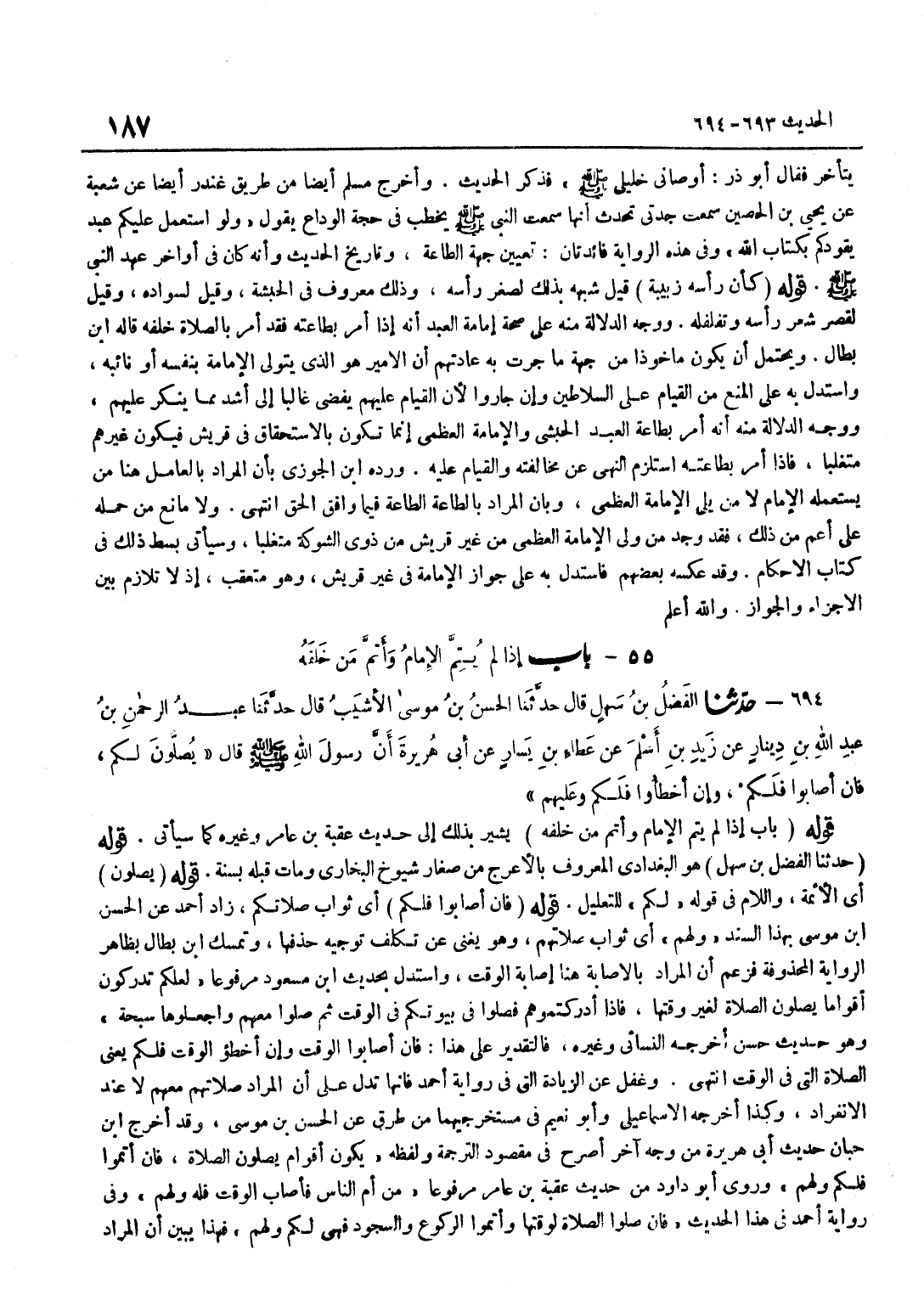 [694] قَوْلُهُ حَدَّثَنَا الْفَضْلُ بْنُ سَهْلٍ هُوَ الْبَغْدَادِيُّ الْمَعْرُوفُ بِالْأَعْرَجِ مِنْ صِغَارِ شُيُوخِ الْبُخَارِيِّ وَمَاتَ قَبْلَهُ بِسَنَةٍ قَوْلُهُ يُصَلُّونَ أَيِ الْأَئِمَّةُ وَاللَّامُ فِي قَوْلِهِ لَكُمْ لِلتَّعْلِيلِ قَوْلُهُ فَإِنْ أَصَابُوا فَلَكُمْ أَيْ ثَوَابُ صَلَاتِكُمْ زَادَ أَحْمَدُ عَنِ الْحَسَنِ بْنِ مُوسَى بِهَذَا السَّنَدِ وَلَهُمْ أَيْ ثَوَابُ صَلَاتِهِمْ وَهُوَ يُغْنِي عَنْ تَكَلُّفِ تَوْجِيهِ حَذْفِهَا وَتَمَسَّكَ بن بَطَّالٍ بِظَاهِرِ الرِّوَايَةِ الْمَحْذُوفَةِ فَزَعَمَ أَنَّ الْمُرَادَ بالاصابة هُنَا إِصَابَة الْوَقْت وَاسْتدلَّ بِحَدِيث بن مَسْعُودٍ مَرْفُوعًا لَعَلَّكُمْ تُدْرِكُونَ أَقْوَامًا يُصَلُّونَ الصَّلَاةَ لِغَيْرِ وَقْتِهَا فَإِذَا أَدْرَكْتُمُوهُمْ فَصَلُّوا فِي بُيُوتِكُمْ فِي الْوَقْتِ ثُمَّ صَلُّوا مَعَهُمْ وَاجْعَلُوهَا سُبْحَةً وَهُوَ حَدِيثٌ حَسَنٌ أَخْرَجَهُ النَّسَائِيُّ وَغَيْرُهُ فَالتَّقْدِيرُ على هَذَا فَإِن أَصَابُوا الْوَقْت وَإِن أخطؤوا الْوَقْتَ فَلَكُمْ يَعْنِي الصَّلَاةَ الَّتِي فِي الْوَقْتِ انْتَهَى وَغَفَلَ عَنِ الزِّيَادَةِ الَّتِي فِي رِوَايَةِ أَحْمَدَ فَإِنَّهَا تَدُلُّ عَلَى أَنَّ الْمُرَادَ صَلَاتُهُمْ مَعَهُمْ لَا عِنْدَ الِانْفِرَادِ وَكَذَا أَخْرَجَهُ الْإِسْمَاعِيلِيُّ وَأَبُو نُعَيْمٍ فِي مُسْتَخْرَجَيْهِمَا مِنْ طُرُقٍ عَنِ الْحسن بن مُوسَى وَقد أخرج بن حِبَّانَ حَدِيثَ أَبِي هُرَيْرَةَ مِنْ وَجْهٍ آخَرَ أَصْرَحَ فِي مَقْصُودِ التَّرْجَمَةِ وَلَفْظُهُ يَكُونُ أَقْوَامٌ يُصَلُّونَ الصَّلَاةَ فَإِنْ أَتَمُّوا فَلَكُمْ وَلَهُمْ وَرَوَى أَبُو دَاوُدَ مِنْ حَدِيثِ عُقْبَةَ بْنِ عَامِرٍ مَرْفُوعًا مَنْ أَمَّ النَّاسَ فَأَصَابَ الْوَقْتَ فَلَهُ وَلَهُمْ وَفِي رِوَايَةِ أَحْمَدَ فِي هَذَا الْحَدِيثِ فَإِنْ صَلَّوُا الصَّلَاةَ لِوَقْتِهَا وَأَتَمُّوا الرُّكُوعَ وَالسُّجُودَ فَهِيَ لَكُمْ وَلَهُمْ فَهَذَا يُبَيِّنُ أَنَّ الْمُرَادَ