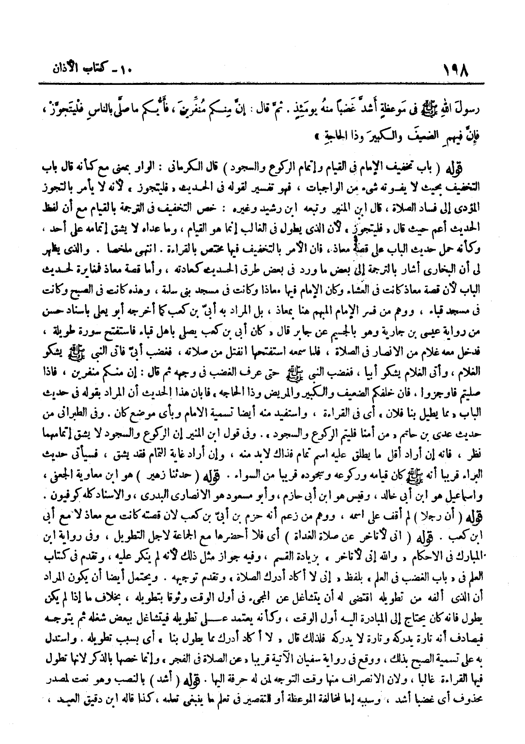 قَالَ الْكِرْمَانِيُّ الْوَاوُ بِمَعْنَى مَعَ كَأَنَّهُ قَالَ بَابُ التَّخْفِيفِ بِحَيْثُ لَا يَفُوتُهُ شَيْءٌ مِنَ الْوَاجِبَاتِ فَهُوَ تَفْسِيرٌ لِقَوْلِهِ فِي الْحَدِيثِ فَلْيَتَجَوَّزْ لِأَنَّهُ لَا يَأْمُرُ بِالتَّجَوُّزِ الْمُؤَدِّي إِلَى فَسَاد الصَّلَاة قَالَ بن الْمُنِير وَتَبعهُ بن رَشِيدٍ وَغَيْرُهُ خُصَّ التَّخْفِيفُ فِي التَّرْجَمَةِ بِالْقِيَامِ مَعَ أَنَّ لَفْظَ الْحَدِيثِ أَعَمُّ حَيْثُ قَالَ فَلْيَتَجَوَّزْ لِأَنَّ الَّذِي يَطُولُ فِي الْغَالِبِ إِنَّمَا هُوَ الْقِيَامُ وَمَا عَدَاهُ لَا يَشُقُّ إِتْمَامُهُ عَلَى أَحَدٍ وَكَأَنَّهُ حَمَلَ حَدِيثَ الْبَابِ عَلَى قِصَّةِ مُعَاذٍ فَإِنَّ الْأَمْرَ بِالتَّخْفِيفِ فِيهَا مُخْتَصٌّ بِالْقِرَاءَةِ انْتَهَى مُلَخَّصًا وَالَّذِي يَظْهَرُ لِي أَنَّ الْبُخَارِيَّ أَشَارَ بِالتَّرْجَمَةِ إِلَى بَعْضِ مَا وَرَدَ فِي بَعْضِ طُرُقِ الْحَدِيثِ كَعَادَتِهِ وَأَمَّا قِصَّةُ مُعَاذٍ فَمُغَايِرَةٌ لِحَدِيثِ الْبَابِ لِأَنَّ قِصَّةَ مُعَاذٍ كَانَت فىالعشاء وَكَانَ الْإِمَامُ فِيهَا مُعَاذًا وَكَانَتْ فِي مَسْجِدِ بَنِي سَلِمَةَ وَهَذِهِ كَانَتْ فِي الصُّبْحِ وَكَانَتْ فِي مَسْجِدِ قُبَاءٍ وَوَهِمَ مَنْ فَسَّرَ الْإِمَامَ الْمُبْهَمَ هُنَا بِمُعَاذٍ بَلِ الْمُرَادُ بِهِ أُبَيُّ بْنُ كَعْبٍ كَمَا أَخْرَجَهُ أَبُو يَعْلَى بِإِسْنَادٍ حَسَنٍ مِنْ رِوَايَةِ عِيسَى بْنِ جَارِيَةَ وَهُوَ بِالْجِيمِ عَنْ جَابِرٍ قَالَ كَانَ أُبَيُّ بْنُ كَعْبٍ يُصَلِّي بِأَهْلِ قُبَاءَ فَاسْتَفْتَحَ سُورَةً طَوِيلَةً فَدَخَلَ مَعَهُ غُلَامٌ مِنَ الْأَنْصَارِ فِي الصَّلَاةِ فَلَمَّا سَمِعَهُ اسْتَفْتَحَهَا انْفَتَلَ مِنْ صَلَاتِهِ فَغَضِبَ أُبَيٌّ فَأَتَى النَّبِيَّ صَلَّى اللَّهُ عَلَيْهِ وَسَلَّمَ يَشْكُو الْغُلَامَ وَأَتَى الْغُلَامُ يَشْكُو أُبَيًّا فَغَضِبَ النَّبِيُّ صَلَّى اللَّهُ عَلَيْهِ وَسَلَّمَ حَتَّى عُرِفَ الْغَضَبُ فِي وَجْهِهِ ثُمَّ قَالَ إِنَّ مِنْكُمْ مُنَفِّرِينَ فَإِذَا صَلَّيْتُمْ فَأَوْجِزُوا فَإِنَّ خَلْفَكُمُ الضَّعِيفَ وَالْكَبِيرَ وَالْمَرِيضَ وَذَا الْحَاجَةِ فَأَبَانَ هَذَا الْحَدِيثُ أَنَّ الْمُرَادَ بِقَوْلِهِ فِي حَدِيثِ الْبَابِ مِمَّا يُطِيلُ بِنَا فَلَانٌ أَيْ فِي الْقِرَاءَةِ وَاسْتُفِيدَ مِنْهُ أَيْضًا تَسْمِيَةُ الْإِمَامِ وَبِأَيِّ مَوْضِعٍ كَانَ وَفِي الطَّبَرَانِيِّ مِنْ حَدِيثِ عَدِيِّ بْنِ حَاتِمٍ مَنْ أَمَّنَا فَلْيُتِمَّ الرُّكُوعَ وَالسُّجُودَ وَفِي قَوْلِ بن الْمُنِيرِ إِنَّ الرُّكُوعَ وَالسُّجُودَ لَا يَشُقُّ إِتْمَامُهُمَا نَظَرٌ فَإِنَّهُ إِنْ أَرَادَ أَقَلَّ مَا يُطْلَقُ عَلَيْهِ اسْمُ تَمَامٍ فَذَاكَ لَا بُدَّ مِنْهُ وَإِنْ أَرَادَ غَايَةَ التَّمَامِ فَقَدْ يَشُقُّ فَسَيَأْتِي حَدِيثُ الْبَرَاءِ قَرِيبًا أَنَّهُ صَلَّى اللَّهُ عَلَيْهِ وَسَلَّمَ كَانَ قِيَامُهُ وَرُكُوعُهُ وَسُجُودُهُ قَرِيبًا مِنَ السوَاء