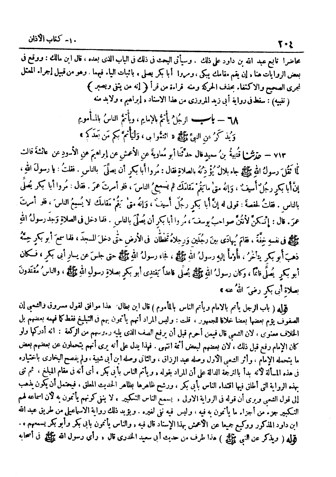 قَالَ بن بَطَّالٍ هَذَا مُوَافِقٌ لِقَوْلِ مَسْرُوقٍ وَالشَّعْبِيِّ إِنَّ الصُّفُوفَ يَؤُمُّ بَعْضُهَا بَعْضًا خِلَافًا لِلْجُمْهُورِ قُلْتُ وَلَيْسَ الْمُرَادُ أَنَّهُمْ يَأْتَمُّونَ بِهِمْ فِي التَّبْلِيغِ فَقَطْ كَمَا فَهِمَهُ بَعْضُهُمْ بَلِ الْخِلَافُ مَعْنَوِيٌّ لِأَنَّ الشَّعْبِيَّ قَالَ فِيمَنْ أَحْرَمَ قَبْلَ أَنْ يرفع الصَّفّ الَّذِي يَلِيهِ رؤوسهم مِنَ الرَّكْعَةِ إِنَّهُ أَدْرَكَهَا وَلَوْ كَانَ الْإِمَامُ رَفَعَ قَبْلَ ذَلِكَ لِأَنَّ بَعْضَهُمْ لِبَعْضٍ أَئِمَّةٌ انْتَهَى فَهَذَا يَدُلُّ عَلَى أَنَّهُ يَرَى أَنَّهُمْ يَتَحَمَّلُونَ عَنْ بَعْضِهِمْ بَعْضَ مَا يَتَحَمَّلُهُ الْإِمَامُ وَأَثَرُ الشَّعْبِيِّ الْأَوَّلُ وَصَلَهُ عَبْدُ الرَّزَّاقِ وَالثَّانِي وَصله بن أَبِي شَيْبَةَ وَلَمْ يُفْصِحِ الْبُخَارِيُّ بِاخْتِيَارِهِ فِي هَذِهِ الْمَسْأَلَةِ لِأَنَّهُ بَدَأَ بِالتَّرْجَمَةِ الدَّالَّةِ عَلَى أَنَّ الْمُرَادَ بِقَوْلِهِ وَيَأْتَمُّ النَّاسُ بِأَبِي بَكْرٍ أَيْ أَنَّهُ فِي مَقَامِ الْمُبَلِّغِ ثُمَّ ثَنَّى بِهَذِهِ الرِّوَايَةِ الَّتِي أَطْلَقَ فِيهَا اقْتِدَاءَ النَّاسِ بِأَبِي بَكْرٍ وَرَشَّحَ ظَاهِرَهَا بِظَاهِرِ الْحَدِيثِ الْمُعَلَّقِ فَيُحْتَمَلُ أَنْ يَكُونَ يَذْهَبُ إِلَى قَوْلِ الشَّعْبِيِّ وَيَرَى أَنَّ قَوْلَهُ فِي الرِّوَايَةِ الْأُولَى يَسْمَعُ النَّاسُ التَّكْبِيرَ لَا يَنْفِي كَوْنَهُمْ يَأْتَمُّونَ بِهِ لِأَنَّ إِسْمَاعَهُ لَهُمُ التَّكْبِيرَ جُزْءٌ مِنْ أَجْزَاءِ مَا يَأْتَمُّونَ بِهِ فِيهِ وَلَيْسَ فِيهِ نَفْيٌ لِغَيْرِهِ وَيُؤَيِّدُ ذَلِكَ رِوَايَةُ الْإِسْمَاعِيلِيِّ مِنْ طَرِيقِ عَبْدِ اللَّهِ بْنِ دَاوُدَ الْمَذْكُورِ وَوَكِيعٍ جَمِيعًا عَنِ الْأَعْمَشِ بِهَذَا الْإِسْنَادِ قَالَ فِيهِ وَالنَّاسُ يَأْتَمُّونَ بِأَبِي بَكْرٍ وَأَبُو بَكْرٍ يُسْمِعُهُمْ قَوْلُهُ وَيُذْكَرُ عَنِ النَّبِيِّ صَلَّى اللَّهُ عَلَيْهِ وَسَلَّمَ هَذَا طَرَفٌ مِنْ حَدِيثِ أَبِي سَعِيدٍ الْخُدْرِيِّ قَالَ رَأَى رَسُولُ اللَّهِ صَلَّى اللَّهُ عَلَيْهِ وَسَلَّمَ فِي أَصْحَابِهِ