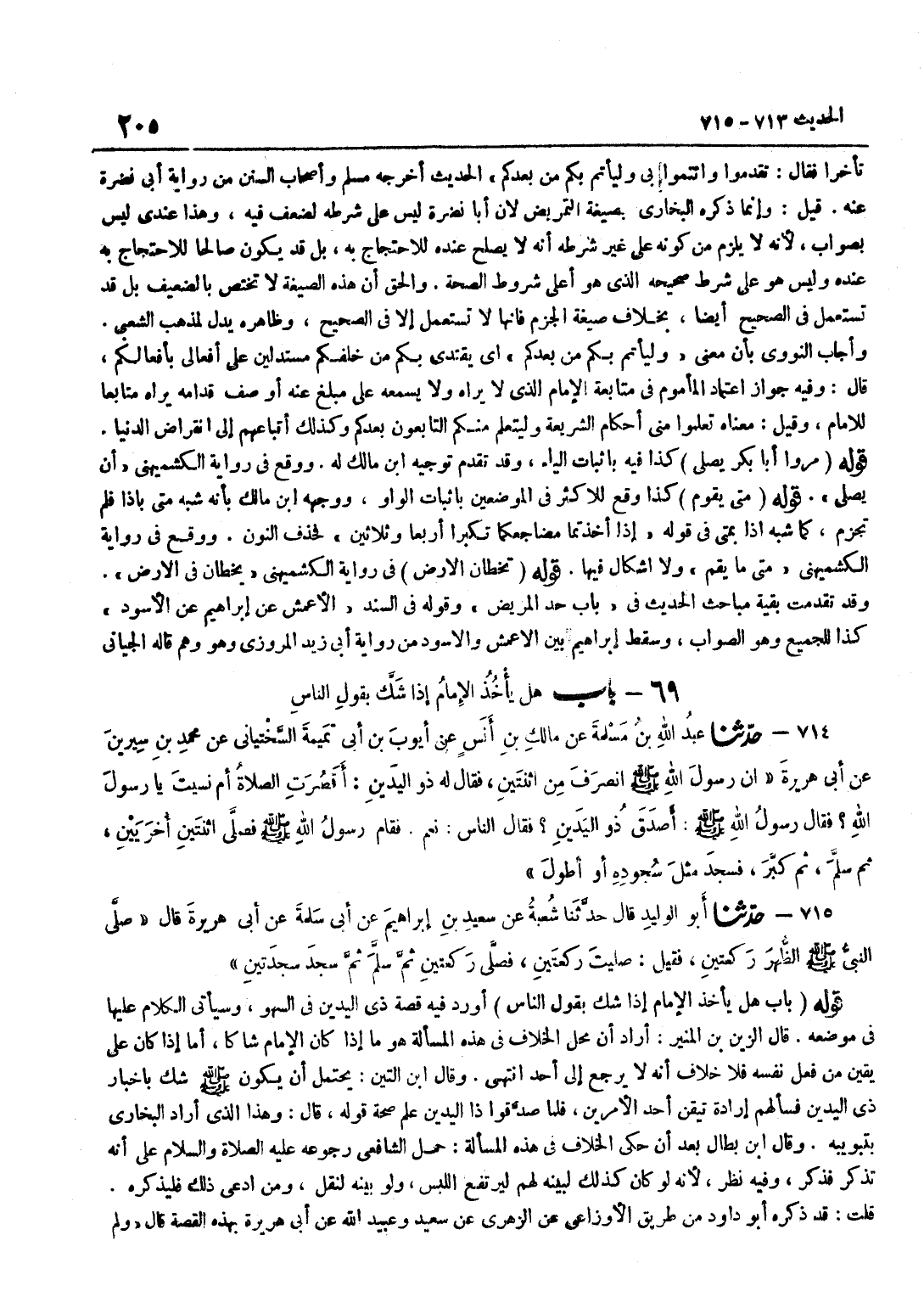 أَوْرَدَ فِيهِ قِصَّةَ ذِي الْيَدَيْنِ فِي السَّهْوِ وَسَيَأْتِي الْكَلَامُ عَلَيْهَا فِي مَوْضِعِهِ قَالَ الزَّيْنُ بْنُ الْمُنِيرِ أَرَادَ أَنَّ مَحَلَّ الْخِلَافِ فِي هَذِهِ الْمَسْأَلَةِ هُوَ مَا إِذَا كَانَ الْإِمَامُ شَاكًّا أَمَّا إِذَا كَانَ عَلَى يَقِينٍ مِنْ فِعْلِ نَفْسِهِ فَلَا خِلَافَ أَنَّهُ لَا يرجع إِلَى أحد انْتهى وَقَالَ بن التِّينِ يُحْتَمَلُ أَنْ يَكُونَ صَلَّى اللَّهُ عَلَيْهِ وَسَلَّمَ شَكَّ بِإِخْبَارِ ذِي الْيَدَيْنِ فَسَأَلَهُمْ إِرَادَةَ تَيَقُّنِ أَحَدِ الْأَمْرَيْنِ فَلَمَّا صَدَّقُوا ذَا الْيَدَيْنِ عَلِمَ صِحَّةَ قَوْلِهِ قَالَ وَهَذَا الَّذِي أَرَادَ البُخَارِيّ بتبويبه وَقَالَ بن بَطَّالٍ بَعْدَ أَنْ حَكَى الْخِلَافَ فِي هَذِهِ الْمَسْأَلَةِ حَمَلَ الشَّافِعِيُّ رُجُوعَهُ عَلَيْهِ الصَّلَاةُ وَالسَّلَامُ عَلَى أَنَّهُ تَذَكَّرَ فَذَكَرَ وَفِيهِ نَظَرٌ لِأَنَّهُ لَوْ كَانَ كَذَلِكَ لَبَيَّنَهُ لَهُمْ لِيَرْتَفِعَ اللَّبْسُ وَلَوْ بَيَّنَهُ لَنُقِلَ وَمَنِ ادَّعَى ذَلِكَ فَلْيَذْكُرْهُ قُلْتُ قَدْ ذَكَرَهُ أَبُو دَاوُدَ مِنْ طَرِيقِ الْأَوْزَاعِيِّ عَنِ الزُّهْرِيِّ عَنْ سَعِيدٍ وَعُبَيْدِ اللَّهِ عَنْ أَبِي هُرَيْرَةَ بِهَذِهِ الْقِصَّةِ قَالَ وَلَمْ