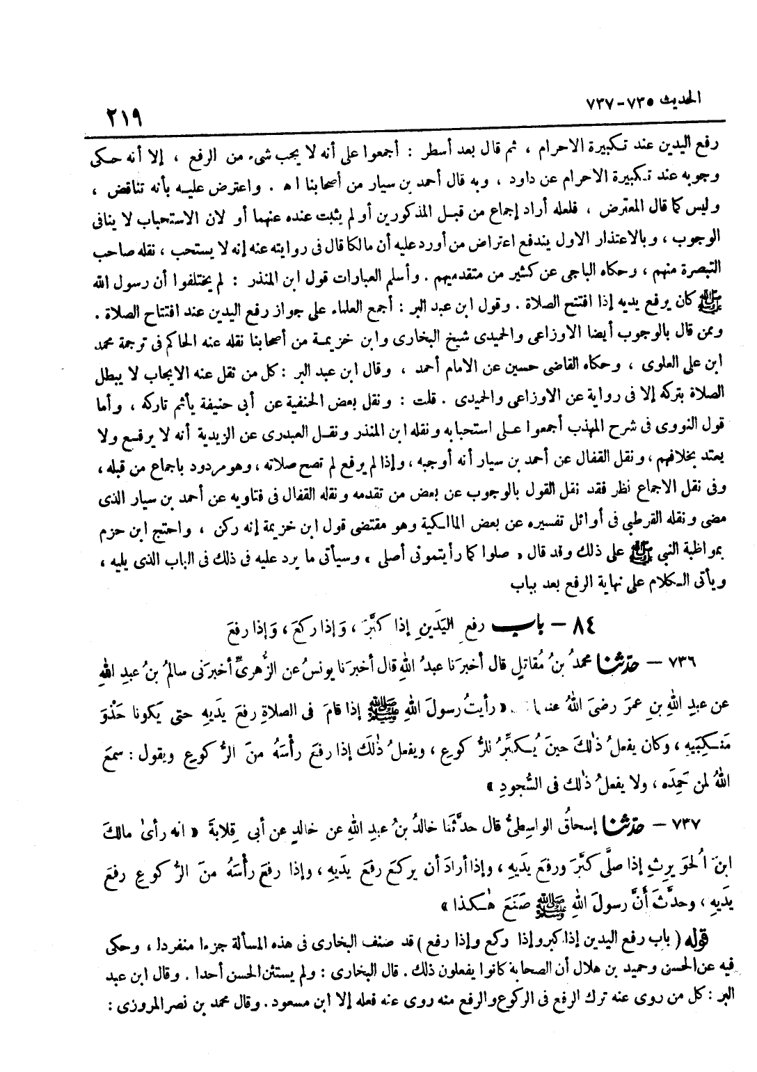 رَفْعِ الْيَدَيْنِ عِنْدَ تَكْبِيرَةِ الْإِحْرَامِ ثُمَّ قَالَ بَعْدَ أَسْطُرٍ أَجْمَعُوا عَلَى أَنَّهُ لَا يَجِبُ شَيْءٌ مِنَ الرَّفْعِ إِلَّا أَنَّهُ حُكِيَ وُجُوبُهُ عِنْدَ تَكْبِيرَةِ الْإِحْرَامِ عَنْ دَاوُدَ وَبِهِ قَالَ أَحْمَدُ بْنُ سَيَّارٍ مِنْ أَصْحَابِنَا اه وَاعْتُرِضَ عَلَيْهِ بِأَنَّهُ تَنَاقُضٌ وَلَيْسَ كَمَا قَالَ الْمُعْتَرِضُ فَلَعَلَّهُ أَرَادَ إِجْمَاعَ مَنْ قَبْلَ الْمَذْكُورِينَ أَوْ لَمْ يَثْبُتْ عِنْدَهُ عَنْهُمَا أَوْ لِأَنَّ الِاسْتِحْبَابَ لَا يُنَافِي الْوُجُوبَ وَبِالِاعْتِذَارِ الْأَوَّلِ يَنْدَفِعُ اعْتِرَاضُ مَنْ أَوْرَدَ عَلَيْهِ أَنَّ مَالِكًا قَالَ فِي رِوَايَتِهِ عَنْهُ إِنَّهُ لَا يُسْتَحَبُّ نَقَلَهُ صَاحِبُ التَّبْصِرَةِ مِنْهُمْ وَحَكَاهُ الْبَاجِيُّ عَنْ كَثِيرٍ مِنْ متقدميهم وَأسلم الْعبارَات قَول بن الْمُنْذِرِ لَمْ يَخْتَلِفُوا أَنَّ رَسُولَ اللَّهِ صَلَّى اللَّهُ عَلَيْهِ وَسَلَّمَ كَانَ يَرْفَعُ يَدَيْهِ إِذَا افْتتح الصَّلَاة وَقَول بن عَبْدِ الْبَرِّ أَجْمَعَ الْعُلَمَاءُ عَلَى جَوَازِ رَفْعِ الْيَدَيْنِ عِنْدَ افْتِتَاحِ الصَّلَاةِ وَمِمَّنْ قَالَ بِالْوُجُوبِ أَيْضا الْأَوْزَاعِيّ والْحميدِي شيخ البُخَارِيّ وبن خُزَيْمَةَ مِنْ أَصْحَابِنَا نَقَلَهُ عَنْهُ الْحَاكِمُ فِي تَرْجَمَةِ مُحَمَّدِ بْنِ عَلِيٍّ الْعَلَوِيِّ وَحَكَاهُ الْقَاضِي حسن عَن الإِمَام أَحْمد وَقَالَ بن عَبْدِ الْبَرِّ كُلُّ مَنْ نُقِلَ عَنْهُ الْإِيجَابُ لَا يُبْطِلُ الصَّلَاةَ بِتَرْكِهِ إِلَّا فِي رِوَايَةٍ عَنِ الْأَوْزَاعِيِّ وَالْحُمَيْدِيِّ قُلْتُ وَنَقَلَ بَعْضُ الْحَنَفِيَّةِ عَنْ أَبِي حَنِيفَةَ يَأْثَمُ تَارِكُهُ وَأَمَّا قَوْلُ النَّوَوِيِّ فِي شَرْحِ الْمُهَذَّبِ أَجْمَعُوا عَلَى اسْتِحْبَابِهِ وَنَقله بن الْمُنْذِرِ وَنَقَلَ الْعَبْدَرِيُّ عَنِ الزَّيْدِيَّةِ أَنَّهُ لَا يَرْفَعُ وَلَا يُعْتَدُّ بِخِلَافِهِمْ وَنَقَلَ الْقَفَّالُ عَنْ أَحْمَدَ بْنِ سَيَّارٍ أَنَّهُ أَوْجَبَهُ وَإِذَا لَمْ يَرْفَعْ لَمْ تَصِحَّ صَلَاتُهُ وَهُوَ مَرْدُودٌ بِإِجْمَاعِ مَنْ قَبْلَهُ وَفِي نَقْلِ الْإِجْمَاعِ نَظَرٌ فَقَدْ نُقِلَ الْقَوْلُ بِالْوُجُوبِ عَنْ بَعْضِ مَنْ تَقَدَّمَهُ وَنَقَلَهُ الْقَفَّالُ فِي فَتَاوِيهِ عَنْ أَحْمَدِ بْنِ سَيَّارٍ الَّذِي مَضَى وَنَقَلَهُ الْقُرْطُبِيُّ فِي أَوَائِلِ تَفْسِيرِهِ عَنْ بَعْضِ الْمَالِكِيَّةِ وَهُوَ مُقْتَضَى قَوْلِ بن خُزَيْمَة إِنَّه ركن وَاحْتج بن حَزْمٍ بِمُوَاظَبَةِ النَّبِيِّ صَلَّى اللَّهُ عَلَيْهِ وَسَلَّمَ عَلَى ذَلِكَ وَقَدْ قَالَ صَلُّوا كَمَا رَأَيْتُمُونِي أُصَلِّي وَسَيَأْتِي مَا يَرُدُّ عَلَيْهِ فِي ذَلِكَ فِي الْبَابِ الَّذِي يَلِيهِ وَيَأْتِي الْكَلَامُ عَلَى نِهَايَة الرّفْع بعد بِبَاب