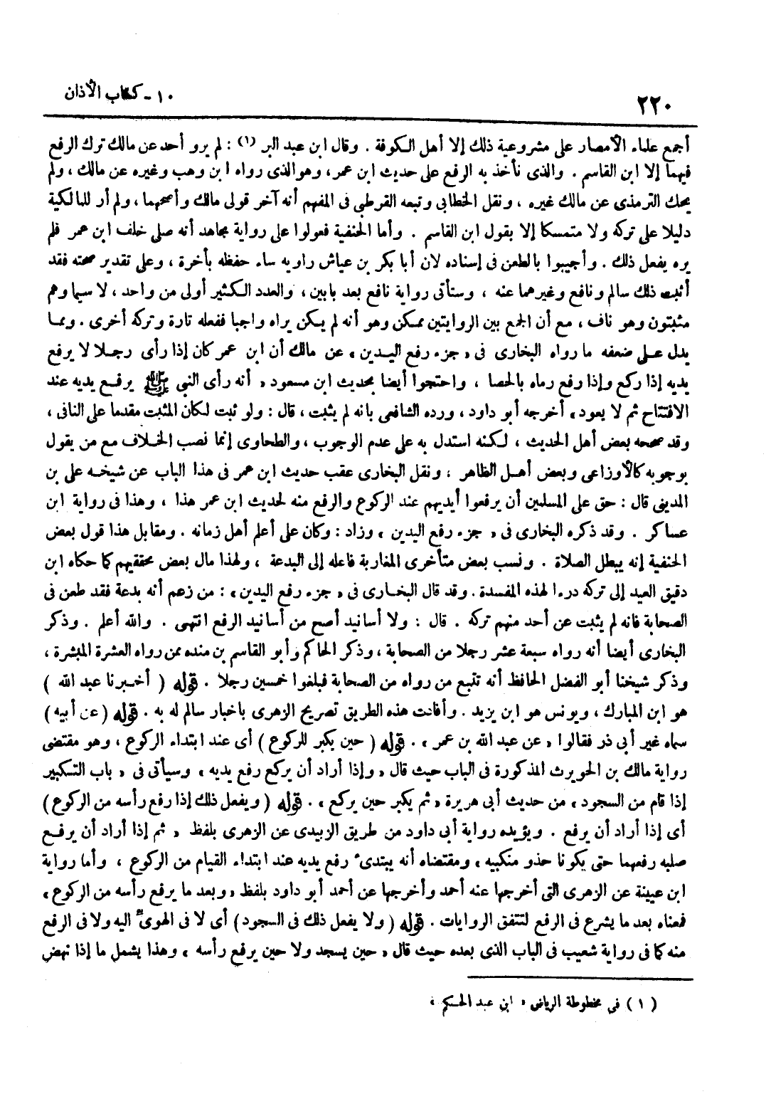 أَجْمَعَ عُلَمَاءُ الْأَمْصَارِ عَلَى مَشْرُوعِيَّةِ ذَلِكَ إِلَّا أهل الْكُوفَة وَقَالَ بن عَبْدِ الْبَرِّ لَمْ يَرْوِ أَحَدٌ عَنْ مَالِكٍ ترك الرّفْع فيهمَا إِلَّا بن الْقَاسِمِ وَالَّذِي نَأْخُذُ بِهِ الرَّفْعَ عَلَى حَدِيثِ بن عمر وَهُوَ الَّذِي رَوَاهُ بن وَهْبٍ وَغَيْرُهُ عَنْ مَالِكٍ وَلَمْ يَحْكِ التِّرْمِذِيُّ عَنْ مَالِكٍ غَيْرَهُ وَنَقَلَ الْخَطَّابِيُّ وَتَبِعَهُ الْقُرْطُبِيُّ فِي الْمُفْهِمِ أَنَّهُ آخِرُ قَوْلَيْ مَالِكٍ وَأَصَحُّهُمَا وَلَمْ أَرَ لِلْمَالِكِيَّةِ دَلِيلًا عَلَى تَرْكِهِ وَلَا متمسكا إِلَّا بقول بن الْقَاسِمِ وَأَمَّا الْحَنَفِيَّةُ فَعَوَّلُوا عَلَى رِوَايَةِ مُجَاهِدٍ أَنه صلى خلف بن عُمَرَ فَلَمْ يَرَهُ يَفْعَلُ ذَلِكَ وَأُجِيبُوا بِالطَّعْنِ فِي إِسْنَادِهِ لِأَنَّ أَبَا بَكْرِ بْنِ عَيَّاشٍ رَاوِيَهُ سَاءَ حِفْظُهُ بِآخِرِهِ وَعَلَى تَقْدِيرِ صِحَّتِهِ فَقَدْ أَثْبَتَ ذَلِكَ سَالِمٌ وَنَافِعٌ وَغَيْرُهُمَا عَنْهُ وَسَتَأْتِي رِوَايَةُ نَافِعٍ بَعْدَ بَابَيْنِ وَالْعَدَدُ الْكَثِيرُ أولى من وَاحِد لَا سِيمَا وَهْمْ مُثْبِتُونَ وَهُوَ نَافٍ مَعَ أَنَّ الْجَمْعَ بَيْنَ الرِّوَايَتَيْنِ مُمْكِنٌ وَهُوَ أَنَّهُ لَمْ يَكُنْ يَرَاهُ وَاجِبًا فَفَعَلَهُ تَارَةً وَتَرَكَهُ أُخْرَى وَمِمَّا يَدُلُّ عَلَى ضَعْفِهِ مَا رَوَاهُ الْبُخَارِيُّ فِي جُزْء رفع الْيَدَيْنِ عَن مَالك أَن بن عُمَرَ كَانَ إِذَا رَأَى رَجُلًا لَا يَرْفَعُ يَدَيْهِ إِذا ركع وَإِذا رفع رَمَاه بالحصا وَاحْتَجُّوا أَيْضا بِحَدِيث بن مَسْعُودٍ أَنَّهُ رَأَى النَّبِيَّ صَلَّى اللَّهُ عَلَيْهِ وَسَلَّمَ يَرْفَعُ يَدَيْهِ عِنْدَ الِافْتِتَاحِ ثُمَّ لَا يَعُودُ أَخْرَجَهُ أَبُو دَاوُدَ وَرَدَّهُ الشَّافِعِيُّ بِأَنَّهُ لَمْ يَثْبُتْ قَالَ وَلَوْ ثَبَتَ لَكَانَ الْمُثْبِتُ مُقَدَّمًا عَلَى النَّافِي وَقَدْ صَحَّحَهُ بَعْضُ أَهْلِ الْحَدِيثِ لَكِنَّهُ اسْتَدَلَّ بِهِ عَلَى عَدَمِ الْوُجُوبِ والطَّحَاوِيُّ إِنَّمَا نَصَبَ الْخِلَافَ مَعَ مَنْ يَقُولُ بِوُجُوبِهِ كَالْأَوْزَاعِيِّ وَبَعْضِ أَهْلِ الظَّاهِرِ وَنَقَلَ الْبُخَارِيُّ عقب حَدِيث بن عُمَرَ فِي هَذَا الْبَابِ عَنْ شَيْخِهِ عَلِيِّ بْنِ الْمَدِينِيِّ قَالَ حَقٌّ عَلَى الْمُسْلِمِينَ أَنْ يَرْفَعُوا أَيْدِيَهُمْ عِنْدَ الرُّكُوعِ وَالرَّفْعِ مِنْهُ لِحَدِيثِ بن عمر هَذَا وَهَذَا فِي رِوَايَة بن عَسَاكِرَ وَقَدْ ذَكَرَهُ الْبُخَارِيُّ فِي جُزْءِ رَفْعِ الْيَدَيْنِ وَزَادَ وَكَانَ عَلِيٌّ أَعْلَمَ أَهْلِ زَمَانِهِ وَمُقَابِلُ هَذَا قَوْلُ بَعْضِ الْحَنَفِيَّةِ أَنَّهُ يُبْطِلُ الصَّلَاةَ وَنَسَبَ بَعْضُ مُتَأَخَّرِي الْمَغَارِبَةِ فَاعِلَهُ إِلَى الْبِدْعَةِ وَلِهَذَا مَالَ بَعْضُ مُحَقِّقِيهِمْ كَمَا حَكَاهُ بن دَقِيقِ الْعِيدِ إِلَى تَرْكِهِ دَرْءًا لِهَذِهِ الْمَفْسَدَةِ وَقَدْ قَالَ الْبُخَارِيُّ فِي جُزْءِ رَفْعِ الْيَدَيْنِ مَنْ زَعَمَ أَنَّهُ بِدْعَةٌ فَقَدْ طَعَنَ فِي الصَّحَابَةِ فَإِنَّهُ لَمْ يَثْبُتْ عَنْ أَحَدٍ مِنْهُمْ تَرْكُهُ قَالَ وَلَا أَسَانِيدَ أَصَحُّ مِنْ أَسَانِيدِ الرَّفْعِ انْتَهَى وَاللَّهُ أَعْلَمُ وَذَكَرَ الْبُخَارِيُّ أَيْضًا أَنَّهُ رَوَاهُ سَبْعَةَ عَشَرَ رَجُلًا مِنَ الصَّحَابَةِ وَذَكَرَ الْحَاكِمُ وَأَبُو الْقَاسِمِ بْنُ مَنْدَهْ مِمَّنْ رَوَاهُ الْعَشَرَةُ الْمُبَشَّرَةُ وَذَكَرَ شَيْخُنَا أَبُو الْفَضْلِ الْحَافِظُ أَنَّهُ تَتَبَّعَ مَنْ رَوَاهُ مِنَ الصَّحَابَةِ فَبَلَغُوا خَمْسِينَ رَجُلًا