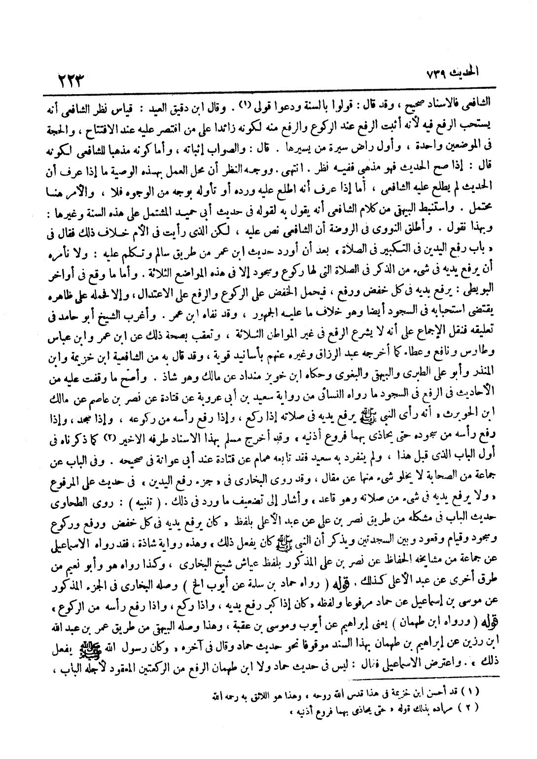 الشَّافِعِيُّ فَالْإِسْنَادُ صَحِيحٌ وَقَدْ قَالَ قُولُوا بِالسُّنَّةِ ودعوا قولي وَقَالَ بن دَقِيقِ الْعِيدِ قِيَاسُ نَظَرِ الشَّافِعِيِّ أَنَّهُ يُسْتَحَبُّ الرَّفْعُ فِيهِ لِأَنَّهُ أَثْبَتَ الرَّفْعَ عِنْدَ الرُّكُوعِ وَالرَّفْعِ مِنْهُ لِكَوْنِهِ زَائِدًا عَلَى مَنِ اقْتَصَرَ عَلَيْهِ عِنْدَ الِافْتِتَاحِ وَالْحُجَّةُ فِي الْمَوْضِعَيْنِ وَاحِدَةٌ وَأَوَّلُ رَاضٍ سِيرَةً مَنْ يَسِيرُهَا قَالَ وَالصَّوَابُ إِثْبَاتُهُ وَأَمَّا كَوْنُهُ مَذْهَبًا لِلشَّافِعِيِّ لِكَوْنِهِ قَالَ إِذَا صَحَّ الْحَدِيثُ فَهُوَ مَذْهَبِي فَفِيهِ نَظَرٌ انْتَهَى وَوَجْهُ النَّظَرِ أَنَّ مَحَلَّ الْعَمَلِ بِهَذِهِ الْوَصِيَّةِ مَا إِذَا عُرِفَ أَنَّ الْحَدِيثَ لَمْ يَطَّلِعْ عَلَيْهِ الشَّافِعِيُّ أَمَّا إِذَا عُرِفَ أَنَّهُ اطَّلَعَ عَلَيْهِ وَرَدَّهُ أَوْ تَأَوَّلَهُ بِوَجْهٍ مِنَ الْوُجُوهِ فَلَا وَالْأَمْرُ هُنَا مُحْتَمَلٌ وَاسْتَنْبَطَ الْبَيْهَقِيُّ مِنْ كَلَامِ الشَّافِعِيِّ أَنَّهُ يَقُولُ بِهِ لِقَوْلِهِ فِي حَدِيثِ أَبِي حُمَيْدٍ الْمُشْتَمِلِ عَلَى هَذِهِ السُّنَّةِ وَغَيْرِهَا وَبِهَذَا نَقُولُ وَأَطْلَقَ النَّوَوِيُّ فِي الرَّوْضَةِ أَنَّ الشَّافِعِيَّ نَصَّ عَلَيْهِ لَكِنَّ الَّذِي رَأَيْتُ فِي الْأُمِّ خِلَافَ ذَلِكَ فَقَالَ فِي بَابِ رَفْعِ الْيَدَيْنِ فِي التَّكْبِيرِ فِي الصَّلَاةِ بعد أَن أورد حَدِيث بن عُمَرَ مِنْ طَرِيقِ سَالِمٍ وَتَكَلَّمَ عَلَيْهِ وَلَا نَأْمُرُهُ أَنْ يَرْفَعَ يَدَيْهِ فِي شَيْءٍ مِنَ الذِّكْرِ فِي الصَّلَاةِ الَّتِي لَهَا رُكُوعٌ وَسُجُودٌ إِلَّا فِي هَذِهِ الْمَوَاضِعِ الثَّلَاثَةِ وَأَمَّا مَا وَقَعَ فِي أَوَاخِرِ الْبُوَيْطِيِّ يَرْفَعُ يَدَيْهِ فِي كُلِّ خَفْضٍ وَرَفْعٍ فَيُحْمَلُ الْخَفْضُ عَلَى الرُّكُوعِ وَالرَّفْعُ عَلَى الِاعْتِدَالِ وَإِلَّا فَحَمْلُهُ عَلَى ظَاهِرِهِ يَقْتَضِي اسْتِحْبَابُهُ فِي السُّجُودِ أَيْضًا وَهُوَ خِلَافُ مَا عَلَيْهِ الْجُمْهُور وَقد نَفَاهُ بن عُمَرَ وَأَغْرَبَ الشَّيْخُ أَبُو حَامِدٍ فِي تَعْلِيقِهِ فَنَقَلَ الْإِجْمَاعَ عَلَى أَنَّهُ لَا يُشْرَعُ الرَّفْعُ فِي غَيْرِ الْمَوَاطِنِ الثَّلَاثَةِ وَتُعُقِّبَ بِصِحَّةِ ذَلِكَ عَن بن عمر وبن عَبَّاسٍ وَطَاوُسٍ وَنَافِعٍ وَعَطَاءٍ كَمَا أَخْرَجَهُ عَبْدُ الرَّزَّاقِ وَغَيْرُهُ عَنْهُمْ بِأَسَانِيدَ قَوِيَّةٍ وَقَدْ قَالَ بِهِ من الشَّافِعِيَّة بن خُزَيْمَة وبن الْمُنْذِرِ وَأَبُو عَلِيٍّ الطَّبَرِيُّ والْبَيْهَقِيُّ وَالْبَغَوِيُّ وَحَكَاهُ بن خُوَيْزِ مَنْدَادُ عَنْ مَالِكٍ وَهُوَ شَاذٌّ وَأَصَحُّ مَا وَقَفْتُ عَلَيْهِ مِنَ الْأَحَادِيثِ فِي الرَّفْعِ فِي السُّجُودِ مَا رَوَاهُ النَّسَائِيُّ مِنْ رِوَايَةِ سَعِيدِ بْنِ أَبِي عَرُوبَةَ عَنْ قَتَادَةَ عَنْ نَصْرِ بْنِ عَاصِمٍ عَنْ مَالِكِ بْنِ الْحُوَيْرِثِ أَنَّهُ رَأَى النَّبِيَّ صَلَّى اللَّهُ عَلَيْهِ وَسَلَّمَ يَرْفَعُ يَدَيْهِ فِي صَلَاتِهِ إِذَا رَكَعَ وَإِذَا رَفَعَ رَأْسَهُ مِنْ رُكُوعِهِ وَإِذَا سَجَدَ وَإِذَا رَفَعَ رَأْسَهُ مِنْ سُجُودِهِ حَتَّى يُحَاذِيَ بِهِمَا فُرُوعَ أُذُنَيْهِ وَقَدْ أَخْرَجَ مُسْلِمٌ بِهَذَا الْإِسْنَادِ طَرَفَهُ الْأَخِيرَ كَمَا ذَكَرْنَاهُ فِي أَوَّلِ الْبَابِ الَّذِي قَبْلَ هَذَا وَلَمْ يَنْفَرِدْ بِهِ سَعِيدٌ فَقَدْ تَابَعَهُ هَمَّامٌ عَنْ قَتَادَةَ عِنْدَ أَبِي عَوَانَةَ فِي صَحِيحِهِ وَفِي الْبَابِ عَنْ جَمَاعَةٍ مِنَ الصَّحَابَةِ لَا يَخْلُو شَيْءٌ مِنْهَا عَنْ مَقَالٍ وَقَدْ رَوَى الْبُخَارِيُّ فِي جُزْءِ رَفْعِ الْيَدَيْنِ فِي حَدِيثِ عَلِيٍّ الْمَرْفُوعِ وَلَا يَرْفَعُ يَدَيْهِ فِي شَيْءٍ مِنْ صَلَاتِهِ وَهُوَ قَاعِدٌ وَأَشَارَ إِلَى تَض