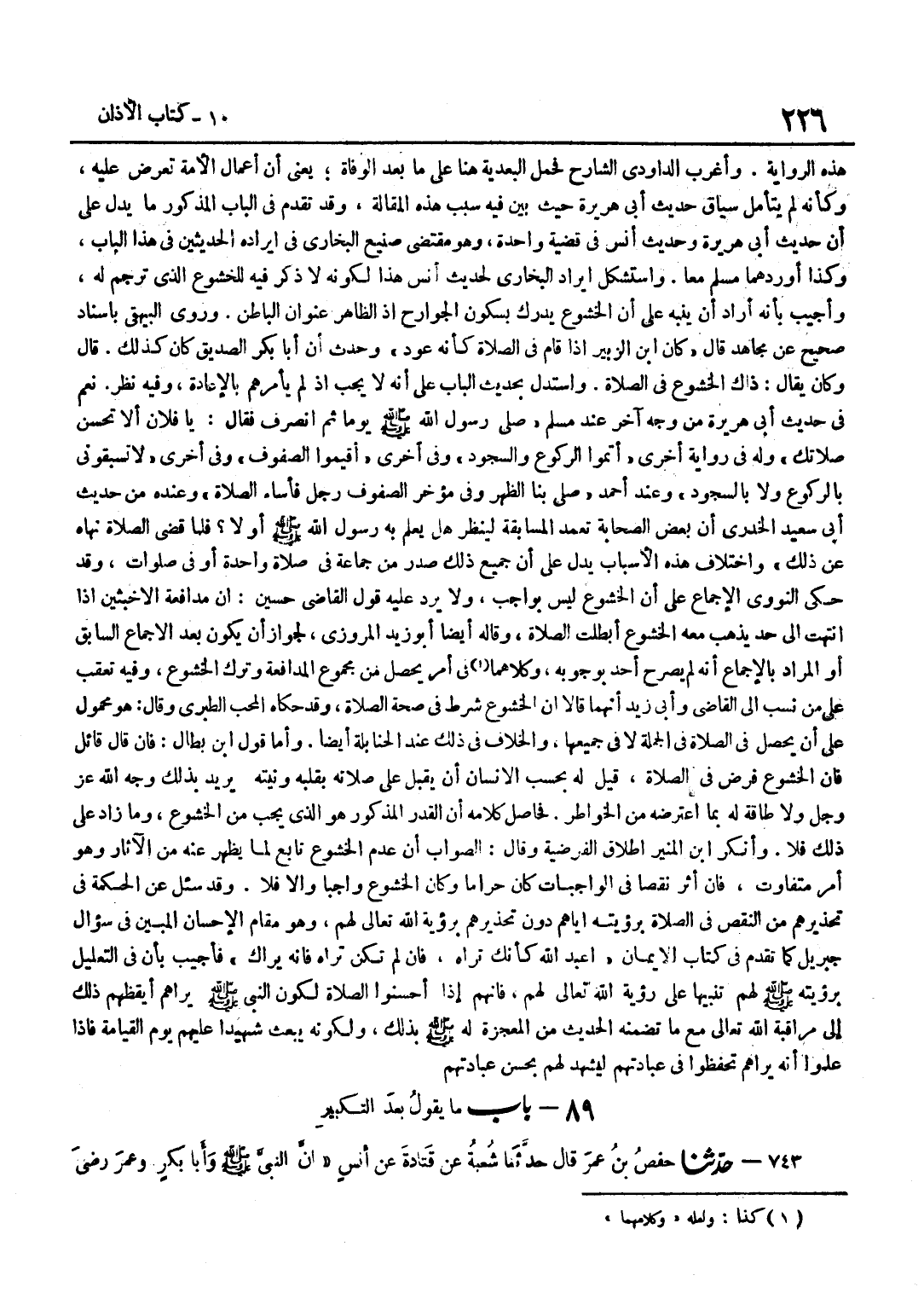 هَذِهِ الرِّوَايَةِ وَأَغْرَبَ الدَّاوُدِيُّ الشَّارِحُ فَحَمَلَ الْبَعْدِيَّةَ هُنَا عَلَى مَا بَعْدَ الْوَفَاةِ يَعْنِي أَنَّ أَعْمَالَ الْأُمَّةِ تُعْرَضُ عَلَيْهِ وَكَأَنَّهُ لَمْ يَتَأَمَّلْ سِيَاقَ حَدِيثِ أَبِي هُرَيْرَةَ حَيْثُ بَيَّنَ فِيهِ سَبَبَ هَذِهِ الْمَقَالَةِ وَقَدْ تَقَدَّمَ فِي الْبَابِ الْمَذْكُورِ مَا يَدُلُّ عَلَى أَنَّ حَدِيثَ أَبِي هُرَيْرَةَ وَحَدِيثَ أَنَسٍ فِي قَضِيَّةٍ وَاحِدَةٍ وَهُوَ مُقْتَضَى صَنِيعِ الْبُخَارِيِّ فِي إِيرَادِهِ الْحَدِيثَيْنِ فِي هَذَا الْبَابِ وَكَذَا أَوْرَدَهُمَا مُسْلِمٌ مَعًا وَاسْتَشْكَلَ إِيرَاد البُخَارِيّ لحَدِيث أنس هَذَا لكَونه لأذكر فِيهِ لِلْخُشُوعِ الَّذِي تَرْجَمَ لَهُ وَأُجِيبَ بِأَنَّهُ أَرَادَ أَنْ يُنَبِّهَ عَلَى أَنَّ الْخُشُوعَ يُدْرَكُ بِسُكُونِ الْجَوَارِحِ إِذِ الظَّاهِرُ عُنْوَانُ الْبَاطِنِ وَرَوَى الْبَيْهَقِيُّ بِإِسْنَادٍ صَحِيحٍ عَنْ مُجَاهِدٍ قَالَ كَانَ بن الزُّبَيْرِ إِذَا قَامَ فِي الصَّلَاةِ كَأَنَّهُ عُودٌ وَحَدَّثَ أَنَّ أَبَا بَكْرٍ الصِّدِّيقِ كَانَ كَذَلِكَ قَالَ وَكَانَ يُقَالُ ذَاكَ الْخُشُوعُ فِي الصَّلَاةِ وَاسْتُدِلَّ بِحَدِيثِ الْبَابِ عَلَى أَنَّهُ لَا يَجِبُ إِذْ لَمْ يَأْمُرْهُمْ بِالْإِعَادَةِ وَفِيهِ نَظَرٌ نَعَمْ فِي حَدِيثِ أَبِي هُرَيْرَةَ مِنْ وَجْهٍ آخَرَ عِنْدَ مُسْلِمٍ صَلَّى رَسُولَ اللَّهِ صَلَّى اللَّهُ عَلَيْهِ وَسَلَّمَ يَوْمًا ثُمَّ انْصَرَفَ فَقَالَ يَا فُلَانُ أَلَا تُحْسِنُ صَلَاتَكَ وَلَهُ فِي رِوَايَةٍ أُخْرَى أَتِمُّوا الرُّكُوعَ وَالسُّجُودَ وَفِي أُخْرَى أَقِيمُوا الصُّفُوفَ وَفِي أُخْرَى لَا تَسْبِقُونِي بِالرُّكُوعِ وَلَا بِالسُّجُودِ وَعِنْدَ أَحْمَدَ صَلَّى بِنَا الظُّهْرَ وَفِي مُؤَخَّرِ الصُّفُوفِ رَجُلٌ فَأَسَاءَ الصَّلَاةَ وَعِنْدَهُ مِنْ حَدِيثِ أَبِي سَعِيدٍ الْخُدْرِيِّ أَنَّ بَعْضَ الصَّحَابَةِ تَعَمَّدَ الْمُسَابَقَةَ لِيَنْظُرَ هَلْ يَعْلَمُ بِهِ رَسُولِ اللَّهِ صَلَّى اللَّهُ عَلَيْهِ وَسَلَّمَ أَوْ لَا فَلَمَّا قَضَى الصَّلَاةَ نَهَاهُ عَنْ ذَلِكَ وَاخْتِلَافُ هَذِهِ الْأَسْبَابِ يَدُلُّ عَلَى أَنَّ جَمِيعَ ذَلِكَ صَدَرَ مِنْ جَمَاعَةٍ فِي صَلَاةٍ وَاحِدَةٍ أَوْ فِي صَلَوَاتٍ وَقَدْ حَكَى النَّوَوِيُّ الْإِجْمَاعَ عَلَى أَنَّ الْخُشُوعَ لَيْسَ بِوَاجِبٍ وَلَا يَرِدُ عَلَيْهِ قَوْلُ الْقَاضِي حُسَيْنٍ إِنَّ مُدَافَعَةَ الْأَخْبَثَيْنِ إِذَا انْتَهَتْ إِلَى حَدٍّ يَذْهَبُ مَعَهُ الْخُشُوعُ أَبْطَلَتِ الصَّلَاةَ وَقَالَهُ أَيْضًا أَبُو زَيْدٍ الْمَرْوَزِيُّ لِجَوَازِ أَنْ يَكُونَ بَعْدَ الْإِجْمَاعِ السَّابِقِ أَوِ الْمُرَادُ بِالْإِجْمَاعِ أَنَّهُ لَمْ يُصَرِّحْ أَحَدٌ بِوُجُوبِهِ وَكِلَاهُمَا فِي أَمْرٍ يَحْصُلُ مِنْ مَجْمُوعِ الْمُدَافَعَةِ وَتَرْكِ الْخُشُوعِ وَفِيهِ تَعَقُّبٌ عَلَى مَنْ نَسَبَ إِلَى الْقَاضِي وَأَبِي زَيْدٍ أَنَّهُمَا قَالَا إِنَّ الْخُشُوعَ شَرْطٌ فِي صِحَّةِ الصَّلَاةِ وَقَدْ حَكَاهُ الْمُحِبُّ الطَّبَرِيُّ وَقَالَ هُوَ مَحْمُولٌ عَلَى أَنْ يَحْصُلَ فِي الصَّلَاةِ فِي الْجُمْلَةِ لَا فِي جَمِيعِهَا وَالْخِلَافُ فِي ذَلِكَ عِنْدَ الْحَنَابِلَةِ أَيْضًا وَأَمَّا قَول بن بَطَّالٍ فَإِنْ قَالَ قَائِلٌ فَإِنَّ الْخُشُوعَ فَرْضٌ فِي الصَّلَاةِ قِيلَ لَهُ بِحَسْبِ الْإِنْسَانِ أَنْ يُقْبِلَ عَلَى صَلَاتِهِ بِقَلْبِهِ وَنِيَّتِهِ يُرِيدُ بِذَلِكَ وَجْهَ اللَّهِ عَزَّ وَجَلَّ وَلَا طَاقَةَ لَهُ بِمَا اعْتَرَضَهُ مِنَ الْخَوَاطِرِ فَحَاصِلُ كَلَامِهِ أَنَّ الْقَدْرَ الْمَذْكُورَ هُوَ الَّذِي يَجِبُ مِنَ الْخُشُوعِ وَمَا زَاد على ذَلِك فَلَا وَأنكر بن الْمُنِيرِ إِطْلَاقَ الْفَرْضِيَّةِ وَق