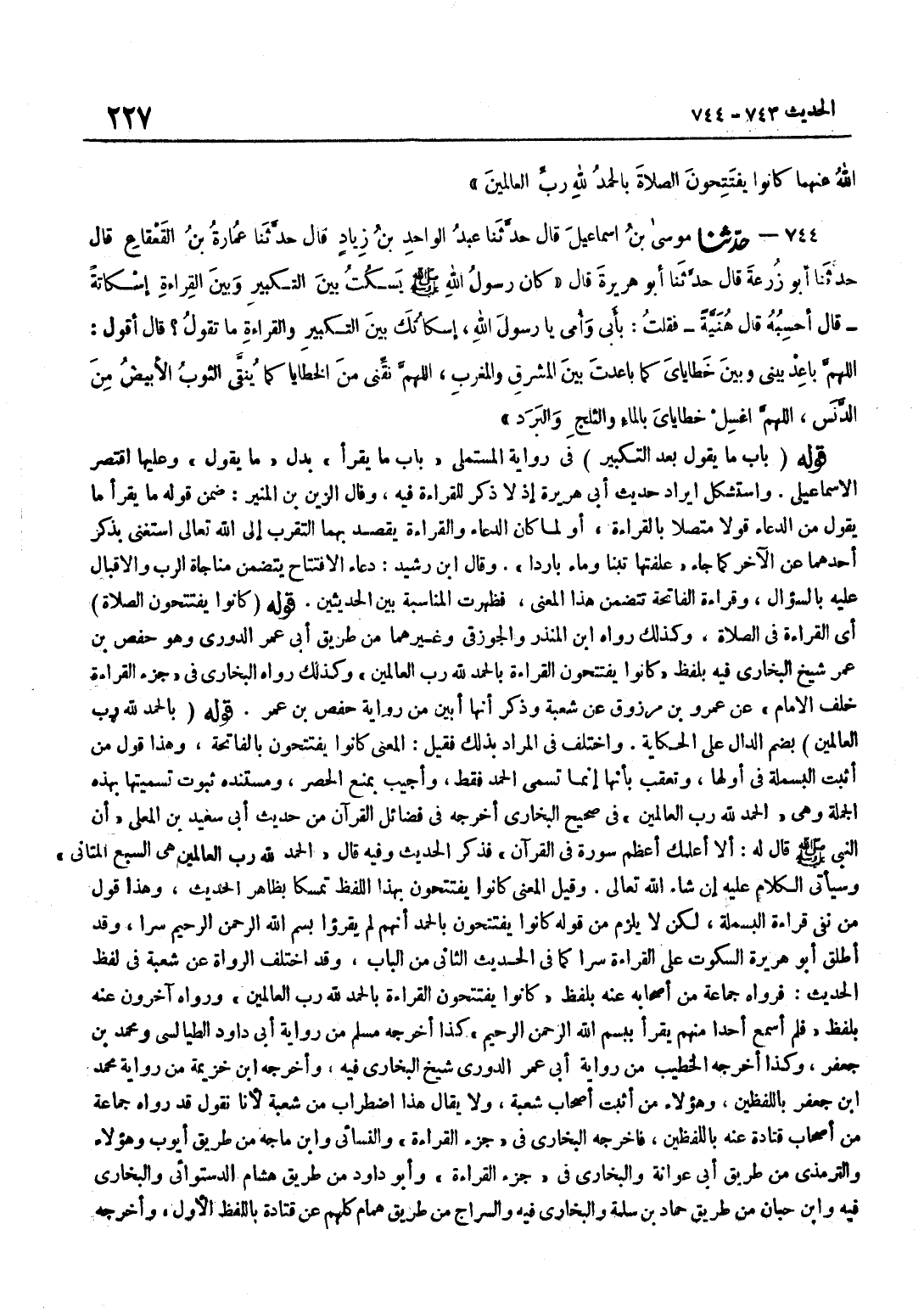 [743] قَوْلُهُ كَانُوا يَفْتَتِحُونَ الصَّلَاةَ أَيِ الْقِرَاءَةَ فِي الصَّلَاةِ وَكَذَلِكَ رَوَاهُ بن الْمُنْذِرِ وَالْجَوْزَقِيُّ وَغَيْرُهُمَا مِنْ طَرِيقِ أَبِي عُمَرَ الدَّوْرِيِّ وَهُوَ حَفْصُ بْنُ عُمَرَ شَيْخُ الْبُخَارِيِّ فِيهِ بِلَفْظٍ كَانُوا يفتتحون الْقِرَاءَة بِالْحَمْد لِلَّهِ رَبِّ الْعَالَمِينَ وَكَذَلِكَ رَوَاهُ الْبُخَارِيُّ فِي جُزْءِ الْقِرَاءَةِ خَلْفَ الْإِمَامِ عَنْ عَمْرِو بْنِ مَرْزُوقٍ عَنْ شُعْبَةَ وَذَكَرَ أَنَّهَا أَبْيَنُ مِنْ رِوَايَة حَفْص بن عمر قَوْله بِالْحَمْد لِلَّهِ رَبِّ الْعَالَمِينَ بِضَمِّ الدَّالِ عَلَى الْحِكَايَةِ وَاخْتُلِفَ فِي الْمُرَادِ بِذَلِكَ فَقِيلَ الْمَعْنَى كَانُوا يَفْتَتِحُونَ بِالْفَاتِحَةِ وَهَذَا قَوْلُ مَنْ أَثْبَتَ الْبَسْمَلَةَ فِي أَوَّلِهَا وَتُعُقِّبَ بِأَنَّهَا إِنَّمَا تُسَمَّى الْحَمْدَ فَقَطْ وَأُجِيبَ بِمَنْعِ الْحَصْرِ وَمُسْتَنَدُهُ ثُبُوتُ تَسْمِيَتِهَا بِهَذِهِ الْجُمْلَةِ وَهِيَ الْحَمْدُ لِلَّهِ رَبِّ الْعَالَمِينَ فِي صَحِيحِ الْبُخَارِيِّ أَخْرَجَهُ فِي فَضَائِلِ الْقُرْآنِ مِنْ حَدِيثِ أَبِي سَعِيدِ بْنِ الْمُعَلَّى أَنَّ النَّبِيَّ صَلَّى اللَّهُ عَلَيْهِ وَسَلَّمَ قَالَ لَهُ أَلَا أُعَلِّمُكَ أَعْظَمَ سُورَةٍ فِي الْقُرْآنِ فَذَكَرَ الْحَدِيثَ وَفِيهِ قَالَ الْحَمْدُ لِلَّهِ رَبِّ الْعَالَمِينَ هِيَ السَّبْعُ الْمَثَانِي وَسَيَأْتِي الْكَلَامُ عَلَيْهِ إِنْ شَاءَ اللَّهُ تَعَالَى وَقِيلَ الْمَعْنَى كَانُوا يَفْتَتِحُونَ بِهَذَا اللَّفْظِ تَمَسُّكًا بِظَاهِرِ الْحَدِيثِ وَهَذَا قَوْلُ مَنْ نَفَى قِرَاءَةَ الْبَسْمَلَةِ لَكِنْ لَا يَلْزَمُ مِنْ قَوْلِهِ كَانُوا يَفْتَتِحُونَ بِالْحَمْدِ أَنَّهُمْ لَمْ يقرؤا بِسْمِ اللَّهِ الرَّحْمَنِ الرَّحِيمِ سِرًّا وَقَدْ أَطْلَقَ أَبُو هُرَيْرَةَ السُّكُوتَ عَلَى الْقِرَاءَةِ سِرًّا كَمَا فِي الْحَدِيثِ الثَّانِي مِنَ الْبَابِ وَقَدِ اخْتَلَفَ الرُّوَاةُ عَنْ شُعْبَةَ فِي لَفْظِ الْحَدِيثِ فَرَوَاهُ جَمَاعَةٌ مِنْ أَصْحَابِهِ عَنْهُ بِلَفْظِ كَانُوا يَفْتَتِحُونَ الْقِرَاءَة بِالْحَمْد لله رب الْعَالمين وَرَوَاهُ آخَرُونَ عَنْهُ بِلَفْظِ فَلَمْ أَسْمَعْ أَحَدًا مِنْهُمْ يَقْرَأُ بِبِسْمِ اللَّهِ الرَّحْمَنِ الرَّحِيمِ كَذَا أَخْرَجَهُ مُسْلِمٌ مِنْ رِوَايَةِ أَبِي دَاوُدَ الطَّيَالِسِيِّ وَمُحَمَّدُ بْنُ جَعْفَرٍ وَكَذَا أَخْرَجَهُ الْخَطِيبُ مِنْ رِوَايَةِ أَبِي عُمَرَ الدَّوْرِيِّ شَيْخِ الْبُخَارِيِّ فِيهِ وَأخرجه بن خُزَيْمَةَ مِنْ رِوَايَةِ مُحَمَّدِ بْنِ جَعْفَرٍ بِاللَّفْظَيْنِ وَهَؤُلَاءِ مِنْ أَثْبَتِ أَصْحَابِ شُعْبَةَ وَلَا يُقَالُ هَذَا اضْطِرَابٌ مِنْ شُعْبَةَ لِأَنَّا نَقُولُ قَدْ رَوَاهُ جَمَاعَةٌ مِنْ أَصْحَابِ قَتَادَةَ عَنْهُ بِاللَّفْظَيْنِ فَأخْرجهُ البُخَارِيّ فِي جُزْء الْقِرَاءَة وَالنَّسَائِيّ وبن مَاجَهْ مِنْ طَرِيقِ أَيُّوبَ وَهَؤُلَاءِ وَالتِّرْمِذِيُّ مِنْ طَرِيقِ أَبِي عَوَانَةَ وَالْبُخَارِيُّ فِي جُزْءِ الْقِرَاءَةِ وَأَبُو دَاوُدَ مِنْ طَرِيقِ هِشَامٍ الدَّسْتُوَائِيِّ وَالْبُخَارِيُّ فِيهِ وبن حِبَّانَ مِنْ طَرِيقِ حَمَّادِ بْنِ سَلَمَةَ وَالْبُخَارِيُّ فِيهِ وَالسَّرَّاجُ مِنْ طَرِيقِ هَمَّامٍ كُلُّهُمْ عَنْ قَتَادَةَ بِاللَّفْظِ الْأَوَّلِ وَأَخْرَجَهُ