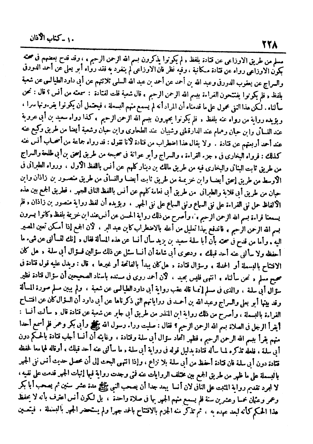 مُسْلِمٌ مِنْ طَرِيقِ الْأَوْزَاعِيِّ عَنْ قَتَادَةَ بِلَفْظِ لَمْ يَكُونُوا يَذْكُرُونَ بِسْمِ اللَّهِ الرَّحْمَنِ الرَّحِيمِ وَقَدْ قَدَحَ بَعْضُهُمْ فِي صِحَّتِهِ بِكَوْنِ الْأَوْزَاعِيِّ رَوَاهُ عَنْ قَتَادَةَ مُكَاتَبَةً وَفِيهِ نَظَرٌ فَإِنَّ الْأَوْزَاعِيَّ لَمْ يَنْفَرِدْ بِهِ فَقَدْ رَوَاهُ أَبُو يَعْلَى عَنْ أَحْمَدَ الدَّوْرَقِيِّ وَالسَّرَّاجُ عَنْ يَعْقُوبَ الدَّوْرَقِيِّ وَعَبْدُ اللَّهِ بْنُ أَحْمَدَ بْنِ عَبْدِ اللَّهِ السُّلَمِيِّ ثَلَاثَتُهُمْ عَنْ أَبِي دَاوُدَ الطَّيَالِسِيِّ عَنْ شُعْبَةَ بِلَفْظِ فَلَمْ يَكُونُوا يَفْتَتِحُونَ الْقِرَاءَةَ بِبِسْمِ اللَّهِ الرَّحْمَنِ الرَّحِيمِ قَالَ شُعْبَةُ قُلْتُ لِقَتَادَةَ سَمِعْتُهُ مِنْ أَنَسٍ قَالَ نَحْنُ سَأَلْنَاهُ لَكِنَّ هَذَا النَّفْيَ مَحْمُولٌ عَلَى مَا قَدَّمْنَاهُ أَنَّ الْمُرَادَ أَنَّهُ لَمْ يُسْمَعْ مِنْهُمُ الْبَسْمَلَةُ فَيُحْتَمَلُ أَنْ يَكُونُوا يَقْرَءُونَهَا سِرًّا وَيُؤَيِّدُهُ رِوَايَةُ مَنْ رَوَاهُ عَنْهُ بِلَفْظِ فَلَمْ يَكُونُوا يَجْهَرُونَ بِبِسْمِ اللَّهِ الرَّحْمَنِ الرَّحِيمِ كَذَا رَوَاهُ سَعِيدُ بن أبي عرُوبَة عِنْد النَّسَائِيّ وبن حِبَّانَ وَهَمَّامٌ عِنْدَ الدَّارَقُطْنِيِّ وَشَيْبَانُ عِنْدَ الطَّحَاوِيِّ وبن حِبَّانَ وَشُعْبَةُ أَيْضًا مِنْ طَرِيقِ وَكِيعٍ عَنْهُ عِنْدَ أَحْمَدَ أَرْبَعَتُهُمْ عَنْ قَتَادَةَ وَلَا يُقَالُ هَذَا اضْطِرَابٌ مِنْ قَتَادَةَ لِأَنَّا نَقُولُ قَدْ رَوَاهُ جَمَاعَةٌ مِنْ أَصْحَابِ أَنَسٍ عَنْهُ كَذَلِكَ فَرَوَاهُ الْبُخَارِيُّ فِي جُزْءِ الْقِرَاءَةِ وَالسَّرَّاجُ وَأَبُو عَوَانَةَ فِي صَحِيحِهِ مِنْ طَرِيقِ إِسْحَاقَ بْنِ أَبِي طَلْحَةَ وَالسَّرَّاجُ مِنْ طَرِيقِ ثَابِتٍ الْبُنَانِيِّ وَالْبُخَارِيُّ فِيهِ مِنْ طَرِيقِ مَالِكِ بْنِ دِينَارٍ كُلُّهُمْ عَنْ أَنَسٍ بِاللَّفْظِ الْأَوَّلِ وَرَوَاهُ الطَّبَرَانِيُّ فِي الْأَوْسَط من طَرِيق إِسْحَاق أَيْضا وبن خُزَيْمَةَ مِنْ طَرِيقِ ثَابِتٍ أَيْضًا وَالنَّسَائِيُّ مِنْ طَرِيق مَنْصُور بن زَاذَان وبن حِبَّانَ مِنْ طَرِيقِ أَبِي قِلَابَةَ والطَّبَرَانِيُّ مِنْ طَرِيقِ أَبِي نَعَامَةَ كُلُّهُمْ عَنْ أَنَسٍ بِاللَّفْظِ النَّافِي لِلْجَهْرِ فَطَرِيقُ الْجَمْعِ بَيْنَ هَذِهِ الْأَلْفَاظِ حَمَلُ نَفْيِ الْقِرَاءَةِ عَلَى نَفْيِ السَّمَاعِ وَنَفْيِ السَّمَاعِ عَلَى نَفْيِ الْجَهْرِ وَيُؤَيِّدُهُ أَنَّ لَفْظَ رِوَايَةِ مَنْصُورِ بْنِ زَاذَانَ فَلَمْ يُسْمِعْنَا قِرَاءَةَ بِسْمِ اللَّهِ الرَّحْمَنِ الرَّحِيمِ وَأَصْرَحُ مِنْ ذَلِكَ رِوَايَة الْحسن عَن أنس عِنْد بن خُزَيْمَةَ بِلَفْظِ كَانُوا يُسِرُّونَ بِسْمِ اللَّهِ الرَّحْمَنِ الرَّحِيمِ فَانْدَفَعَ بِهَذَا تَعْلِيلُ مَنْ أَعَلَّهُ بِالِاضْطِرَابِ كَابْنِ عَبْدِ الْبَرِّ لِأَنَّ الْجَمْعَ إِذَا أَمْكَنَ تَعَيَّنَ الْمَصِيرُ إِلَيْهِ وَأَمَّا مَنْ قَدَحَ فِي صِحَّتِهِ بِأَنَّ أَبَا سَلَمَةَ سَعِيدُ بْنُ يَزِيدَ سَأَلَ أَنَسًا عَنْ هَذِهِ الْمَسْأَلَةِ فَقَالَ إِنَّكَ لَتَسْأَلُنِي عَنْ شَيْءٍ مَا أَحْفَظُهُ وَلَا سَأَلَنِي عَنْهُ أَحَدٌ قَبْلَكَ وَدَعْوَى أَبِي شَامَةَ أَنَّ أَنَسًا سُئِلَ عَنْ ذَلِكَ سُؤَالَيْنِ فَسُؤَالُ أَبِي سَلَمَةَ هَلْ كَانَ الِافْتِتَاحُ بِالْبَسْمَلَةِ أَوِ الْحَمْدَلَةِ وَسُؤَالُ قَتَادَةَ هَلْ كَانَ يَبْدَأُ بِالْفَاتِحَةِ أَوْ غَيْرِهَا قَالَ وَيَدُلُّ عَلَيْهِ قَوْلُ قَتَادَةَ فِي صَحِيحِ مُسْلِمٍ نَحْنُ سَأَلْنَاهُ انْتَهَى فَلَيْسَ بِجَيِّدٍ لِأَنَّ أَحْمَدَ رَوَى فِي مُسْنَدِهِ بِإِسْنَادِ الصَّحِيحَيْنِ أَنَّ سُؤَالَ قَتَادَةَ نَظِيرُ سُؤَالِ أَبِي سَلَمَةَ وَالَّذِي فِي مُسْلِمٍ إِن