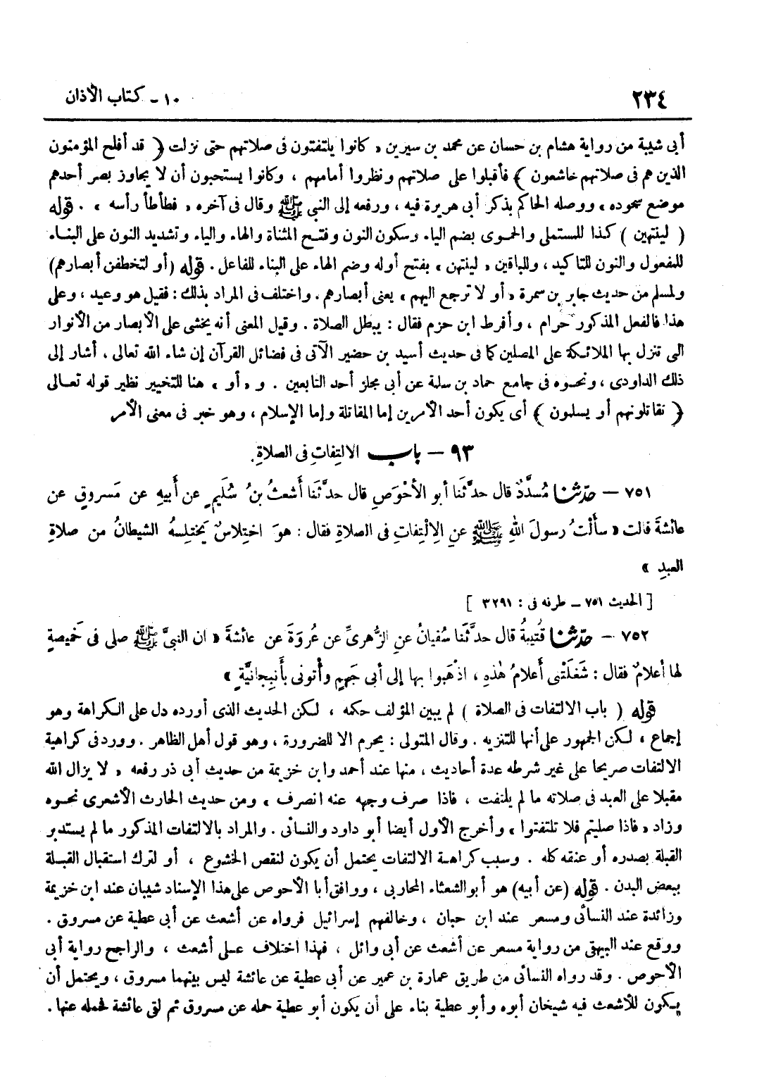 أَبِي شَيْبَةَ مِنْ رِوَايَةِ هِشَامِ بْنِ حَسَّانَ عَنْ مُحَمَّدِ بْنِ سِيرِينَ كَانُوا يَلْتَفِتُونَ فِي صَلَاتِهِمْ حَتَّى نَزَلَتْ قَدْ أَفْلَحَ الْمُؤْمِنُونَ الَّذِينَ هم فِي صلَاتهم خاشعون فَأَقْبَلُوا عَلَى صَلَاتِهِمْ وَنَظَرُوا أَمَامَهُمْ وَكَانُوا يَسْتَحِبُّونَ أَنْ لَا يُجَاوِزَ بَصَرُ أَحَدِهِمْ مَوْضِعَ سُجُودِهِ وَوَصَلَهُ الْحَاكِمُ بِذِكْرِ أَبِي هُرَيْرَةَ فِيهِ وَرَفَعَهُ إِلَى النَّبِيِّ صَلَّى اللَّهُ عَلَيْهِ وَسَلَّمَ وَقَالَ فِي آخِرِهِ فَطَأْطَأَ رَأْسَهُ قَوْلُهُ لَيُنْتَهَيَنَّ كَذَا لِلْمُسْتَمْلِي وَالْحَمَوِيِّ بِضَمِّ الْيَاءِ وَسُكُونِ النُّونِ وَفَتْحِ الْمُثَنَّاةِ وَالْهَاءِ وَالْيَاءِ وَتَشْدِيدِ النُّونِ عَلَى الْبِنَاءِ لِلْمَفْعُولِ وَالنُّونُ لِلتَّأْكِيدِ وَلِلْبَاقِينَ لَيَنْتَهُنَّ بِفَتْحِ أَوَّلِهِ وَضَمِّ الْهَاءِ عَلَى الْبِنَاءِ لِلْفَاعِلِ قَوْلُهُ أَوْ لَتُخْطَفَنَّ أَبْصَارُهُمْ وَلِمُسْلِمٍ مِنْ حَدِيثِ جَابِرِ بْنِ سَمُرَة أَولا لَا تَرْجِعُ إِلَيْهِمْ يَعْنِي أَبْصَارَهُمْ وَاخْتُلِفَ فِي الْمُرَادِ بِذَلِكَ فَقِيلَ هُوَ وَعِيدٌ وَعَلَى هَذَا فالفعل الْمَذْكُور حرَام وأفرط بن حَزْمٍ فَقَالَ يُبْطِلُ الصَّلَاةَ وَقِيلَ الْمَعْنَى أَنَّهُ يخْشَى على الْأَبْصَار من الْأَنْوَار إِلَى تَنْزِلُ بِهَا الْمَلَائِكَةُ عَلَى الْمُصَلِّينَ كَمَا فِي حَدِيثِ أُسَيْدِ بْنِ حُضَيْرٍ الْآتِي فِي فَضَائِلِ الْقُرْآنِ إِنْ شَاءَ اللَّهُ تَعَالَى أَشَارَ إِلَى ذَلِكَ الدَّاوُدِيُّ وَنَحْوُهُ فِي جَامِعِ حَمَّادِ بْنِ سَلمَة عَن أبي مجلز أحد التَّابِعين وأو هُنَا لِلتَّخْيِيرِ نَظِيرُ قَوْلِهِ تَعَالَى تُقَاتِلُونَهُمْ أَوْ يسلمُونَ أَيْ يَكُونُ أَحَدُ الْأَمْرَيْنِ إِمَّا الْمُقَاتَلَةُ وَإِمَّا الْإِسْلَام وَهُوَ خبر فِي معنى الْأَمر صلى فِي خميصة لَهَا أَعْلَام فَقَالَ شغلتني أَعْلَام هَذِه اذْهَبُوا بهَا إِلَى أبي جهم وأتوني بأنبجانية