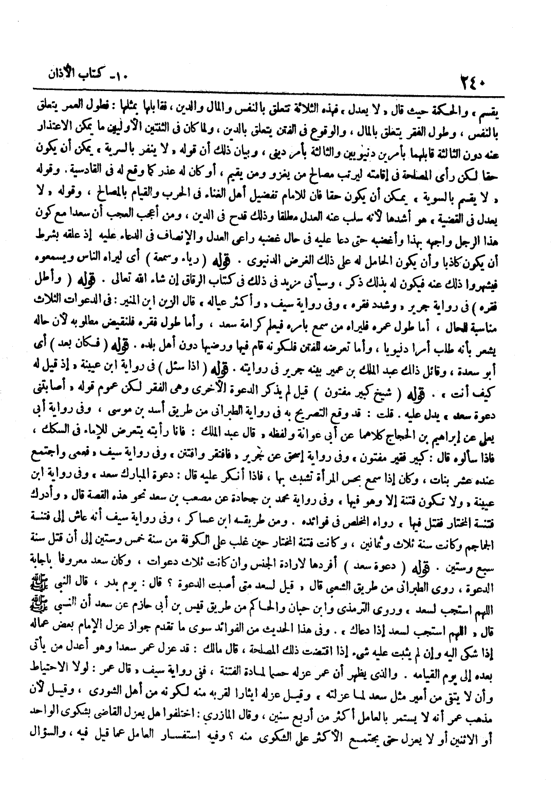 يَقْسِمُ وَالْحِكْمَةُ حَيْثُ قَالَ لَا يَعْدِلُ فَهَذِهِ الثَّلَاثَةُ تَتَعَلَّقُ بِالنَّفْسِ وَالْمَالِ وَالدِّينِ فَقَابَلَهَا بِمِثْلِهَا فَطُولُ الْعُمْرِ يَتَعَلَّقُ بِالنَّفْسِ وَطُولُ الْفَقْرِ يَتَعَلَّقُ بِالْمَالِ وَالْوُقُوعُ فِي الْفِتَنِ يَتَعَلَّقُ بِالدِّينِ وَلَمَّا كَانَ فِي الثِّنْتَيْنِ الْأُولَيَيْنِ مَا يُمْكِنُ الِاعْتِذَارُ عَنْهُ دُونَ الثَّالِثَةِ قَابَلَهُمَا بِأَمْرَيْنِ دُنْيَوِيَّيْنِ وَالثَّالِثَةَ بِأَمْرٍ دِينِيٍّ وَبَيَانُ ذَلِكَ أَنَّ قَوْلَهُ لَا يَنْفِرُ بِالسَّرِيَّةِ يُمْكِنُ أَنْ يَكُونَ حَقًّا لَكِنْ رَأَى الْمَصْلَحَةَ فِي إِقَامَتِهِ لِيُرَتِّبَ مَصَالِحَ مَنْ يَغْزُو وَمَنْ يُقِيمُ أَوْ كَانَ لَهُ عُذْرٌ كَمَا وَقع لَهُ فِي الْقَادِسِيَّةِ وَقَوْلُهُ لَا يَقْسِمُ بِالسَّوِيَّةِ يُمْكِنُ أَنْ يَكُونَ حَقًّا فَإِنَّ لِلْإِمَامِ تَفْضِيلَ أَهْلِ الْغَنَاءِ فِي الْحَرْبِ وَالْقِيَامِ بِالْمَصَالِحِ وَقَوْلُهُ لَا يَعْدِلُ فِي الْقَضِيَّةِ هُوَ أَشَدُّهَا لِأَنَّهُ سَلَبَ عَنْهُ الْعَدْلَ مُطْلَقًا وَذَلِكَ قَدْحٌ فِي الدِّينِ وَمِنْ أَعْجَبِ الْعَجَبِ أَنَّ سَعْدًا مَعَ كَوْنِ هَذَا الرَّجُلِ وَاجَهَهُ بِهَذَا وَأَغْضَبَهُ حَتَّى دَعَا عَلَيْهِ فِي حَالِ غَضَبِهِ رَاعَى الْعَدْلَ وَالْإِنْصَافَ فِي الدُّعَاءِ عَلَيْهِ إِذْ عَلَّقَهُ بِشَرْطِ أَنْ يَكُونَ كَاذِبًا وَأَنْ يَكُونَ الْحَامِلُ لَهُ عَلَى ذَلِكَ الْغَرَضُ الدُّنْيَوِيُّ قَوْلُهُ رِيَاءً وَسُمْعَةً أَيْ لِيَرَاهُ النَّاسُ وَيَسْمَعُوهُ فَيُشْهِرُوا ذَلِكَ عَنْهُ فَيَكُونَ لَهُ بِذَلِكَ ذِكْرٌ وَسَيَأْتِي مَزِيدٌ فِي ذَلِكَ فِي كِتَابِ الرِّقَاقِ إِنْ شَاءَ اللَّهُ تَعَالَى قَوْلُهُ وَأَطِلْ فَقْرَهُ فِي رِوَايَةِ جَرِيرٍ وَشَدِّدْ فَقْرَهُ وَفِي رِوَايَةِ سَيْفٍ وَأَكْثِرْ عِيَالَهُ قَالَ الزَّيْنُ بْنُ الْمُنِيرِ فِي الدَّعَوَاتِ الثَّلَاثِ مُنَاسَبَةٌ لِلْحَالِ أَمَّا طُولُ عُمْرِهِ فَلِيَرَاهُ مَنْ سَمِعَ بِأَمْرِهِ فَيَعْلَمَ كَرَامَةَ سَعْدٍ وَأَمَّا طُولُ فَقْرِهِ فَلِنَقِيضِ مَطْلُوبِهِ لِأَنَّ حَالَهُ يُشْعِرُ بِأَنَّهُ طَلَبَ أَمْرًا دُنْيَوِيًّا وَأَمَّا تَعَرُّضُهُ لِلْفِتَنِ فَلِكَوْنِهِ قَامَ فِيهَا وَرَضِيَهَا دُونَ أَهْلِ بَلَدِهِ قَوْلُهُ فَكَانَ بَعْدُ أَيْ أَبُو سَعْدَةَ وَقَائِلُ ذَلِكَ عَبْدُ الْمَلِكِ بْنُ عُمَيْرٍ بَيَّنَهُ جَرِيرٌ فِي رِوَايَتِهِ قَوْله إِذا سُئِلَ فِي رِوَايَة بن عُيَيْنَةَ إِذْ قِيلَ لَهُ كَيْفَ أَنْتَ قَوْلُهُ شَيْخٌ كَبِيرٌ مَفْتُونٌ قِيلَ لَمْ يَذْكُرِ الدَّعْوَةَ الْأُخْرَى وَهِيَ الْفَقْرُ لَكِنَّ عُمُومَ قَوْلِهِ أَصَابَتْنِي دَعْوَةُ سَعْدٍ يَدُلُّ عَلَيْهِ قُلْتُ قَدْ وَقَعَ التَّصْرِيحُ بِهِ فِي رِوَايَةِ الطَّبَرَانِيِّ مِنْ طَرِيقِ أَسَدِ بْنِ مُوسَى وَفِي رِوَايَةِ أَبِي يَعْلَى عَنْ إِبْرَاهِيمَ بْنِ الْحَجَّاجِ كِلَاهُمَا عَنْ أَبِي عَوَانَةَ وَلَفْظُهُ قَالَ عَبْدُ الْمَلِكِ فَأَنَا رَأَيْتُهُ يَتَعَرَّضُ لِلْإِمَاءِ فِي السِّكَكِ فَإِذَا سَأَلُوهُ قَالَ كَبِيرٌ فَقِيرٌ مَفْتُونٌ وَفِي رِوَايَةِ إِسْحَاقَ عَنْ جَرِيرٍ فَافْتَقَرَ وَافْتُتِنَ وَفِي رِوَايَةِ سَيْفٍ فَعَمِيَ وَاجْتَمَعَ عِنْدَهُ عَشْرُ بَنَاتٍ وَكَانَ إِذَا سَمِعَ بِحِسِّ الْمَرْأَةِ تَشَبَّثَ بِهَا فَإِذَا أُنْكِرَ عَلَيْهِ قَالَ دَعْوَة الْمُبَارك سعد وَفِي رِوَايَة بن عُيَيْنَةَ وَلَا تَكُونُ فِتْنَةٌ إِلَّا وَهُوَ فِيهَا وَفِي رِوَايَةِ مُحَمَّدِ بْنِ جُحَادَةَ عَنْ مُصْعَبِ بْنِ سَعْدٍ نَحْوُ هَذِهِ الْقِصَّةِ قَالَ وَأَدْرَكَ فِتْنَةَ الْمُخْتَارِ فَقُتِلَ فِيهَا رَوَاهُ الْمُخَلِّصُ فِي فَوَائده وَمن طَ