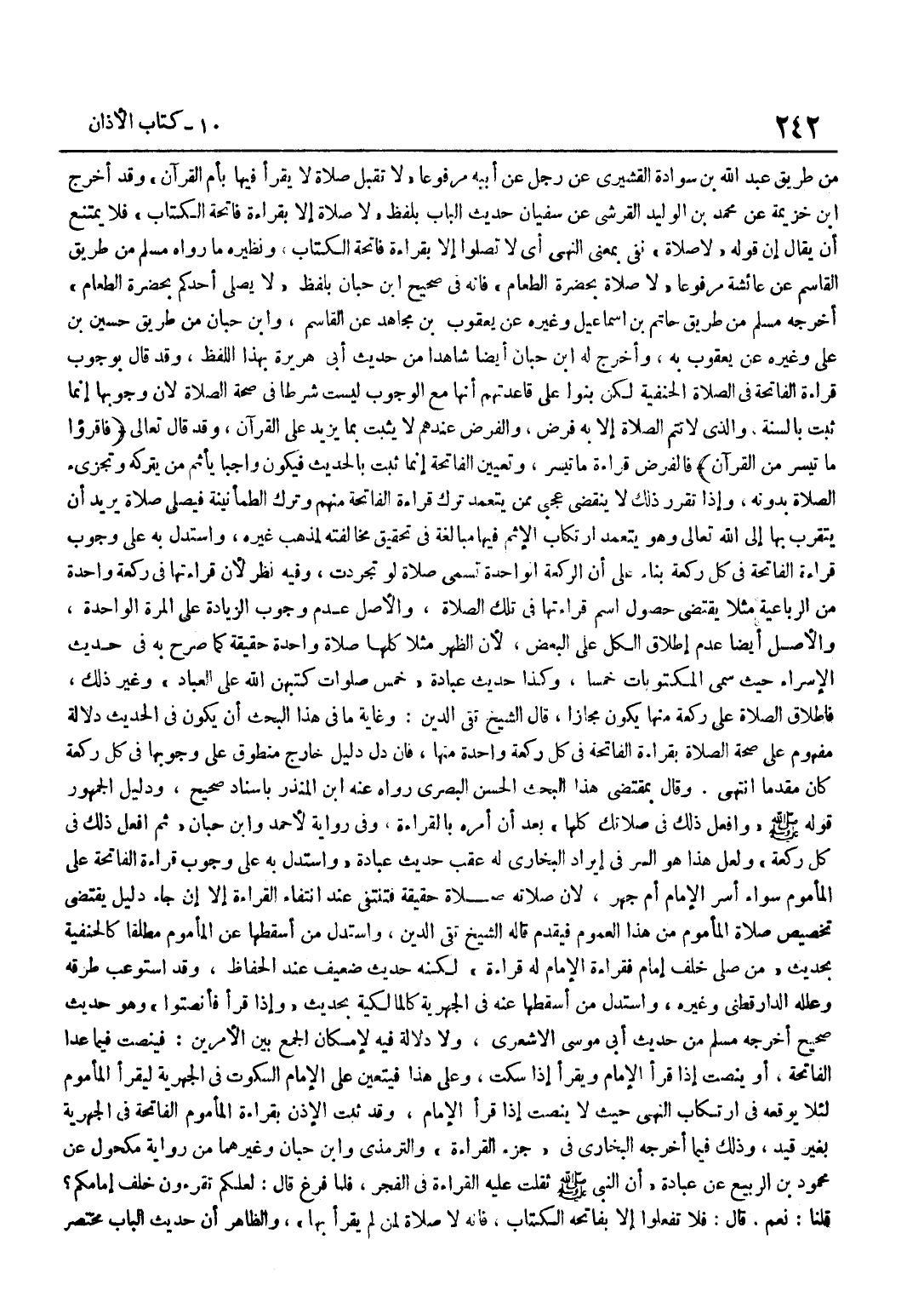 مِنْ طَرِيقِ عَبْدِ اللَّهِ بْنِ سَوَادَةَ الْقُشَيْرِيِّ عَنْ رَجُلٍ عَنْ أَبِيهِ مَرْفُوعًا لَا تُقْبَلُ صَلَاةٌ لَا يُقْرَأُ فِيهَا بِأُمِّ الْقُرْآنِ وَقَدْ أخرج بن خُزَيْمَةَ عَنْ مُحَمَّدِ بْنِ الْوَلِيدِ الْقُرَشِيِّ عَنْ سُفْيَانَ حَدِيثَ الْبَابِ بِلَفْظِ لَا صَلَاةَ إِلَّا بِقِرَاءَة فَاتِحَة الْكتاب فَلَا يمْتَنع أَنْ يُقَالَ إِنَّ قَوْلَهُ لَا صَلَاةَ نَفْيٌ بِمَعْنَى النَّهْيِ أَيْ لَا تُصَلُّوا إِلَّا بِقِرَاءَةِ فَاتِحَةِ الْكِتَابِ وَنَظِيرُهُ مَا رَوَاهُ مُسْلِمٌ مِنْ طَرِيقِ الْقَاسِمِ عَنْ عَائِشَةَ مَرْفُوعًا لَا صَلَاةَ بِحَضْرَة الطَّعَام فَإِنَّهُ فِي صَحِيح بن حِبَّانَ بِلَفْظِ لَا يُصَلِّي أَحَدُكُمْ بِحَضْرَةِ الطَّعَامِ أَخْرَجَهُ مُسْلِمٌ مِنْ طَرِيقِ حَاتِمِ بْنِ إِسْمَاعِيلَ وَغَيْرِهِ عَنْ يَعْقُوبَ بْنِ مُجَاهِدٍ عَنِ الْقَاسِمِ وبن حِبَّانَ مِنْ طَرِيقِ حُسَيْنِ بْنِ عَلِيٍّ وَغَيْرِهِ عَن يَعْقُوب بِهِ وَأخرج لَهُ بن حِبَّانَ أَيْضًا شَاهِدًا مِنْ حَدِيثِ أَبِي هُرَيْرَةَ بِهَذَا اللَّفْظِ وَقَدْ قَالَ بِوُجُوبِ قِرَاءَةِ الْفَاتِحَةِ فِي الصَّلَاةِ الْحَنَفِيَّةُ لَكِنْ بَنَوْا عَلَى قَاعِدَتِهِمْ أَنَّهَا مَعَ الْوُجُوبِ لَيْسَتْ شَرْطًا فِي صِحَّةِ الصَّلَاةِ لِأَنَّ وُجُوبَهَا إِنَّمَا ثَبَتَ بِالسُّنَّةِ وَالَّذِي لَا تَتِمُّ الصَّلَاةُ إِلَّا بِهِ فَرْضٌ وَالْفَرْضُ عِنْدَهُمْ لَا يَثْبُتُ بِمَا يَزِيدُ عَلَى الْقُرْآنِ وَقد قَالَ تَعَالَى فاقرؤوا مَا تيَسّر من الْقُرْآن فَالْفَرْضُ قِرَاءَةُ مَا تَيَسَّرَ وَتَعْيِينُ الْفَاتِحَةِ إِنَّمَا ثَبَتَ بِالْحَدِيثِ فَيَكُونُ وَاجِبًا يَأْثَمُ مَنْ يَتْرُكُهُ وَتُجْزِئُ الصَّلَاةُ بِدُونِهِ وَإِذَا تَقَرَّرَ ذَلِكَ لَا يَنْقَضِي عَجَبِي مِمَّنْ يَتَعَمَّدُ تَرْكَ قِرَاءَةِ الْفَاتِحَةِ مِنْهُمْ وَتَرْكَ الطُّمَأْنِينَةِ فَيُصَلِّي صَلَاةً يُرِيدُ أَنْ يَتَقَرَّبَ بِهَا إِلَى اللَّهِ تَعَالَى وَهُوَ يَتَعَمَّدُ ارْتِكَابَ الْإِثْمِ فِيهَا مُبَالَغَةً فِي تَحْقِيقِ مُخَالَفَتِهِ لِمَذْهَبِ غَيْرِهِ وَاسْتُدِلَّ بِهِ عَلَى وُجُوبِ قِرَاءَةِ الْفَاتِحَةِ فِي كُلِّ رَكْعَةٍ بِنَاءً عَلَى أَنَّ الرَّكْعَةَ الْوَاحِدَةَ تُسَمَّى صَلَاةً لَوْ تَجَرَّدَتْ وَفِيهِ نَظَرٌ لِأَنَّ قِرَاءَتَهَا فِي رَكْعَةٍ وَاحِدَةٍ مِنَ الرُّبَاعِيَّةِ مَثَلًا يَقْتَضِي حُصُولَ اسْمِ قِرَاءَتِهَا فِي تِلْكَ الصَّلَاةِ وَالْأَصْلُ عَدَمُ وُجُوبِ الزِّيَادَةِ عَلَى الْمَرَّةِ الْوَاحِدَةِ وَالْأَصْلُ أَيْضًا عَدَمُ إِطْلَاقِ الْكُلِّ عَلَى الْبَعْضِ لِأَنَّ الظُّهْرَ مَثَلًا كُلَّهَا صَلَاةٌ وَاحِدَةٌ حَقِيقَةً كَمَا صَرَّحَ بِهِ فِي حَدِيثِ الْإِسْرَاءِ حَيْثُ سَمَّى الْمَكْتُوبَاتِ خَمْسًا وَكَذَا حَدِيثُ عُبَادَةَ خَمْسُ صَلَوَاتٍ كَتَبَهُنَّ اللَّهُ عَلَى الْعِبَادِ وَغَيْرُ ذَلِكَ فَإِطْلَاقُ الصَّلَاةِ عَلَى رَكْعَةٍ مِنْهَا يَكُونُ مَجَازًا قَالَ الشَّيْخُ تَقِيُّ الدِّينِ وَغَايَةُ مَا فِي هَذَا الْبَحْثِ أَنْ يَكُونَ فِي الْحَدِيثِ دَلَالَةُ مَفْهُومٍ عَلَى صِحَّةِ الصَّلَاةِ بِقِرَاءَةِ الْفَاتِحَةِ فِي كُلِّ رَكْعَةٍ وَاحِدَةٍ مِنْهَا فَإِنْ دَلَّ دَلِيلٌ خَارِجٌ مَنْطُوقٌ عَلَى وُجُوبِهَا فِي كُلِّ رَكْعَةٍ كَانَ مُقَدَّمًا انْتَهَى وَقَالَ بِمُقْتَضَى هَذَا الْبَحْث الْحسن الْبَصْرِيّ رَوَاهُ عَنهُ بن الْمُنْذِرِ بِإِسْنَادٍ صَحِيحٍ وَدَلِيلُ الْجُمْهُورِ قَوْلُهُ صَلَّى اللَّهُ عَلَيْهِ وَسَلَّمَ وَافْعَلْ ذَلِكَ فِي صَلَاتِكَ كُلِّهَا بَعْدَ أَنْ أَمَرَهُ بِالْقِرَاءَةِ وَفِي رِوَايَةٍ لِأَحْمَد وبن حِبَّانَ ثُمَّ افْعَلْ ذَلِكَ فِي كُلِّ رَكْعَةٍ وَلَعَلَّ هَذَا هُ