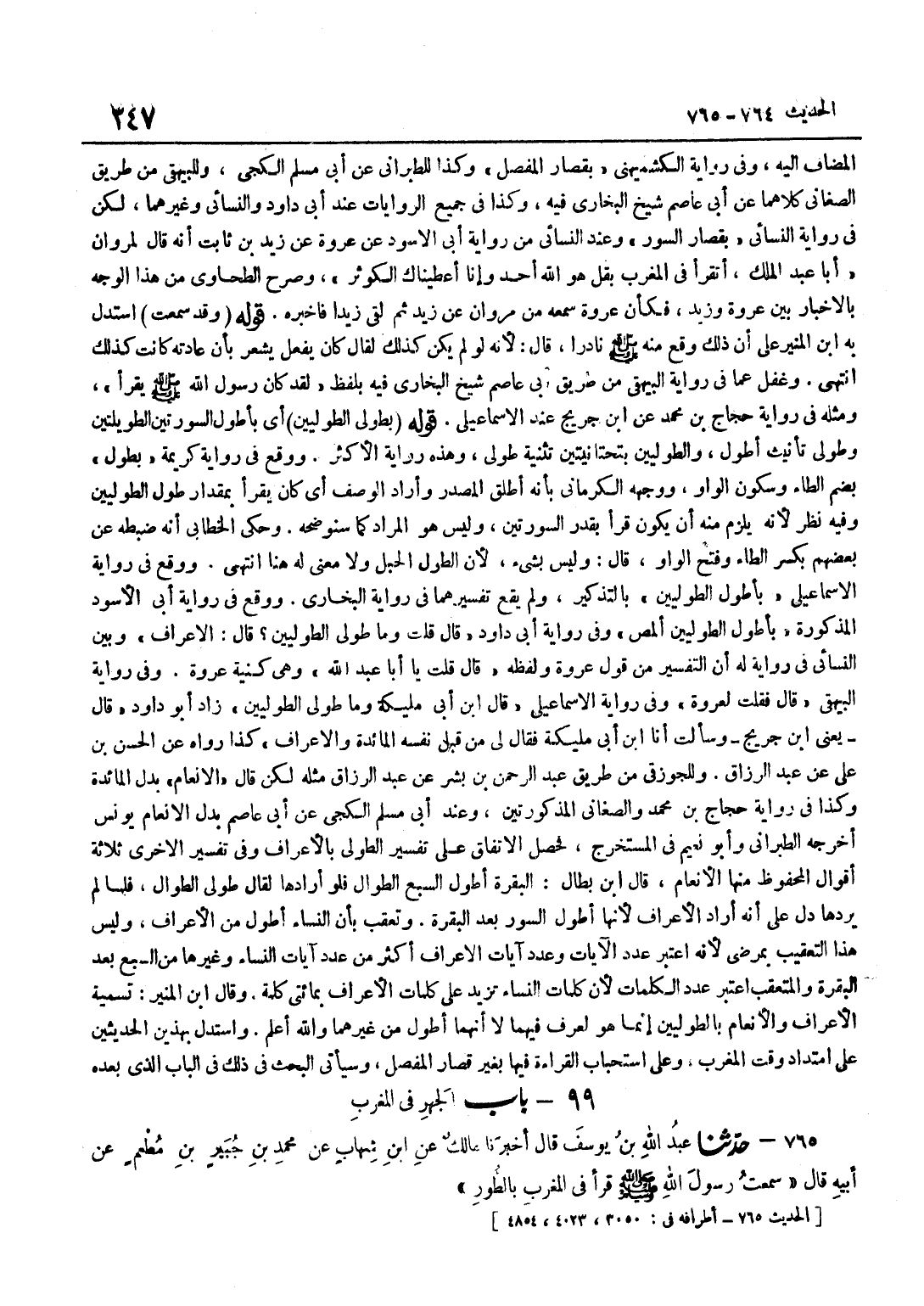 الْمُضَافِ إِلَيْهِ وَفِي رِوَايَةِ الْكُشْمِيهَنِيِّ بِقِصَارِ الْمُفَصَّلِ وَكَذَا لِلطَّبَرَانِيِّ عَنْ أَبِي مُسْلِمٍ الْكَجِّيِّ وَلِلْبَيْهَقِيِّ مِنْ طَرِيقِ الصَّغَانِيِّ كِلَاهُمَا عَنْ أَبِي عَاصِمٍ شَيْخِ الْبُخَارِيِّ فِيهِ وَكَذَا فِي جَمِيعِ الرِّوَايَاتِ عِنْدَ أَبِي دَاوُدَ وَالنَّسَائِيِّ وَغَيْرِهِمَا لَكِنْ فِي رِوَايَةِ النَّسَائِيِّ بِقِصَارِ السُّوَرِ وَعِنْدَ النَّسَائِيِّ مِنْ رِوَايَةِ أَبِي الْأُسُودِ عَنْ عُرْوَةَ عَنْ زَيْدِ بْنِ ثَابِتٍ أَنَّهُ قَالَ لِمَرْوَانَ أَبَا عَبْدِ الْمَلِكِ أَتَقْرَأُ فِي الْمَغْرِبِ بِقُلْ هُوَ اللَّهُ أَحَدٌ وَإِنَّا أَعْطَيْنَاكَ الْكَوْثَرَ وَصَرَّحَ الطَّحَاوِيُّ مِنْ هَذَا الْوَجْهِ بِالْإِخْبَارِ بَيْنَ عُرْوَةَ وَزَيْدٍ فَكَأَنَّ عُرْوَةَ سَمِعَهُ مِنْ مَرْوَانَ عَنْ زَيْدٍ ثُمَّ لَقِيَ زَيْدًا فَأَخْبَرَهُ قَوْلُهُ وَقَدْ سَمِعْتُ اسْتَدَلَّ بِهِ بن الْمُنِيرِ عَلَى أَنَّ ذَلِكَ وَقَعَ مِنْهُ صَلَّى اللَّهُ عَلَيْهِ وَسَلَّمَ نَادِرًا قَالَ لِأَنَّهُ لَوْ لَمْ يَكُنْ كَذَلِكَ لَقَالَ كَانَ يَفْعَلُ يُشْعِرُ بِأَنَّ عَادَتَهُ كَانَتْ كَذَلِكَ انْتَهَى وَغَفَلَ عَمَّا فِي رِوَايَةِ الْبَيْهَقِيِّ مِنْ طَرِيقِ أَبِي عَاصِمٍ شَيْخِ الْبُخَارِيِّ فِيهِ بِلَفْظِ لَقَدْ كَانَ رَسُولُ اللَّهِ صَلَّى اللَّهُ عَلَيْهِ وَسَلَّمَ يَقْرَأُ وَمِثْلُهُ فِي رِوَايَة حجاج بن مُحَمَّد عَن بن جُرَيْجٍ عِنْدَ الْإِسْمَاعِيلِيِّ قَوْلُهُ بِطُولَى الطُّولَيَيْنِ أَيْ بِأَطْوَلِ السُّورَتَيْنِ الطَّوِيلَتَيْنِ وَطُولَى تَأْنِيثُ أَطْوَلَ وَالطُّولَيَيْنِ بِتَحْتَانِيَّتَيْنِ تَثْنِيَةُ طُولَى وَهَذِهِ رِوَايَةُ الْأَكْثَرِ وَوَقَعَ فِي رِوَايَةِ كَرِيمَةَ بِطُولِ بِضَمِّ الطَّاءِ وَسُكُونِ الْوَاوِ وَوَجَّهَهُ الْكِرْمَانِيُّ بِأَنَّهُ أَطْلَقَ الْمَصْدَرَ وَأَرَادَ الْوَصْفَ أَيْ كَانَ يَقْرَأُ بِمِقْدَارِ طُولِ الطُّولَيَيْنِ وَفِيهِ نَظَرٌ لِأَنَّهُ يَلْزَمُ مِنْهُ أَنْ يَكُونَ قَرَأَ بِقَدْرِ السُّورَتَيْنِ وَلَيْسَ هُوَ الْمُرَادُ كَمَا سَنُوَضِّحُهُ وَحَكَى الْخَطَّابِيُّ أَنَّهُ ضَبَطَهُ عَنْ بَعْضِهِمْ بِكَسْرِ الطَّاءِ وَفَتْحِ الْوَاوِ قَالَ وَلَيْسَ بِشَيْءٍ لِأَنَّ الطِّوَلَ الْحَبْلُ وَلَا مَعْنَى لَهُ هُنَا انْتَهَى وَوَقَعَ فِي رِوَايَةِ الْإِسْمَاعِيلِيِّ بِأَطْوَلِ الطُّولَيَيْنِ بِالتَّذْكِيرِ وَلَمْ يَقَعْ تَفْسِيرُهُمَا فِي رِوَايَةِ الْبُخَارِيِّ وَوَقَعَ فِي رِوَايَةِ أَبِي الْأَسْوَدِ الْمَذْكُورَةِ بِأَطْوَلِ الطُّولَيَيْنِ المص وَفِي رِوَايَةِ أَبِي دَاوُدَ قَالَ قُلْتُ وَمَا طُولَى الطُّولَيَيْنِ قَالَ الْأَعْرَافُ وَبَيَّنَ النَّسَائِيُّ فِي رِوَايَةٍ لَهُ أَنَّ التَّفْسِيرَ مِنْ قَوْلِ عُرْوَةَ وَلَفْظُهُ قَالَ قُلْتُ يَا أَبَا عَبْدِ اللَّهِ وَهِيَ كُنْيَةُ عُرْوَةَ وَفِي رِوَايَةِ الْبَيْهَقِيِّ قَالَ فَقُلْتُ لِعُرْوَةَ وَفِي رِوَايَةِ الْإِسْمَاعِيلِيِّ قَالَ بن أَبِي مُلَيْكَةَ وَمَا طُولَى الطُّولَيَيْنِ زَادَ أَبُو دَاوُد قَالَ يَعْنِي بن جريج وَسَأَلت أَنا بن أَبِي مُلَيْكَةَ فَقَالَ لِي مِنْ قِبَلِ نَفْسِهِ الْمَائِدَةُ وَالْأَعْرَافُ كَذَا رَوَاهُ عَنِ الْحَسَنِ بْنِ عَلِيٍّ عَنْ عَبْدِ الرَّزَّاقِ وَلِلْجَوْزَقِيِّ مِنْ طَرِيقِ عَبْدِ الرَّحْمَنِ بْنِ بِشْرٍ عَنْ عَبْدِ الرَّزَّاقِ مِثْلُهُ لَكِنْ قَالَ الْأَنْعَامَ بَدَلَ الْمَائِدَةِ وَكَذَا فِي رِوَايَةِ حَجَّاجِ بْنِ مُحَمَّدٍ وَالصَّغَانِيُّ الْمَذْكُورَتَيْنِ وَعِنْدَ أَبِي مُسْلِمٍ الْكَجِّيِّ عَنْ أَبِي عَاصِمٍ بَدَلَ الْأَنْعَامِ يُونُسَ أَخْرَجَهُ الطَّبَرَانِيُّ وَأَبُو نُعَيْمٍ فِي