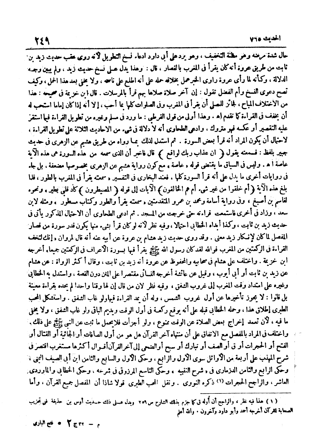 حَالِ شِدَّةِ مَرَضِهِ وَهُوَ مَظِنَّةُ التَّخْفِيفِ وَهُوَ يَرُدُّ عَلَى أَبِي دَاوُدَ ادِّعَاءَ نَسْخِ التَّطْوِيلِ لِأَنَّهُ رَوَى عَقِبَ حَدِيثِ زَيْدِ بْنِ ثَابِتٍ مِنْ طَرِيقِ عُرْوَةَ أَنَّهُ كَانَ يَقْرَأُ فِي الْمَغْرِبِ بِالْقِصَارِ قَالَ وَهَذَا يَدُلُّ عَلَى نَسْخِ حَدِيثِ زَيْدٍ وَلَمْ يُبَيِّنْ وَجْهَ الدَّلَالَةِ وَكَأَنَّهُ لَمَّا رَأَى عُرْوَةَ رَاوِيَ الْخَبَرِ عَمِلَ بِخِلَافِهِ حَمَلَهُ عَلَى أَنَّهُ اطَّلَعَ عَلَى نَاسِخِهِ وَلَا يَخْفَى بُعْدُ هَذَا الْحَمْلِ وَكَيْفَ تَصِحُّ دَعْوَى النَّسْخِ وَأُمُّ الْفَضْلِ تَقُولُ إِنَّ آخِرَ صَلَاة صلاهَا بهم قَرَأَ بالمرسلات قَالَ بن خُزَيْمَةَ فِي صَحِيحِهِ هَذَا مِنَ الِاخْتِلَافِ الْمُبَاحِ فَجَائِزٌ لِلْمُصَلِّي أَنْ يَقْرَأَ فِي الْمَغْرِبِ وَفِي الصَّلَوَاتِ كُلِّهَا بِمَا أَحَبَّ إِلَّا أَنَّهُ إِذَا كَانَ إِمَامًا اسْتُحِبَّ لَهُ أَنْ يُخَفِّفَ فِي الْقِرَاءَةِ كَمَا تَقَدَّمَ اه وَهَذَا أَوْلَى مِنْ قَوْلِ الْقُرْطُبِيِّ مَا وَرَدَ فِي مُسْلِمٍ وَغَيْرِهِ مِنْ تَطْوِيلِ الْقِرَاءَةِ فِيمَا اسْتَقَرَّ عَلَيْهِ التَّقْصِيرُ أَوْ عَكْسُهُ فَهُوَ مَتْرُوكٌ وَادَّعَى الطَّحَاوِيُّ أَنَّهُ لَا دَلَالَةَ فِي شَيْءٍ مِنَ الْأَحَادِيثِ الثَّلَاثَةِ عَلَى تَطْوِيلِ الْقِرَاءَةِ لِاحْتِمَالِ أَنْ يَكُونَ الْمُرَادُ أَنَّهُ قَرَأَ بَعْضَ السُّورَةِ ثُمَّ اسْتَدَلَّ لِذَلِكَ بِمَا رَوَاهُ مِنْ طَرِيقِ هُشَيْمٍ عَنِ الزُّهْرِيِّ فِي حَدِيثِ جُبَيْرٍ بِلَفْظٍ فَسَمِعْتُهُ يَقُولُ إِنَّ عَذَاب رَبك لوَاقِع قَالَ فَأَخْبَرَ أَنَّ الَّذِي سَمِعَهُ مِنْ هَذِهِ السُّورَة فِي هَذِهِ الْآيَةُ خَاصَّةً اه وَلَيْسَ فِي السِّيَاقِ مَا يَقْتَضِي قَوْلَهُ خَاصَّةً مَعَ كَوْنِ رِوَايَةِ هُشَيْمٍ عَنِ الزُّهْرِيِّ بِخُصُوصِهَا مُضَعَّفَةً بَلْ جَاءَ فِي رِوَايَاتٍ أُخْرَى مَا يَدُلُّ عَلَى أَنَّهُ قَرَأَ السُّورَةَ كُلَّهَا فَعِنْدَ الْبُخَارِيِّ فِي التَّفْسِيرِ سَمِعْتُهُ يَقْرَأُ فِي الْمَغْرِبِ بِالطُّورِ فَلَمَّا بَلَغَ هَذِهِ الْآيَةَ أَمْ خُلِقُوا مِنْ غَيْرِ شَيْءٍ أم هم الْخَالِقُونَ الْآيَاتِ إِلَى قَوْلِهِ الْمُصَيْطِرُونَ كَادَ قَلْبِي يَطِيرُ وَنَحْوُهُ لِقَاسِمِ بْنِ أَصْبَغَ وَفِي رِوَايَةِ أُسَامَةَ وَمُحَمَّدِ بْنِ عَمْرٍو الْمُتَقَدِّمَتَيْنِ سَمِعْتُهُ يَقْرَأُ وَالطُّورِ وَكتاب مسطور وَمِثْلُهُ لِابْنِ سَعْدٍ وَزَادَ فِي أُخْرَى فَاسْتَمَعْتُ قِرَاءَتَهُ حَتَّى خَرَجْتُ مِنَ الْمَسْجِدِ ثُمَّ ادَّعَى الطَّحَاوِيُّ أَنَّ الِاحْتِمَالَ الْمَذْكُورَ يَأْتِي فِي حَدِيثِ زَيْدِ بْنِ ثَابِتٍ وَكَذَا أَبْدَاهُ الْخَطَّابِيُّ احْتِمَالًا وَفِيهِ نَظَرٌ لِأَنَّهُ لَوْ كَانَ قَرَأَ بِشَيْءٍ مِنْهَا يَكُونُ قَدْرَ سُورَةٍ مِنْ قِصَارِ الْمُفَصَّلِ لَمَا كَانَ لِإِنْكَارِ زَيْدٍ مَعْنًى وَقَدْ رَوَى حَدِيثَ زَيْدٍ هِشَامُ بْنُ عُرْوَةَ عَنْ أَبِيهِ عَنْهُ أَنَّهُ قَالَ لِمَرْوَانَ إِنَّكَ لَتُخِفُّ الْقِرَاءَةَ فِي الرَّكْعَتَيْنِ مِنَ الْمَغْرِبِ فَوَاللَّهِ لَقَدْ كَانَ رَسُولُ اللَّهِ صَلَّى اللَّهُ عَلَيْهِ وَسَلَّمَ يقْرَأ فِيهَا بِسُورَةِ الْأَعْرَافِ فِي الرَّكْعَتَيْنِ جَمِيعًا أَخْرَجَهُ بن خُزَيْمَةَ وَاخْتُلِفَ عَلَى هِشَامٍ فِي صَحَابِيِّهِ وَالْمَحْفُوظُ عَنْ عُرْوَةَ أَنَّهُ زَيْدُ بْنُ ثَابِتٍ وَقَالَ أَكْثَرُ الرُّوَاةِ عَنْ هِشَامٍ عَنْ زَيْدِ بْنِ ثَابِتٍ أَوْ أَبِي أَيُّوبَ وَقِيلَ عَنْ عَائِشَةَ أَخْرَجَهُ النَّسَائِيُّ مُقْتَصِرًا عَلَى الْمَتْنِ دُونَ الْقِصَّةِ وَاسْتَدَلَّ بِهِ الْخَطَّابِيُّ وَغَيْرُهُ عَلَى امْتِدَادِ وَقْتِ الْمَغْرِبِ إِلَى غُرُوبِ الشَّفَق