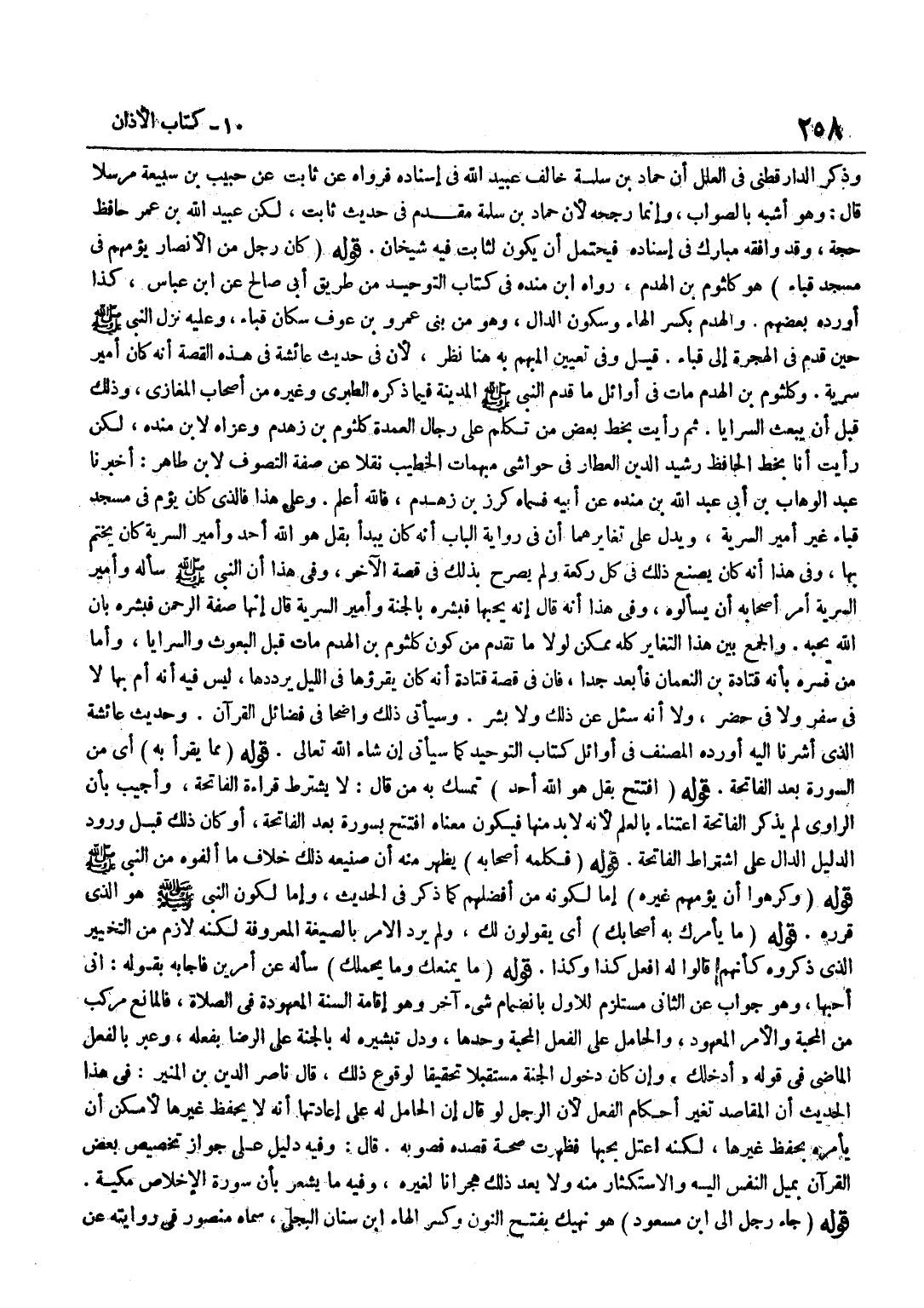 وَذَكَرَ الدَّارَقُطْنِيُّ فِي الْعِلَلِ أَنَّ حَمَّادَ بْنَ سَلَمَةَ خَالَفَ عُبَيْدَ اللَّهِ فِي إِسْنَادِهِ فَرَوَاهُ عَنْ ثَابِتٍ عَنْ حَبِيبِ بْنِ سُبَيْعَةَ مُرْسَلًا قَالَ وَهُوَ أَشْبَهُ بِالصَّوَابِ وَإِنَّمَا رَجَّحَهُ لِأَنَّ حَمَّادَ بْنَ سَلَمَةَ مُقَدَّمٌ فِي حَدِيثِ ثَابِتٍ لَكِنَّ عُبَيْدَ اللَّهِ بْنَ عُمَرَ حَافِظٌ حُجَّةٌ وَقَدْ وَافَقَهُ مُبَارَكٌ فِي إِسْنَادِهِ فَيُحْتَمَلُ أَنْ يَكُونَ لِثَابِتٍ فِيهِ شَيْخَانِ قَوْلُهُ كَانَ رَجُلٌ مِنَ الْأَنْصَارِ يَؤُمُّهُمْ فِي مَسْجِدِ قُبَاءٍ هُوَ كُلْثُوم بن الْهدم رَوَاهُ بن مَنْدَهْ فِي كِتَابِ التَّوْحِيدِ مِنْ طَرِيقِ أَبِي صَالح عَن بن عَبَّاسٍ كَذَا أَوْرَدَهُ بَعْضُهُمْ وَالْهِدْمُ بِكَسْرِ الْهَاءِ وَسُكُونِ الدَّالِ وَهُوَ مِنْ بَنِي عَمْرِو بْنِ عَوْفٍ سُكَّانِ قُبَاءٍ وَعَلَيْهِ نَزَلَ النَّبِيُّ صَلَّى اللَّهُ عَلَيْهِ وَسَلَّمَ حِينَ قَدِمَ فِي الْهِجْرَةِ إِلَى قُبَاءٍ قِيلَ وَفِي تَعْيِينِ الْمُبْهَمِ بِهِ هُنَا نَظَرٌ لِأَنَّ فِي حَدِيثِ عَائِشَةَ فِي هَذِهِ الْقِصَّةِ أَنَّهُ كَانَ أَمِيرَ سَرِيَّةٍ وَكُلْثُومُ بْنُ الْهِدْمِ مَاتَ فِي أَوَائِلِ مَا قَدِمَ النَّبِيُّ صَلَّى اللَّهُ عَلَيْهِ وَسَلَّمَ الْمَدِينَةَ فِيمَا ذَكَرَهُ الطَّبَرِيُّ وَغَيْرُهُ مِنْ أَصْحَابِ الْمَغَازِي وَذَلِكَ قَبْلَ أَنْ يَبْعَثَ السَّرَايَا ثُمَّ رَأَيْتُ بِخَطِّ بَعْضِ مَنْ تَكَلَّمَ عَلَى رِجَالِ الْعُمْدَةِ كُلْثُومَ بْنَ زَهْدَمٍ وَعَزَاهُ لِابْنِ مَنْدَهْ لَكِنْ رَأَيْتُ أَنَا بِخَطِّ الْحَافِظِ رَشِيدِ الدِّينِ الْعَطَّارِ فِي حَوَاشِي مُبْهَمَاتِ الْخَطِيبِ نَقْلًا عَنْ صِفَةِ التَّصَوُّفِ لِابْنِ طَاهِرٍ أَخْبَرَنَا عَبْدُ الْوَهَّابِ بْنُ أَبِي عَبْدِ اللَّهِ بْنِ مَنْدَهْ عَنْ أَبِيهِ فَسَمَّاهُ كُرْزَ بْنَ زَهْدَمٍ فَاللَّهُ أَعْلَمُ وَعَلَى هَذَا فَالَّذِي كَانَ يَؤُمُّ فِي مَسْجِدِ قُبَاءٍ غَيْرُ أَمِيرِ السَّرِيَّةِ وَيَدُلُّ عَلَى تَغَايُرِهِمَا أَنَّ فِي رِوَايَةِ الْبَابِ أَنَّهُ كَانَ يَبْدَأُ بِقُلْ هُوَ اللَّهُ أَحَدٌ وَأَمِيرُ السَّرِيَّةِ كَانَ يَخْتِمُ بِهَا وَفِي هَذَا أَنَّهُ كَانَ يَصْنَعُ ذَلِكَ فِي كُلِّ رَكْعَةٍ وَلَمْ يُصَرِّحْ بِذَلِكَ فِي قِصَّةِ الْآخَرِ وَفِي هَذَا أَنَّ النَّبِيَّ صَلَّى اللَّهُ عَلَيْهِ وَسَلَّمَ سَأَلَهُ وَأَمِيرَ السَّرِيَّةِ أَمَرَ أَصْحَابَهُ أَنْ يَسْأَلُوهُ وَفِي هَذَا أَنَّهُ قَالَ إِنَّهُ يُحِبُّهَا فَبَشَّرَهُ بِالْجَنَّةِ وَأَمِيرُ السَّرِيَّةِ قَالَ إِنَّهَا صِفَةُ الرَّحْمَنِ فَبَشَّرَهُ بِأَنَّ اللَّهَ يُحِبُّهُ وَالْجَمْعُ بَيْنَ هَذَا التَّغَايُرِ كُلِّهِ مُمْكِنٌ لَوْلَا مَا تَقَدَّمَ مِنْ كَوْنِ كُلْثُومِ بْنِ الْهِدْمِ مَاتَ قَبْلَ الْبُعُوثِ وَالسَّرَايَا وَأَمَّا مَنْ فَسَّرَهُ بِأَنَّهُ قَتَادَةُ بْنُ النُّعْمَانِ فَأَبْعَدَ جِدًّا فَإِنَّ فِي قِصَّةِ قَتَادَةَ أَنَّهُ كَانَ يَقْرَؤُهَا فِي اللَّيْلِ يُرَدِّدُهَا لَيْسَ فِيهِ أَنَّهُ أَمَّ بِهَا لَا فِي سَفَرٍ وَلَا فِي حَضَرٍ وَلَا أَنَّهُ سُئِلَ عَنْ ذَلِكَ وَلَا بُشِّرَ وَسَيَأْتِي ذَلِكَ وَاضِحًا فِي فَضَائِلِ الْقُرْآنِ وَحَدِيثُ عَائِشَةَ الَّذِي أَشَرْنَا إِلَيْهِ أَوْرَدَهُ الْمُصَنِّفُ فِي أَوَائِلِ كِتَابِ التَّوْحِيدِ كَمَا سَيَأْتِي إِنْ شَاءَ اللَّهُ تَعَالَى قَوْلُهُ مِمَّا يَقْرَأُ بِهِ أَيْ مِنَ السُّورَةِ بَعْدَ الْفَاتِحَةِ قَوْلُهُ افْتَتَحَ بِقُلْ هُوَ اللَّهُ أَحَدٌ تَمَسَّكَ بِهِ مَنْ قَالَ لَا يُشْتَرَطُ قِرَاءَةُ الْفَاتِحَةِ وَأُجِيبَ بِأَنَّ الرَّاوِيَ لَمْ يَذْكُرِ الْفَاتِحَةَ اعْتِنَاءً بِالْعِلْمِ لِأَنَّهُ لَا بُدَّ مِنْهَا ف