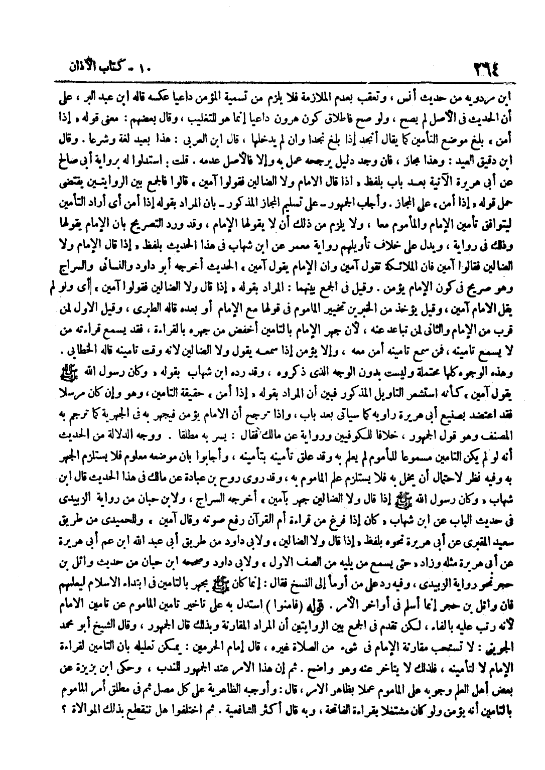بن مَرْدَوَيْهِ مِنْ حَدِيثِ أَنَسٍ وَتُعُقِّبَ بِعَدَمِ الْمُلَازَمَةِ فَلَا يَلْزَمُ مِنْ تَسْمِيَةِ الْمُؤَمِّنِ دَاعِيًا عَكْسُهُ قَالَه بن عَبْدِ الْبَرِّ عَلَى أَنَّ الْحَدِيثَ فِي الْأَصْلِ لَمْ يَصِحَّ وَلَوْ صَحَّ فَإِطْلَاقُ كَوْنِ هَارُونَ دَاعِيًا إِنَّمَا هُوَ لِلتَّغْلِيبِ وَقَالَ بَعْضُهُمْ مَعْنَى قَوْلِهِ إِذَا أَمَّنَ بَلَغَ مَوْضِعَ التَّأْمِينِ كَمَا يُقَالُ أَنْجَدَ إِذَا بَلَغَ نَجْدًا وَإِنْ لَمْ يدخلهَا قَالَ بن الْعَرَبِيّ هَذَا بعيد لُغَة وَشرعا وَقَالَ بن دَقِيقِ الْعِيدِ وَهَذَا مَجَازٌ فَإِنْ وُجِدَ دَلِيلٌ يُرَجِّحُهُ عُمِلَ بِهِ وَإِلَّا فَالْأَصْلُ عَدَمُهُ قُلْتُ اسْتَدَلُّوا لَهُ بِرِوَايَةِ أَبِي صَالِحٍ عَنْ أَبِي هُرَيْرَةَ الْآتِيَةِ بَعْدَ بَابٍ بِلَفْظِ إِذَا قَالَ الْإِمَامُ وَلَا الضَّالِّينَ فَقُولُوا آمِينَ قَالُوا فَالْجَمْعُ بَيْنَ الرِّوَايَتَيْنِ يَقْتَضِي حَمْلَ قَوْلِهِ إِذَا أَمَّنَ عَلَى الْمَجَازِ وَأَجَابَ الْجُمْهُورُ عَلَى تَسْلِيمِ الْمَجَازِ الْمَذْكُورِ بِأَنَّ الْمُرَادَ بِقَوْلِهِ إِذَا أَمَّنَ أَيْ أَرَادَ التَّأْمِينَ لِيَتَوَافَقَ تَأْمِينُ الْإِمَامِ وَالْمَأْمُومِ مَعًا وَلَا يَلْزَمُ مِنْ ذَلِكَ أَنْ لَا يَقُولَهَا الْإِمَامُ وَقَدْ وَرَدَ التَّصْرِيحُ بِأَنَّ الْإِمَامَ يَقُولُهَا وَذَلِكَ فِي رِوَايَةٍ وَيَدُلُّ عَلَى خِلَافِ تَأْوِيلِهِمْ رِوَايَة معمر عَن بن شِهَابٍ فِي هَذَا الْحَدِيثِ بِلَفْظِ إِذَا قَالَ الْإِمَامُ وَلَا الضَّالِّينَ فَقَالُوا آمِينَ فَإِنَّ الْمَلَائِكَةَ تَقُولُ آمِينَ وَإِنَّ الْإِمَامَ يَقُولُ آمِينَ الْحَدِيثَ أَخْرَجَهُ أَبُو دَاوُدَ وَالنَّسَائِيُّ وَالسَّرَّاجُ وَهُوَ صَرِيحٌ فِي كَوْنِ الْإِمَامِ يُؤَمِّنُ وَقِيلَ فِي الْجَمْعِ بَيْنَهُمَا الْمُرَادُ بِقَوْلِهِ إِذَا قَالَ وَلَا الضَّالِّينَ فَقُولُوا آمِينَ أَيْ وَلَوْ لَمْ يَقُلِ الْإِمَامُ آمِينَ وَقِيلَ يُؤْخَذُ مِنَ الْخَبَرَيْنِ تَخْيِيرُ الْمَأْمُومِ فِي قَوْلِهَا مَعَ الْإِمَامِ أَوْ بَعْدَهُ قَالَهُ الطَّبَرِيُّ وَقِيلَ الْأَوَّلُ لِمَنْ قَرُبَ مِنَ الْإِمَامِ وَالثَّانِي لِمَنْ تَبَاعَدَ عَنْهُ لِأَنَّ جَهْرَ الْإِمَامِ بِالتَّأْمِينِ أَخْفَضُ مِنْ جَهْرِهِ بِالْقِرَاءَةِ فَقَدْ يَسْمَعُ قِرَاءَتَهُ مَنْ لَا يَسْمَعُ تَأْمِينَهُ فَمَنْ سَمِعَ تَأْمِينَهُ أَمَّنَ مَعَهُ وَإِلَّا يُؤَمِّنْ إِذَا سَمِعَهُ يَقُولُ وَلَا الضَّالِّينَ لِأَنَّهُ وَقْتُ تَأْمِينِهِ قَالَهُ الْخَطَّابِيُّ وَهَذِهِ الْوُجُوهُ كُلُّهَا مُحْتَمَلَةٌ وَلَيْسَتْ بِدُونِ الْوَجْه الَّذِي ذَكرُوهُ وَقد رده بن شِهَابٍ بِقَوْلِهِ وَكَانَ رَسُولَ اللَّهِ صَلَّى اللَّهُ عَلَيْهِ وَسَلَّمَ يَقُولُ آمِينَ كَأَنَّهُ اسْتَشْعَرَ التَّأْوِيلَ الْمَذْكُورَ فَبَيَّنَ أَنَّ الْمُرَادَ بِقَوْلِهِ إِذَا أَمَّنَ حَقِيقَةُ التَّأْمِينِ وَهُوَ وَإِنْ كَانَ مُرْسَلًا فَقَدِ اعْتُضِدَ بِصَنِيعِ أَبِي هُرَيْرَةَ رَاوِيهِ كَمَا سَيَأْتِي بَعْدَ بَابٍ وَإِذَا تَرَجَّحَ أَنَّ الْإِمَامَ يُؤَمِّنُ فَيَجْهَرُ بِهِ فِي الْجَهْرِيَّةِ كَمَا تَرْجَمَ بِهِ الْمُصَنِّفُ وَهُوَ قَوْلُ الْجُمْهُورِ خِلَافًا لِلْكُوفِيِّينَ وَرِوَايَةً عَنْ مَالِكٍ فَقَالَ يُسِرُّ بِهِ مُطْلَقًا وَوَجْهُ الدَّلَالَةِ مِنَ الْحَدِيثِ أَنَّهُ لَوْ لَمْ يَكُنِ التَّأْمِينُ مَسْمُوعًا لِلْمَأْمُومِ لَمْ يَعْلَمْ بِهِ وَقَدْ عُلِّقَ تَأْمِينُهُ بِتَأْمِينِهِ وَأَجَابُوا بِأَنَّ مَوْضِعَهُ مَعْلُومٌ فَلَا يَسْتَلْزِمُ الْجَهْرَ بِهِ وَفِيهِ نَظَرٌ لِاحْتِمَالِ أَنْ يُخِلَّ بِهِ فَلَا يَسْتَلْزِمُ عِلْمَ الْمَأْمُومِ بِهِ وَقَدْ رَوَى رَوْحُ بْنُ عُبَادَةَ عَ