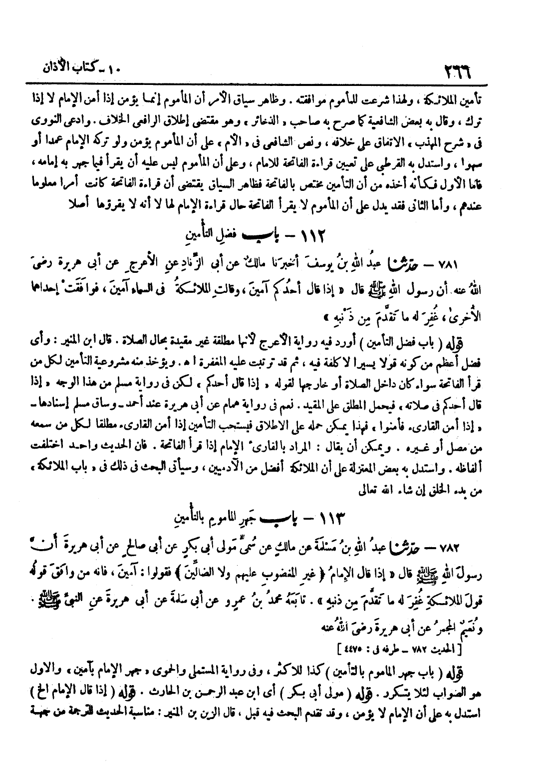 أَوْرَدَ فِيهِ رِوَايَةَ الْأَعْرَجِ لِأَنَّهَا مُطْلَقَةٌ غَيْرُ مُقَيَّدَةٍ بِحَالِ الصَّلَاةِ قَالَ بن الْمُنِيرِ وَأَيُّ فَضْلٍ أَعْظَمَ مِنْ كَوْنِهِ قَوْلًا يَسِيرًا لَا كُلْفَةَ فِيهِ ثُمَّ قَدْ تَرَتَّبَتْ عَلَيْهِ الْمَغْفِرَة أه وَيُؤْخَذ مِنْهُ مَشْرُوعِيَّة التَّأْمِين لكل من قَرَأَ الْفَاتِحَة سَوَاء كَانَ دَاخل الصَّلَاة أَو خَارِجهَا لقَوْله إِذا قَالَ أحدكُم لَكِن فِي رِوَايَة مُسلم من هَذَا الْوَجْه إِذا قَالَ أحدكُم فِي صلَاته فَيحمل الْمُطلق على الْمُقَيد نعم فِي رِوَايَةِ هَمَّامٍ عَنْ أَبِي هُرَيْرَةَ عِنْدَ أَحْمد وسَاق مُسلم إسنادها إِذا أَمن الْقَارئ فَأمنُوا فَهَذَا يُمكن حمله على الْإِطْلَاق فَيُسْتَحَب التَّأْمِين إِذا أَمن الْقَارئ مُطلقًا لكل من سَمعه من مصل أَو غَيره وَيُمكن أَن يُقَال المُرَاد بالقارئ الإِمَام إِذا قَرَأَ الْفَاتِحَة فَإِن الحَدِيث وَاحِد اخْتلفت أَلْفَاظه وَاسْتدلَّ بِهِ بعض الْمُعْتَزلَة على أَن الْمَلَائِكَة أفضل من الْآدَمِيّين وَسَيَأْتِي الْبَحْث فِي ذَلِك فِي بَاب الْمَلَائِكَة من بَدْءِ الْخَلْقِ إِنْ شَاءَ اللَّهُ تَعَالَى قَوْلُهُ بَابُ جَهْرِ الْمَأْمُومِ بِالتَّأْمِينِ كَذَا لِلْأَكْثَرِ وَفِي رِوَايَةِ الْمُسْتَمْلِي وَالْحَمَوِيِّ جَهْرِ الْإِمَامِ بِآمِينَ وَالْأَوَّلُ هُوَ الصَّوَابُ لِئَلَّا يَتَكَرَّرَ