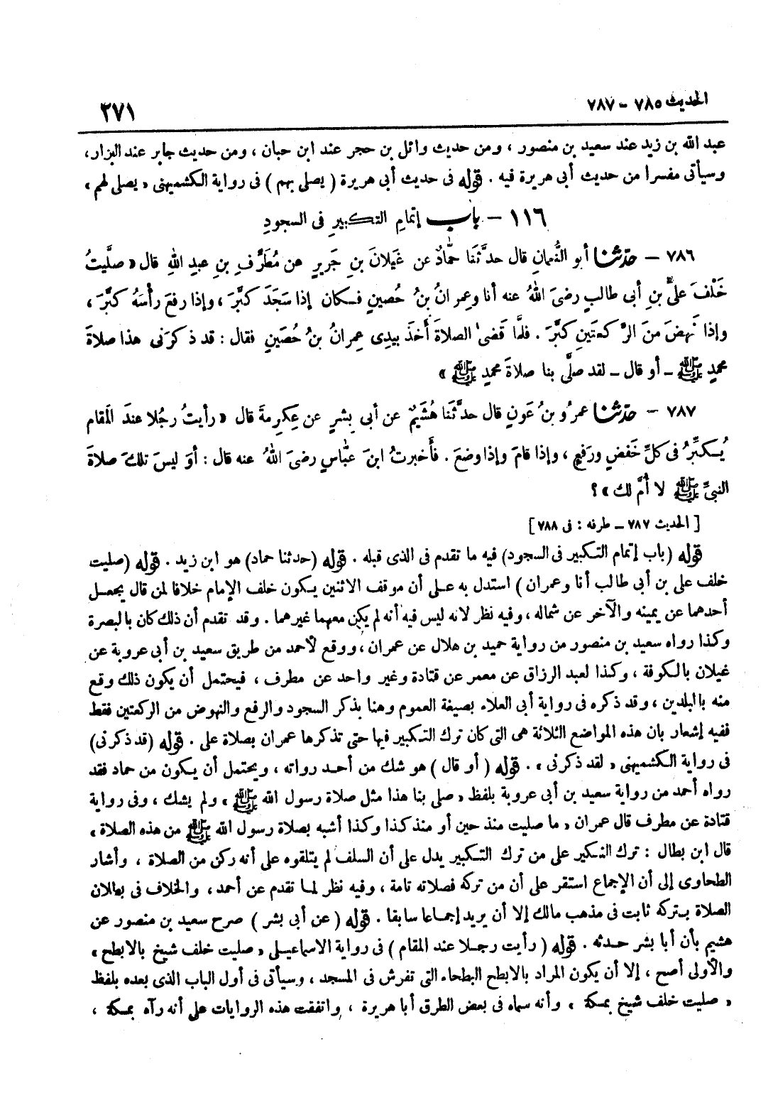 [786] قَوْلُهُ صَلَّيْتُ خَلْفَ عَلِيِّ بْنِ أَبِي طَالِبٍ أَنَا وَعِمْرَانُ اسْتُدِلَّ بِهِ عَلَى أَنَّ مَوْقِفَ الِاثْنَيْنِ يَكُونُ خَلْفَ الْإِمَامِ خِلَافًا لِمَنْ قَالَ يَجْعَلُ أَحَدَهُمَا عَنْ يَمِينِهِ وَالْآخَرَ عَنْ شِمَالِهِ وَفِيهِ نَظَرٌ لِأَنَّهُ لَيْسَ فِيهِ أَنَّهُ لَمْ يَكُنْ مَعَهُمَا غَيْرُهُمَا وَقَدْ تَقَدَّمَ أَنَّ ذَلِكَ كَانَ بِالْبَصْرَةِ وَكَذَا رَوَاهُ سَعِيدُ بْنُ مَنْصُورٍ مِنْ رِوَايَةِ حُمَيْدِ بْنِ هِلَالٍ عَنْ عِمْرَانَ وَوَقَعَ لِأَحْمَدَ مِنْ طَرِيقِ سَعِيدِ بْنِ أَبِي عَرُوبَةَ عَنْ غَيْلَانَ بِالْكُوفَةِ وَكَذَا لِعَبْدِ الرَّزَّاقِ عَنْ مَعْمَرٍ عَنْ قَتَادَةَ وَغَيْرِ وَاحِدٍ عَنْ مُطَرِّفٍ فَيُحْتَمَلُ أَنْ يَكُونَ ذَلِكَ وَقَعَ مِنْهُ بِالْبَلَدَيْنِ وَقَدْ ذَكَرَهُ فِي رِوَايَةِ أَبِي الْعَلَاءِ بِصِيغَةِ الْعُمُومِ وَهُنَا بِذِكْرِ السُّجُودِ وَالرَّفْعِ وَالنُّهُوضِ مِنَ الرَّكْعَتَيْنِ فَقَطْ فَفِيهِ إِشْعَارٌ بِأَنَّ هَذِهِ الْمَوَاضِعَ الثَّلَاثَةَ هِيَ الَّتِي كَانَ تُرِكَ التَّكْبِيرُ فِيهَا حَتَّى تَذَكَّرَهَا عِمْرَانُ بِصَلَاةِ عَلِيٍّ قَوْلُهُ قَدْ ذَكَّرَنِي فِي رِوَايَةِ الْكُشْمِيهَنِيِّ لَقَدْ ذَكَّرَنِي قَوْلُهُ أَوْ قَالَ هُوَ شَكٌّ مِنْ أَحَدِ رُوَاتِهِ وَيُحْتَمَلُ أَنْ يَكُونَ مِنْ حَمَّادٍ فَقَدْ رَوَاهُ أَحْمَدُ مِنْ رِوَايَةِ سَعِيدِ بْنِ أَبِي عَرُوبَةَ بِلَفْظِ صَلَّى بِنَا هَذَا مِثْلَ صَلَاةُ رَسُولِ اللَّهِ صَلَّى اللَّهُ عَلَيْهِ وَسَلَّمَ وَلَمْ يَشُكَّ وَفِي رِوَايَةِ قَتَادَةَ عَنْ مُطَرِّفٍ قَالَ عِمْرَانُ مَا صَلَّيْتُ مُنْذُ حِينٍ أَوْ مُنْذُ كَذَا وَكَذَا أَشْبَهَ بِصَلَاةِ رَسُولِ اللَّهِ صَلَّى اللَّهُ عَلَيْهِ وَسَلَّمَ مِنَ هَذِهِ الصَّلَاةِ قَالَ بن بَطَّالٍ تَرْكُ النَّكِيرِ عَلَى مَنْ تَرَكَ التَّكْبِيرَ يَدُلُّ عَلَى أَنَّ السَّلَفَ لَمْ يَتَلَقَّوْهُ عَلَى أَنَّهُ رُكْنٌ مِنَ الصَّلَاةِ وَأَشَارَ الطَّحَاوِيُّ إِلَى أَنَّ الْإِجْمَاعَ اسْتَقَرَّ عَلَى أَنَّ مَنْ تَرَكَهُ فَصَلَاتُهُ تَامَّةٌ وَفِيهِ نَظَرٌ لِمَا تَقَدَّمَ عَنْ أَحْمَدَ وَالْخِلَافُ فِي بُطْلَانِ الصَّلَاةِ بِتَرْكِهِ ثَابِتٌ فِي مَذْهَبِ مَالِكٍ إِلَّا أَنْ يُرِيدَ إِجْمَاعًا سَابِقًا