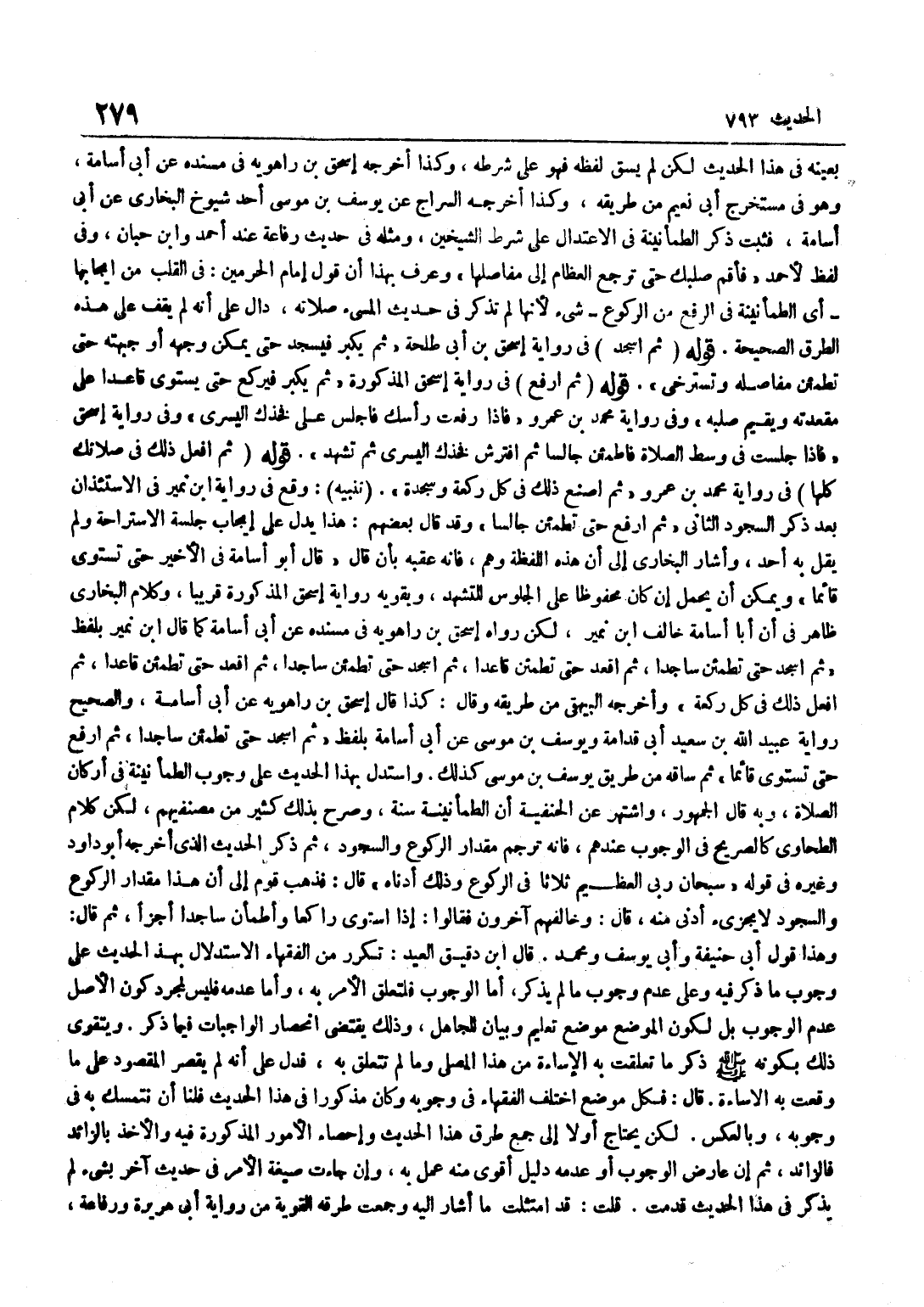 بِعَيْنِهِ فِي هَذَا الْحَدِيثِ لَكِنْ لَمْ يَسُقْ لَفْظَهُ فَهُوَ عَلَى شَرْطِهِ وَكَذَا أَخْرَجَهُ إِسْحَاقُ بْنُ رَاهْوَيْهِ فِي مُسْنَدِهِ عَنْ أَبِي أُسَامَةَ وَهُوَ فِي مُسْتَخْرَجِ أَبِي نُعَيْمٍ مِنْ طَرِيقِهِ وَكَذَا أَخْرَجَهُ السَّرَّاجُ عَنْ يُوسُفَ بْنِ مُوسَى أَحَدِ شُيُوخِ الْبُخَارِيِّ عَنْ أَبِي أُسَامَةَ فَثَبَتَ ذِكْرُ الطُّمَأْنِينَةِ فِي الِاعْتِدَالِ عَلَى شَرْطِ الشَّيْخَيْنِ وَمثله فِي حَدِيث رِفَاعَة عِنْد أَحْمد وبن حِبَّانَ وَفِي لَفْظٍ لِأَحْمَدَ فَأَقِمْ صُلْبَكَ حَتَّى تَرْجِعَ الْعِظَامُ إِلَى مَفَاصِلِهَا وَعُرِفَ بِهَذَا أَنَّ قَوْلَ إِمَامِ الْحَرَمَيْنِ فِي الْقَلْبِ مِنْ إِيجَابِهَا أَيِ الطُّمَأْنِينَةَ فِي الرَّفْعِ مِنَ الرُّكُوعِ شَيْءٌ لِأَنَّهَا لَمْ تُذْكَرْ فِي حَدِيثِ الْمُسِيءِ صَلَاتَهُ دَالٌّ عَلَى أَنَّهُ لَمْ يَقِفْ عَلَى هَذِهِ الطُّرُقِ الصَّحِيحَةِ قَوْلُهُ ثُمَّ اسْجُدْ فِي رِوَايَةِ إِسْحَاقَ بْنِ أَبِي طَلْحَةَ ثُمَّ يُكَبِّرُ فَيَسْجُدُ حَتَّى يُمَكِّنَ وَجْهَهُ أَوْ جَبْهَتَهُ حَتَّى تَطْمَئِنَّ مفصاله وَتَسْتَرْخِيَ قَوْلُهُ ثُمَّ ارْفَعْ فِي رِوَايَةِ إِسْحَاقَ الْمَذْكُورَةِ ثُمَّ يُكَبِّرُ فَيَرْكَعُ حَتَّى يَسْتَوِيَ قَاعِدًا عَلَى مَقْعَدَتَهِ وَيُقِيمَ صُلْبَهُ وَفِي رِوَايَةِ مُحَمَّدِ بْنِ عَمْرٍو فَإِذَا رَفَعْتَ رَأْسَكَ فَاجْلِسْ عَلَى فَخِذِكَ الْيُسْرَى وَفِي رِوَايَةِ إِسْحَاقَ فَإِذَا جَلَسْتَ فِي وَسَطِ الصَّلَاةِ فَاطْمَئِنَّ جَالِسًا ثُمَّ افْتَرِشْ فَخِذَكَ الْيُسْرَى ثُمَّ تَشَهَّدْ قَوْلُهُ ثُمَّ افْعَلْ ذَلِكَ فِي صَلَاتِكَ كُلِّهَا فِي رِوَايَةِ مُحَمَّدِ بْنِ عَمْرٍو ثُمَّ اصْنَعْ ذَلِكَ فِي كُلِّ رَكْعَة وَسجْدَة تَنْبِيه وَقع فِي رِوَايَة بن نُمَيْرٍ فِي الِاسْتِئْذَانِ بَعْدَ ذِكْرِ السُّجُودِ الثَّانِي ثُمَّ ارْفَعْ حَتَّى تَطْمَئِنَّ جَالِسًا وَقَدْ قَالَ بَعْضُهُمْ هَذَا يَدُلُّ عَلَى إِيجَابِ جِلْسَةِ الِاسْتِرَاحَةِ وَلَمْ يَقُلْ بِهِ أَحَدٌ وَأَشَارَ الْبُخَارِيُّ إِلَى أَنَّ هَذِهِ اللَّفْظَةَ وَهْمٌ فَإِنَّهُ عَقَّبَهُ بِأَنْ قَالَ قَالَ أَبُو أُسَامَةَ فِي الْأَخِيرِ حَتَّى تَسْتَوِيَ قَائِمًا وَيُمْكِنُ أَنْ يُحْمَلَ إِنْ كَانَ مَحْفُوظًا عَلَى الْجُلُوسِ لِلتَّشَهُّدِ وَيُقَوِّيهِ رِوَايَةُ إِسْحَاقَ الْمَذْكُورَةُ قَرِيبًا وَكَلَامُ الْبُخَارِيِّ ظَاهِرٌ فِي أَنَّ أَبَا أُسَامَة خَالف بن نُمَيْرٍ لَكِنْ رَوَاهُ إِسْحَاقُ بْنُ رَاهَوَيْهِ فِي مُسْنَدِهِ عَنْ أَبِي أُسَامَة كَمَا قَالَ بن نُمَيْرٍ بِلَفْظِ ثُمَّ اسْجُدْ حَتَّى تَطْمَئِنَّ سَاجِدًا ثُمَّ اقْعُدْ حَتَّى تَطْمَئِنَّ قَاعِدًا ثُمَّ اسْجُدْ حَتَّى تَطْمَئِنَّ سَاجِدًا ثُمَّ اقْعُدْ حَتَّى تَطْمَئِنَّ قَاعِدًا ثُمَّ افْعَلْ ذَلِكَ فِي كُلِّ رَكْعَةٍ وَأَخْرَجَهُ الْبَيْهَقِيُّ مِنْ طَرِيقِهِ وَقَالَ كَذَا قَالَ إِسْحَاقُ بْنُ رَاهْوَيْهِ عَنْ أَبِي أُسَامَةَ وَالصَّحِيحُ رِوَايَة عبيد الله بن سعيد أَبِي قُدَامَةَ وَيُوسُفَ بْنِ مُوسَى عَنْ أَبِي أُسَامَةَ بِلَفْظِ ثُمَّ اسْجُدْ حَتَّى تَطْمَئِنَّ سَاجِدًا ثُمَّ ارْفَعْ حَتَّى تَسْتَوِيَ قَائِمًا ثُمَّ سَاقَهُ مِنْ طَرِيقِ يُوسُفَ بْنِ مُوسَى كَذَلِكَ وَاسْتُدِلَّ بِهَذَا الْحَدِيثِ عَلَى وُجُوبِ الطُّمَأْنِينَةِ فِي أَرْكَانِ الصَّلَاةِ وَبِهِ قَالَ الْجُمْهُورُ وَاشْتُهِرَ عَنِ الْحَنَفِيَّةِ أَنَّ الطُّمَأْنِينَةَ سُنَّةٌ وَصَرَّحَ بِذَلِكَ كَثِيرٌ مِنْ مُصَنِّفِيهِمْ لَكِنَّ كَلَامَ الطَّحَاوِيِّ كَالصَّرِيحِ فِي الْوُجُوبِ عِنْدَهُمْ فَإِنَّهُ تَرْجَمَ مِقْدَارَ الرُّكُوعِ وَالسُّجُودِ ثُمَّ ذَكَرَ الْحَدِيثَ الَّذِي أَخْرَجَ
