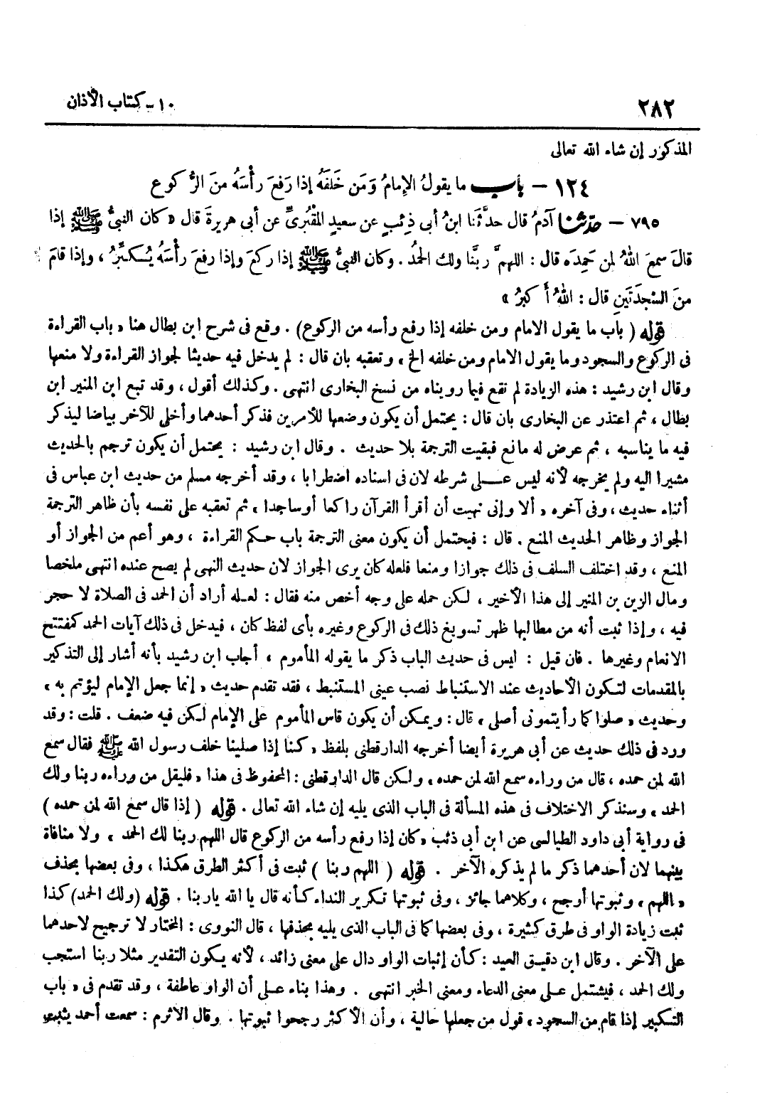 [795] قَوْلُهُ إِذَا قَالَ سَمِعَ اللَّهُ لِمَنْ حَمِدَهُ فِي رِوَايَة أبي دَاوُد الطَّيَالِسِيّ عَن بن أَبِي ذِئْبٍ كَانَ إِذَا رَفَعَ رَأْسَهُ مِنَ الرُّكُوعِ قَالَ اللَّهُمَّ رَبَّنَا لَكَ الْحَمْدُ وَلَا مُنَافَاةَ بَيْنَهُمَا لِأَنَّ أَحَدَهُمَا ذَكَرَ مَا لَمْ يَذْكُرْهُ الْآخَرُ قَوْلُهُ اللَّهُمَّ رَبَّنَا ثَبَتَ فِي أَكْثَرِ الطُّرُقِ هَكَذَا وَفِي بَعْضِهَا بِحَذْفِ اللَّهُمَّ وَثُبُوتُهَا أَرْجَحُ وَكِلَاهُمَا جَائِزٌ وَفِي ثُبُوتِهَا تَكْرِيرُ النِّدَاءِ كَأَنَّهُ قَالَ يَا اللَّهُ يَا رَبَّنَا قَوْلُهُ وَلَكَ الْحَمْدُ كَذَا ثَبَتَ زِيَادَةُ الْوَاوِ فِي طُرُقٍ كَثِيرَةٍ وَفِي بَعْضِهَا كَمَا فِي الْبَابِ الَّذِي يَلِيهِ بِحَذْفِهَا قَالَ النَّوَوِيُّ الْمُخْتَارُ لَا تَرْجِيح لأَحَدهمَا على الآخر وَقَالَ بن دَقِيقِ الْعِيدِ كَأَنَّ إِثْبَاتَ الْوَاوِ دَالٌّ عَلَى مَعْنًى زَائِدٍ لِأَنَّهُ يَكُونُ التَّقْدِيرُ مَثَلًا رَبَّنَا اسْتَجِبْ وَلَكَ الْحَمْدُ فَيَشْتَمِلُ عَلَى مَعْنَى الدُّعَاءِ وَمَعْنَى الْخَبَرِ انْتَهَى وَهَذَا بِنَاءً عَلَى أَنَّ الْوَاوَ عَاطِفَةٌ وَقَدْ تَقَدَّمَ فِي بَابِ التَّكْبِيرِ إِذَا قَامَ مِنَ السُّجُودِ قَوْلُ مَنْ جَعَلَهَا حَالِيَّةً وَأَنَّ الْأَكْثَرَ رَجَّحُوا ثُبُوتَهَا وَقَالَ الْأَثْرَمُ سَمِعْتُ أَحْمَدَ يُثْبِتُ