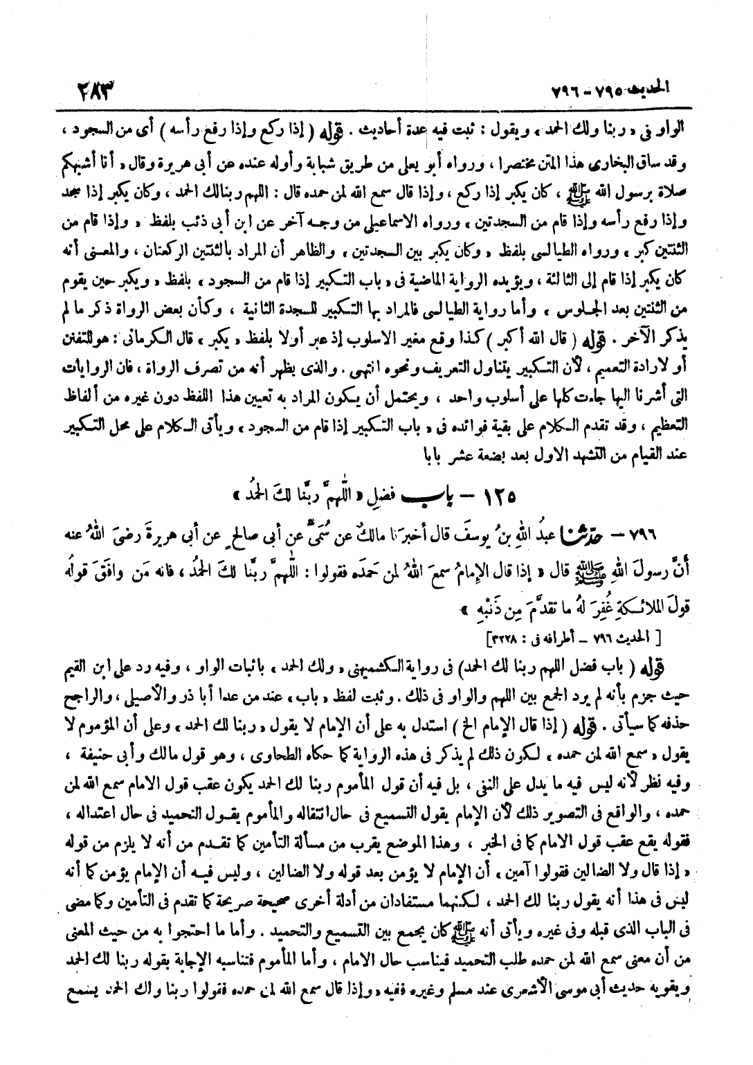 الْوَاوَ فِي رَبَّنَا وَلَكَ الْحَمْدُ وَيَقُولُ ثَبَتَ فِيهِ عِدَّةُ أَحَادِيثَ قَوْلُهُ إِذَا رَكَعَ وَإِذَا رَفَعَ رَأْسَهُ أَيْ مِنَ السُّجُودِ وَقَدْ سَاقَ الْبُخَارِيُّ هَذَا الْمَتْنَ مُخْتَصَرًا وَرَوَاهُ أَبُو يَعْلَى مِنْ طَرِيقِ شَبَابَةَ وَأَوَّلُهُ عِنْدَهُ عَنْ أَبِي هُرَيْرَةَ وَقَالَ أَنَا أَشْبَهُكُمْ صَلَاةً بِرَسُولِ اللَّهِ صَلَّى اللَّهُ عَلَيْهِ وَسَلَّمَ كَانَ يُكَبِّرُ إِذَا رَكَعَ وَإِذَا قَالَ سَمِعَ اللَّهُ لِمَنْ حَمِدَهُ قَالَ اللَّهُمَّ رَبَّنَا لَكَ الْحَمْدُ وَكَانَ يُكَبِّرُ إِذَا سَجَدَ وَإِذَا رَفَعَ رَأْسَهُ وَإِذَا قَامَ مِنَ السَّجْدَتَيْنِ وَرَوَاهُ الْإِسْمَاعِيلِيُّ مِنْ وَجْهٍ آخَرَ عَن بن أَبِي ذِئْبٍ بِلَفْظِ وَإِذَا قَامَ مِنَ الثِّنْتَيْنِ كَبَّرَ وَرَوَاهُ الطَّيَالِسِيُّ بِلَفْظِ وَكَانَ يُكَبِّرُ بَيْنَ السَّجْدَتَيْنِ وَالظَّاهِرُ أَنَّ الْمُرَادَ بِالثِّنْتَيْنِ الرَّكْعَتَانِ وَالْمَعْنَى أَنَّهُ كَانَ يُكَبِّرُ إِذَا قَامَ إِلَى الثَّالِثَةِ وَيُؤَيِّدُهُ الرِّوَايَةُ الْمَاضِيَةُ فِي بَابِ التَّكْبِيرِ إِذَا قَامَ مِنَ السُّجُودِ بِلَفْظِ وَيُكَبِّرُ حِينَ يَقُومُ مِنَ الثِّنْتَيْنِ بَعْدَ الْجُلُوسِ وَأَمَّا رِوَايَةُ الطَّيَالِسِيِّ فَالْمُرَادُ بِهَا التَّكْبِيرُ لِلسَّجْدَةِ الثَّانِيَةِ وَكَأَنَّ بَعْضَ الرُّوَاةِ ذَكَرَ مَا لَمْ يَذْكُرِ الْآخَرُ قَوْلُهُ قَالَ اللَّهُ أَكْبَرُ كَذَا وَقَعَ مُغَيَّرَ الْأُسْلُوبِ إِذْ عَبَّرَ أَوَّلًا بِلَفْظِ يُكَبِّرُ قَالَ الْكِرْمَانِيُّ هُوَ لِلتَّفَنُّنِ أَوْ لِإِرَادَةِ التَّعْمِيمِ لِأَنَّ التَّكْبِيرَ يَتَنَاوَلُ التَّعْرِيفَ وَنَحْوَهُ انْتَهَى وَالَّذِي يَظْهَرُ أَنَّهُ مِنْ تَصَرُّفِ الرُّوَاةِ فَإِنَّ الرِّوَايَاتِ الَّتِي أَشَرْنَا إِلَيْهَا جَاءَتْ كُلُّهَا عَلَى أُسْلُوبٍ وَاحِدٍ وَيُحْتَمَلُ أَنْ يَكُونَ الْمُرَادُ بِهِ تَعْيِينَ هَذَا اللَّفْظِ دُونَ غَيْرِهِ مِنْ أَلْفَاظِ التَّعْظِيمِ وَقَدْ تَقَدَّمَ الْكَلَامُ عَلَى بَقِيَّةِ فَوَائِدِهِ فِي بَابِ التَّكْبِيرِ إِذَا قَامَ مِنَ السُّجُودِ وَيَأْتِي الْكَلَامُ عَلَى مَحَلِّ التَّكْبِيرِ عِنْدَ الْقِيَامِ مِنَ التَّشَهُّدِ الْأَوَّلِ بعد بضعَة عشر بَابا