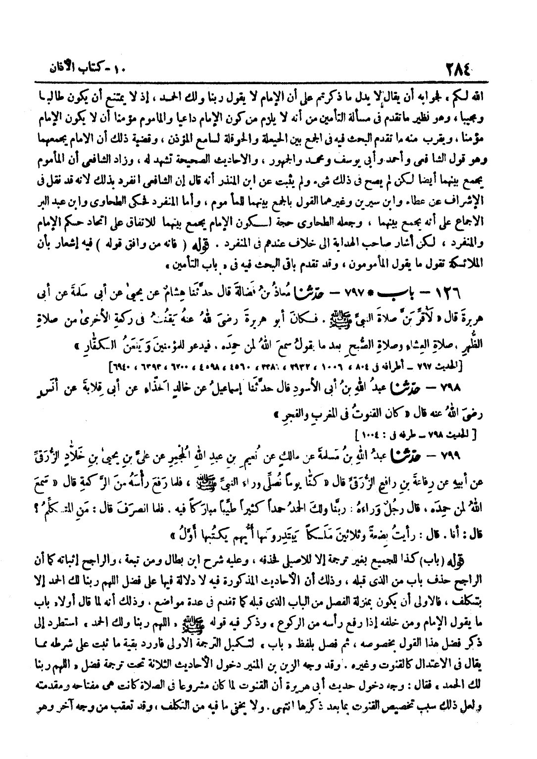 كَذَا لِلْجَمِيعِ بِغَيْرِ تَرْجَمَةٍ إِلَّا للاصيلى فَحَذفهُ وَعَلِيهِ شرح بن بَطَّالٍ وَمَنْ تَبِعَهُ وَالرَّاجِحُ إِثْبَاتُهُ كَمَا أَنَّ الرَّاجِحَ حَذْفُ بَابٍ مِنَ الَّذِي قَبْلَهُ وَذَلِكَ أَنَّ الْأَحَادِيثَ الْمَذْكُورَةَ فِيهِ لَا دَلَالَةَ فِيهَا عَلَى فَضْلِ اللَّهُمَّ رَبَّنَا لَكَ الْحَمْدُ إِلَّا بِتَكَلُّفٍ فَالْأَوْلَى أَنْ يَكُونَ بِمَنْزِلَةِ الْفَصْلِ مِنَ الْبَابِ الَّذِي قَبْلَهُ كَمَا تَقَدَّمَ فِي عِدَّةِ مَوَاضِعَ وَذَلِكَ أَنَّهُ لَمَّا قَالَ أَوَّلًا بَابُ مَا يَقُولُ الْإِمَامُ وَمَنْ خَلْفَهُ إِذَا رَفَعَ رَأْسَهُ مِنَ الرُّكُوعِ وَذَكَرَ فِيهِ قَوْلَهُ صَلَّى اللَّهُ عَلَيْهِ وَسَلَّمَ اللَّهُمَّ رَبَّنَا وَلَكَ الْحَمْدُ اسْتَطْرَدَ إِلَى ذِكْرِ فَضْلِ هَذَا الْقَوْلِ بِخُصُوصِهِ ثُمَّ فَصَلَ بِلَفْظِ بَابٍ لِتَكْمِيلِ التَّرْجَمَةِ الْأُولَى فَأَوْرَدَ بَقِيَّةَ مَا ثَبَتَ عَلَى شَرْطِهِ مِمَّا يُقَالُ فِي الِاعْتِدَالِ كَالْقُنُوتِ وَغَيْرِهِ وَقَدْ وَجَّهَ الزين بن الْمُنِيرِ دُخُولَ الْأَحَادِيثِ الثَّلَاثَةِ تَحْتَ تَرْجَمَةِ فَضْلِ اللَّهُمَّ رَبَّنَا لَكَ الْحَمْدُ فَقَالَ وَجْهُ دُخُولِ حَدِيثِ أَبِي هُرَيْرَةَ أَنَّ الْقُنُوتَ لَمَّا كَانَ مَشْرُوعا فِي الصَّلَاة كَانَت هِيَ مِفْتَاحُهُ وَمُقَدِّمَتُهُ وَلَعَلَّ ذَلِكَ سَبَبُ تَخْصِيصِ الْقُنُوتِ بِمَا بَعْدَ ذِكْرِهَا انْتَهَى وَلَا يَخْفَى مَا فِيهِ مِنَ التَّكَلُّفِ وَقَدْ تُعُقِّبَ مِنْ وَجْهٍ آخَرَ وَهُوَ