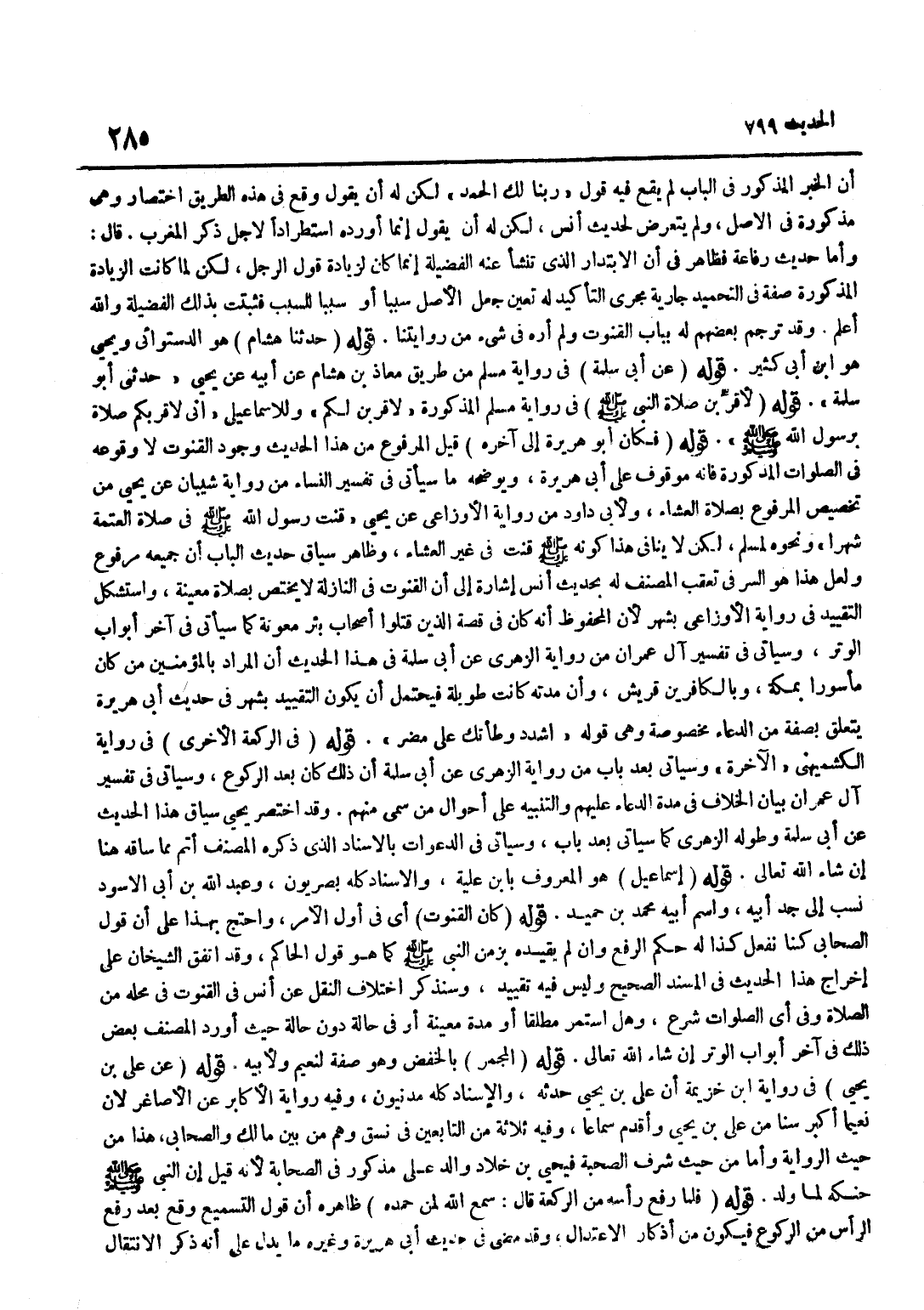[797] قَوْله حَدَّثَنَا هِشَامٌ هُوَ الدَّسْتُوَائِيُّ وَيَحْيَى هُوَ بن أَبِي كَثِيرٍ قَوْلُهُ عَنْ أَبِي سَلَمَةَ فِي رِوَايَةِ مُسْلِمٍ مِنْ طَرِيقِ مُعَاذِ بْنِ هِشَامٍ عَنْ أَبِيهِ عَنْ يَحْيَى حَدَّثَنِي أَبُو سَلَمَةَ قَوْلُهُ لَأُقَرِّبَنَّ صَلَاةَ النَّبِيِّ صَلَّى اللَّهُ عَلَيْهِ وَسَلَّمَ فِي رِوَايَةِ مُسْلِمٍ الْمَذْكُورَةِ لَأُقَرِّبَنَّ لَكُمْ وَلِلْإِسْمَاعِيلِيِّ إِنِّي لَأَقْرَبُكُمْ صَلَاةً بِرَسُولِ اللَّهِ صَلَّى اللَّهُ عَلَيْهِ وَسَلَّمَ قَوْلُهُ فَكَانَ أَبُو هُرَيْرَةَ إِلَى آخِرِهِ قِيلَ الْمَرْفُوعُ مِنْ هَذَا الْحَدِيثِ وُجُودُ الْقُنُوتِ لَا وُقُوعُهُ فِي الصَّلَوَاتِ الْمَذْكُورَةِ فَإِنَّهُ مَوْقُوفٌ عَلَى أَبِي هُرَيْرَةَ وَيُوَضِّحُهُ مَا سَيَأْتِي فِي تَفْسِيرِ النِّسَاءِ مِنْ رِوَايَةِ شَيْبَانَ عَنْ يَحْيَى مِنْ تَخْصِيصِ الْمَرْفُوعِ بِصَلَاةِ الْعِشَاءِ وَلِأَبِي دَاوُدَ مِنْ رِوَايَةِ الْأَوْزَاعِيِّ عَنْ يَحْيَى قَنَتَ رَسُولُ اللَّهِ صَلَّى اللَّهُ عَلَيْهِ وَسَلَّمَ فِي صَلَاةِ الْعَتَمَةِ شَهْرًا وَنَحْوُهُ لِمُسْلِمٍ لَكِنْ لَا يُنَافِي هَذَا كَوْنَهُ صَلَّى اللَّهُ عَلَيْهِ وَسلم قنت فِي غير الْعشَاء وَظَاهر سِيَاقُ حَدِيثِ الْبَابِ أَنَّ جَمِيعَهُ مَرْفُوعٌ وَلَعَلَّ هَذَا هُوَ السِّرُّ فِي تَعَقُّبِ الْمُصَنِّفِ لَهُ بِحَدِيثِ أَنَسٍ إِشَارَةً إِلَى أَنَّ الْقُنُوتَ فِي النَّازِلَةِ لَا يَخْتَصُّ بِصَلَاةٍ مُعَيَّنَةٍ وَاسْتَشْكَلَ التَّقْيِيدَ فِي رِوَايَةِ الْأَوْزَاعِيِّ بِشَهْرٍ لِأَنَّ الْمَحْفُوظَ أَنَّهُ كَانَ فِي قِصَّةِ الَّذِينَ قَتَلُوا أَصْحَابَ بِئْرِ مَعُونَةَ كَمَا سَيَأْتِي فِي آخِرِ أَبْوَابِ الْوِتْرِ وَسَيَأْتِي فِي تَفْسِيرِ آلِ عِمْرَانَ مِنْ رِوَايَةِ الزُّهْرِيِّ عَنْ أَبِي سَلَمَةَ فِي هَذَا الْحَدِيثِ أَنَّ الْمُرَادَ بِالْمُؤْمِنِينَ مَنْ كَانَ مَأْسُورًا بِمَكَّةَ وَبِالْكَافِرِينَ قُرَيْشٌ وَأَنَّ مُدَّتَهُ كَانَتْ طَوِيلَةً فَيُحْتَمَلُ أَنْ يَكُونَ التَّقْيِيدُ بِشَهْرٍ فِي حَدِيثِ أَبِي هُرَيْرَةَ يَتَعَلَّقُ بِصِفَةٍ مِنَ الدُّعَاءِ مَخْصُوصَةٍ وَهِيَ قَوْلُهُ اشْدُدْ وَطْأَتَكَ عَلَى مُضَرَ قَوْلُهُ فِي الرَّكْعَةِ الْأُخْرَى فِي رِوَايَةِ الْكُشْمِيهَنِيِّ الْآخِرَةِ وَسَيَأْتِي بَعْدَ بَابٍ مِنْ رِوَايَةِ الزُّهْرِيِّ عَنْ أَبِي سَلَمَةَ أَنَّ ذَلِكَ كَانَ بَعْدَ الرُّكُوعِ وَسَيَأْتِي فِي تَفْسِيرِ آلِ عِمْرَانَ بَيَانُ الْخِلَافِ فِي مُدَّةِ الدُّعَاءِ عَلَيْهِمْ وَالتَّنْبِيهُ عَلَى أَحْوَالِ مَنْ سَمَّى مِنْهُمْ وَقَدِ اخْتَصَرَ يَحْيَى سِيَاقُ هَذَا الْحَدِيثِ عَنْ أَبِي سَلَمَةَ وَطَوَّلَهُ الزُّهْرِيُّ كَمَا سَيَأْتِي بَعْدَ بَابٍ وَسَيَأْتِي فِي الدَّعَوَاتِ بِالْإِسْنَادِ الَّذِي ذَكَرَهُ الْمُصَنِّفُ أَتَمَّ مِمَّا سَاقَهُ هُنَا إِنْ شَاءَ اللَّهُ تَعَالَى قَوْلُهُ إِسْمَاعِيلُ هُوَ الْمَعْرُوفُ بِابْنِ عُلَيَّةَ وَالْإِسْنَادُ كُلُّهُ بَصْرِيُّونَ وَعَبْدُ اللَّهِ بْنُ أَبِي الْأَسْوَدِ نُسِبَ إِلَى جَدِّ أَبِيهِ وَاسْمُ أَبِيهِ مُحَمَّدُ بْنُ حُمَيْدٍ قَوْلُهُ كَانَ الْقُنُوتُ أَيْ فِي أَوَّلِ الْأَمْرِ وَاحْتُجَّ بِهَذَا عَلَى أَنَّ قَوْلَ الصَّحَابِيِّ كُنَّا نَفْعَلُ كَذَا لَهُ حُكْمُ الرَّفْعِ وَإِنْ لَمْ يُقَيِّدْهُ بِزَمَنِ النَّبِيِّ صَلَّى اللَّهُ عَلَيْهِ وَسَلَّمَ كَمَا هُوَ قَوْلُ الْحَاكِمِ وَقَدِ اتَّفَقَ الشَّيْخَانِ عَلَى إِخْرَاجِ هَذَا الْحَدِيثِ فِي الْمُسْنَدِ الصَّحِيحِ وَلَيْسَ فِيهِ تَقْيِيدٌ وَسَنَذْكُرُ اخْتِلَافَ النَّقْلِ عَنْ أَنَسٍ فِي الْقُنُوتِ فِي مَحَلِّهِ مِنَ الصَّلَاةِ وَفِي أَيِّ الصَّلَوَاتِ شُرِعَ وَهَ