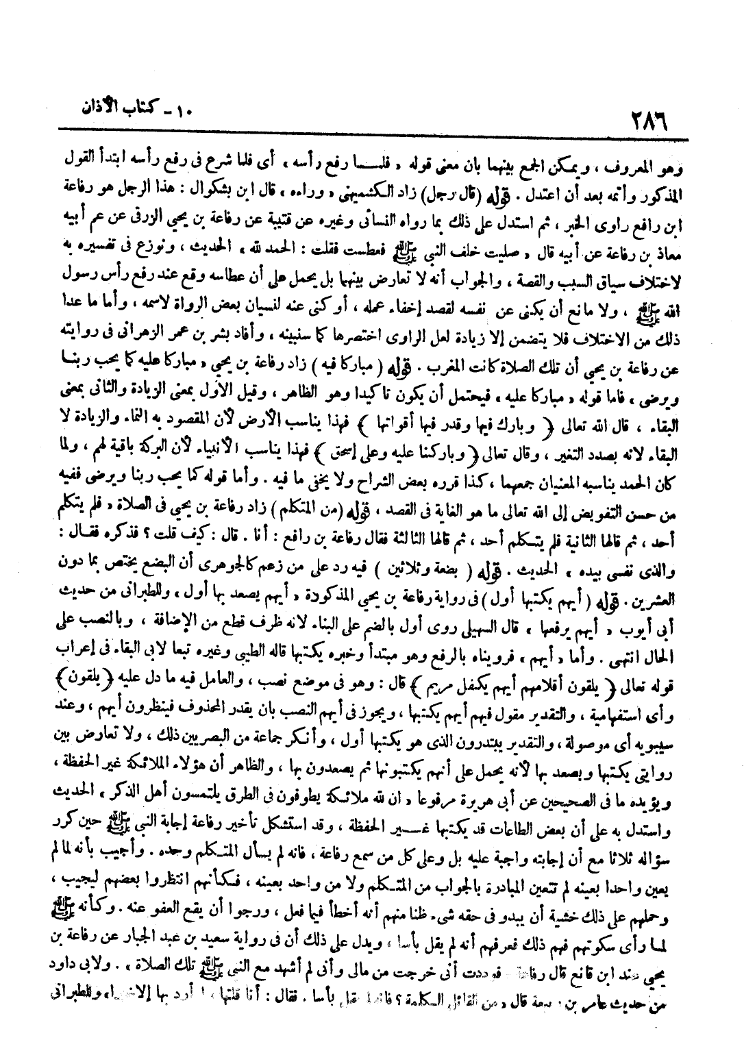 وَهُوَ الْمَعْرُوفُ وَيُمْكِنُ الْجَمْعُ بَيْنَهُمَا بِأَنَّ مَعْنَى قَوْلِهِ فَلَمَّا رَفَعَ رَأْسَهُ أَيْ فَلَمَّا شَرَعَ فِي رَفْعِ رَأْسِهِ ابْتَدَأَ الْقَوْلَ الْمَذْكُورَ وَأَتَمَّهُ بَعْدَ أَنِ اعْتَدَلَ قَوْلُهُ قَالَ رَجُلٌ زَادَ الْكشميهني وَرَاءه قَالَ بن بَشْكُوَالٍ هَذَا الرَّجُلُ هُوَ رِفَاعَةُ بْنُ رَافِعٍ رَاوِي الْخَبَرِ ثُمَّ اسْتَدَلَّ عَلَى ذَلِكَ بِمَا رَوَاهُ النَّسَائِيُّ وَغَيْرُهُ عَنْ قُتَيْبَةَ عَنْ رِفَاعَةَ بْنِ يَحْيَى الزُّرَقِيِّ عَنْ عَمِّ أَبِيهِ مُعَاذِ بْنِ رِفَاعَةَ عَنْ أَبِيهِ قَالَ صَلَّيْتُ خَلْفَ النَّبِيِّ صَلَّى اللَّهُ عَلَيْهِ وَسَلَّمَ فَعَطَسْتُ فَقُلْتُ الْحَمد لله الحَدِيث ونوزع فِي تَفْسِيرُهُ بِهِ لِاخْتِلَافِ سِيَاقِ السَّبَبِ وَالْقِصَّةِ وَالْجَوَابُ أَنَّهُ لَا تَعَارُضَ بَيْنَهُمَا بَلْ يُحْمَلُ عَلَى أَنَّ عُطَاسَهُ وَقَعَ عِنْدَ رَفْعِ رَأْسِ رَسُولُ اللَّهِ صَلَّى اللَّهُ عَلَيْهِ وَسَلَّمَ وَلَا مَانِعَ أَنْ يَكُنِّي عَنْ نَفْسِهِ لِقَصْدِ إِخْفَاءِ عَمَلِهِ أَوْ كَنَّى عَنْهُ لِنِسْيَانِ بَعْضِ الرُّوَاةِ لِاسْمِهِ وَأَمَّا مَا عَدَا ذَلِكَ مِنَ الِاخْتِلَافِ فَلَا يَتَضَمَّنُ إِلَّا زِيَادَةً لَعَلَّ الرَّاوِيَ اخْتَصَرَهَا كَمَا سَنُبَيِّنُهُ وَأَفَادَ بِشْرُ بْنُ عُمَرَ الزُّهْرَانِيُّ فِي رِوَايَتِهِ عَنْ رِفَاعَةَ بْنِ يَحْيَى أَنَّ تِلْكَ الصَّلَاةَ كَانَتِ الْمَغْرِبَ قَوْلُهُ مُبَارَكًا فِيهِ زَادَ رِفَاعَةُ بْنُ يَحْيَى مُبَارَكًا عَلَيْهِ كَمَا يُحِبُّ رَبُّنَا وَيَرْضَى فَأَمَّا قَوْلُهُ مُبَارَكًا عَلَيْهِ فَيُحْتَمَلُ أَنْ يَكُونَ تَأْكِيدًا وَهُوَ الظَّاهِرُ وَقِيلَ الْأَوَّلُ بِمَعْنَى الزِّيَادَةِ وَالثَّانِي بِمَعْنَى الْبَقَاءِ قَالَ اللَّهُ تَعَالَى وَبَارك فِيهَا وَقدر فِيهَا أقواتها فَهَذَا يُنَاسِبُ الْأَرْضَ لِأَنَّ الْمَقْصُودَ بِهِ النَّمَاءُ وَالزِّيَادَةُ لَا الْبَقَاءُ لِأَنَّهُ بِصَدَدِ التَّغَيُّرِ وَقَالَ تَعَالَى وباركنا عَلَيْهِ وعَلى إِسْحَاق فَهَذَا يُنَاسِبُ الْأَنْبِيَاءَ لِأَنَّ الْبَرَكَةَ بَاقِيَةٌ لَهُمْ وَلَمَّا كَانَ الْحَمْدُ يُنَاسِبُهُ الْمَعْنَيَانِ جَمَعَهُمَا كَذَا قَرَّرَهُ بَعْضُ الشُّرَّاحِ وَلَا يَخْفَى مَا فِيهِ وَأَمَّا قَوْلُهُ كَمَا يُحِبُّ رَبُّنَا وَيَرْضَى فَفِيهِ مِنْ حُسْنِ التَّفْوِيضِ إِلَى اللَّهِ تَعَالَى مَا هُوَ الْغَايَةُ فِي الْقَصْدِ قَوْلُهُ مَنِ الْمُتَكَلِّمُ زَادَ رِفَاعَةُ بْنُ يَحْيَى فِي الصَّلَاةِ فَلَمْ يَتَكَلَّمْ أَحَدٌ ثُمَّ قَالَهَا الثَّانِيَةَ فَلَمْ يَتَكَلَّمْ أَحَدٌ ثُمَّ قَالَهَا الثَّالِثَةَ فَقَالَ رِفَاعَةُ بْنُ رَافِعٍ أَنَا قَالَ كَيْفَ قُلْتُ فَذَكَرَهُ فَقَالَ وَالَّذِي نَفْسِي بِيَدِهِ الْحَدِيثَ قَوْلُهُ بِضْعَةً وَثَلَاثِينَ فِيهِ رَدٌّ عَلَى مَنْ زَعَمَ كَالْجَوْهَرِيِّ أَنَّ الْبِضْعَ يَخْتَصُّ بِمَا دُونَ الْعِشْرِينَ قَوْلُهُ أَيُّهُمْ يَكْتُبُهَا أَوَّلَ فِي رِوَايَةِ رِفَاعَةَ بْنِ يَحْيَى الْمَذْكُورَةِ أَيُّهُمْ يَصْعَدُ بِهَا أَوَّلَ ولِلطَّبَرَانِيِّ مِنْ حَدِيثِ أَبِي أَيُّوبَ أَيُّهُمْ يَرْفَعُهَا قَالَ السُّهَيْلِيُّ رُوِيَ أَوَّلُ بِالضَّمِّ عَلَى الْبِنَاءِ لِأَنَّهُ ظَرْفٌ قُطِعَ مِنَ الْإِضَافَةِ وَبِالنَّصْبِ عَلَى الْحَالِ انْتَهَى وَأَمَّا أَيُّهُمْ فَرَوَيْنَاهُ بِالرَّفْعِ وَهُوَ مُبْتَدَأٌ وَخَبَرُهُ يَكْتُبُهَا قَالَهُ الطِّيبِيُّ وَغَيْرُهُ تَبَعًا لِأَبِي الْبَقَاءِ فِي إِعْرَابِ قَوْلِهِ تَعَالَى يُلْقُونَ أَقْلَامَهُمْ أَيُّهُمْ يكفل مَرْيَم قَالَ وَهُوَ فِي مَوْضِعِ نَصْبٍ وَالْعَامِلُ فِيهِ مَا دَلَّ عَلَيْهِ يُلْقُونَ وَأَيُّ اسْتِفْهَامِ