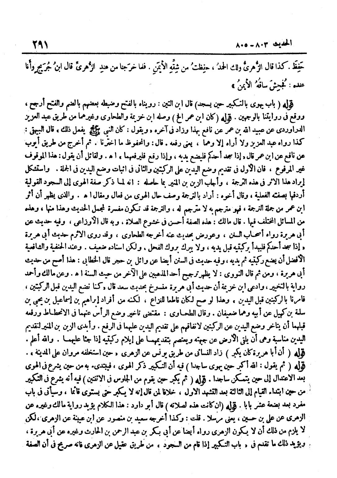 [803] قَوْلُهُ أَنَّ أَبَا هُرَيْرَةَ كَانَ يُكَبِّرُ زَادَ النَّسَائِيُّ مِنْ طَرِيقِ يُونُسَ عَنِ الزُّهْرِيِّ حِينَ اسْتَخْلَفَهُ مَرْوَانُ عَلَى الْمَدِينَةِ قَوْلُهُ ثُمَّ يَقُولُ اللَّهُ أَكْبَرُ حِينَ يَهْوِي سَاجِدًا فِيهِ أَنَّ التَّكْبِيرَ ذِكْرُ الْهُوِيِّ فَيَبْتَدِئُ بِهِ مِنْ حِينِ يَشْرَعُ فِي الْهُوِيِّ بَعْدَ الِاعْتِدَالِ إِلَى حِينِ يَتَمَكَّنُ سَاجِدًا قَوْلُهُ ثُمَّ يُكَبِّرُ حِينَ يَقُومُ مِنَ الْجُلُوسِ فِي الِاثْنَتَيْنِ فِيهِ أَنَّهُ يَشْرَعُ فِي التَّكْبِيرِ مِنْ حِينِ ابْتِدَاءِ الْقِيَامِ إِلَى الثَّالِثَةِ بَعْدَ التَّشَهُّدِ الْأَوَّلِ خِلَافًا لِمَنْ قَالَ إِنَّهُ لَا يُكَبِّرُ حَتَّى يَسْتَوِيَ قَائِمًا وَسَيَأْتِي فِي بَابٍ مُفْرَدٍ بَعْدَ بِضْعَةَ عَشَرَ بَابًا قَوْلُهُ إِنْ كَانَتْ هَذِهِ لَصَلَاتَهُ قَالَ أَبُو دَاوُدَ هَذَا الْكَلَامُ يُؤَيِّدُ رِوَايَةَ مَالِكٍ وَغَيْرِهِ عَنِ الزُّهْرِيِّ عَنْ عَلِيِّ بْنِ حُسَيْنٍ يَعْنِي مُرْسَلًا قُلْتُ وَكَذَا أَخْرَجَهُ سعيد بن مَنْصُور عَن بن عُيَيْنَةَ عَنِ الزُّهْرِيِّ لَكِنْ لَا يَلْزَمُ مِنْ ذَلِكَ أَنْ لَا يَكُونَ الزُّهْرِيُّ رَوَاهُ أَيْضًا عَنْ أَبِي بَكْرِ بْنِ عَبْدِ الرَّحْمَنِ بْنِ الْحَارِثِ وَغَيْرِهِ عَنْ أَبِي هُرَيْرَةَ وَيُؤَيِّدُ ذَلِكَ مَا تَقَدَّمَ فِي بَابِ التَّكْبِيرِ إِذَا قَامَ مِنَ السُّجُودِ مِنْ طَرِيقِ عَقِيلٍ عَنْ الزُّهْرِيِّ فَإِنَّهُ صَرِيحٌ فِي أَنَّ الصِّفَةَ