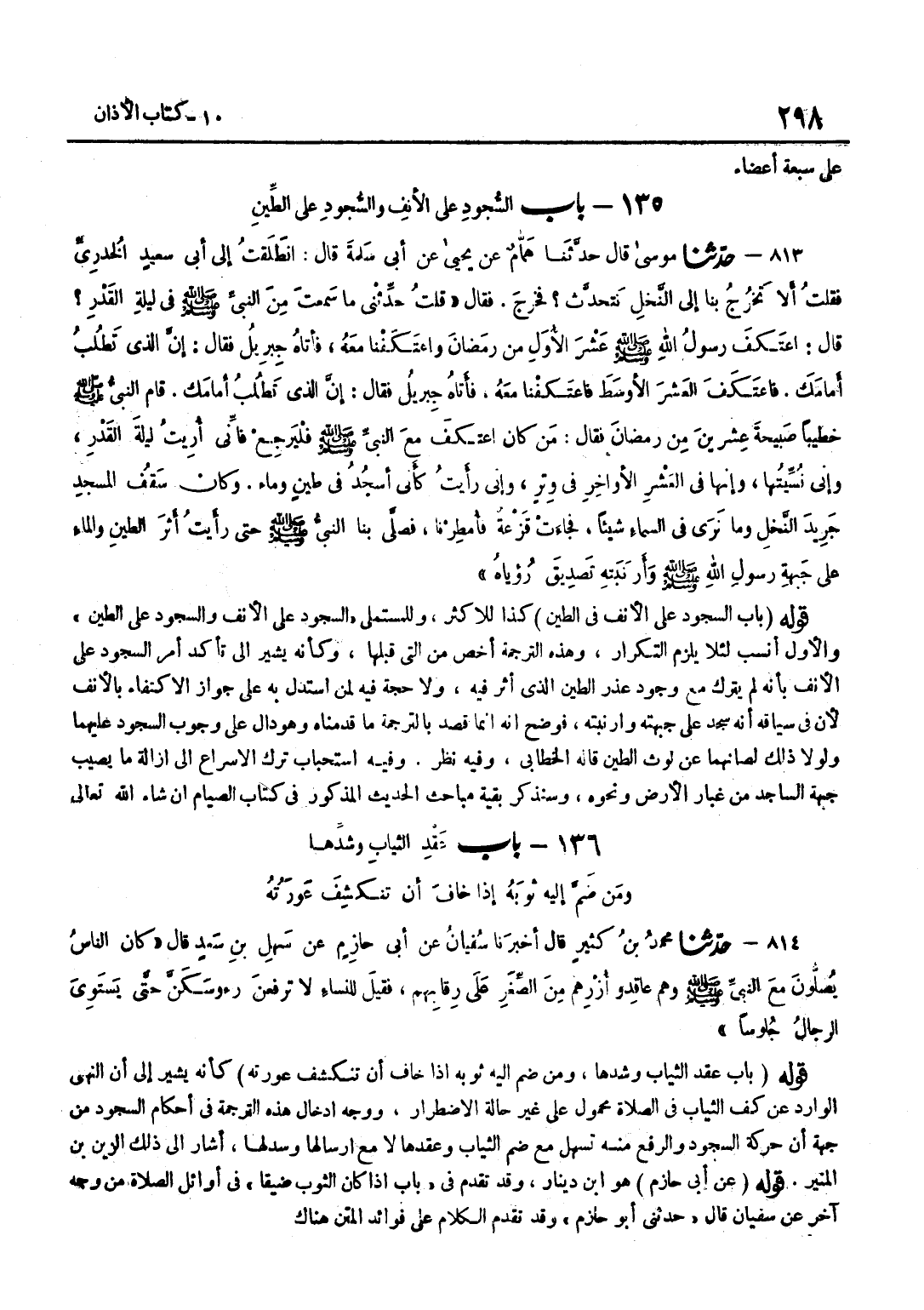 كَذَا لِلْأَكْثَرِ وَلِلْمُسْتَمْلِي السُّجُودُ عَلَى الْأَنْفِ وَالسُّجُودُ عَلَى الطِّينِ وَالْأَوَّلُ أَنْسَبُ لِئَلَّا يَلْزَمَ التَّكْرَارُ وَهَذِهِ التَّرْجَمَةُ أَخَصُّ مِنَ الَّتِي قَبْلَهَا وَكَأَنَّهُ يُشِيرُ إِلَى تَأَكُّدِ أَمْرِ السُّجُودِ عَلَى الْأَنْفِ بِأَنَّهُ لَمْ يُتْرَكْ مَعَ وُجُودِ عُذْرِ الطِّينِ الَّذِي أَثَّرَ فِيهِ وَلَا حُجَّةَ فِيهِ لِمَنِ اسْتَدَلَّ بِهِ عَلَى جَوَازِ الِاكْتِفَاءِ بِالْأَنْفِ لِأَنَّ فِي سِيَاقِهِ أَنَّهُ سَجَدَ عَلَى جَبْهَتِهِ وَأَرْنَبَتِهِ فَوَضَحَ أَنَّهُ إِنَّمَا قَصَدَ بِالتَّرْجَمَةِ مَا قَدَّمْنَاهُ وَهُوَ دَالٌّ عَلَى وُجُوبِ السُّجُودِ عَلَيْهِمَا وَلَوْلَا ذَلِكَ لَصَانَهُمَا عَنْ لَوْثِ الطِّينِ قَالَهُ الْخَطَّابِيُّ وَفِيهِ نَظَرٌ وَفِيهِ اسْتِحْبَابُ تَرْكِ الْإِسْرَاعِ إِلَى إِزَالَةِ مَا يُصِيبُ جَبْهَةَ السَّاجِدِ مِنْ غُبَارِ الْأَرْضِ وَنَحْوِهِ وَسَنَذْكُرُ بَقِيَّةَ مَبَاحِثِ الْحَدِيثِ الْمَذْكُورِ فِي كِتَابِ الصِّيَامِ إِنْ شَاءَ اللَّهُ تَعَالَى قَوْلُهُ بَابُ عَقْدِ الثِّيَابِ وَشَدِّهَا وَمَنْ ضَمَّ إِلَيْهِ ثَوْبَهُ إِذَا خَافَ أَنْ تَنْكَشِفَ عَوْرَتُهُ كَأَنَّهُ يُشِيرُ إِلَى أَنَّ النَّهْيَ الْوَارِدَ عَنْ كَفِّ الثِّيَابِ فِي الصَّلَاةِ مَحْمُولٌ عَلَى غَيْرِ حَالَةِ الِاضْطِرَارِ وَوَجْهُ إِدْخَالِ هَذِهِ التَّرْجَمَةِ فِي أَحْكَامِ السُّجُودِ مِنْ جِهَةِ أَنَّ حَرَكَةَ السُّجُودِ وَالرَّفْعِ مِنْهُ تَسْهُلُ مَعَ ضَمِّ الثِّيَابِ وَعَقْدِهَا لَا مَعَ إِرْسَالِهَا وَسَدْلِهَا أَشَارَ إِلَى ذَلِكَ الزَّيْنُ بْنُ الْمُنِيرِ