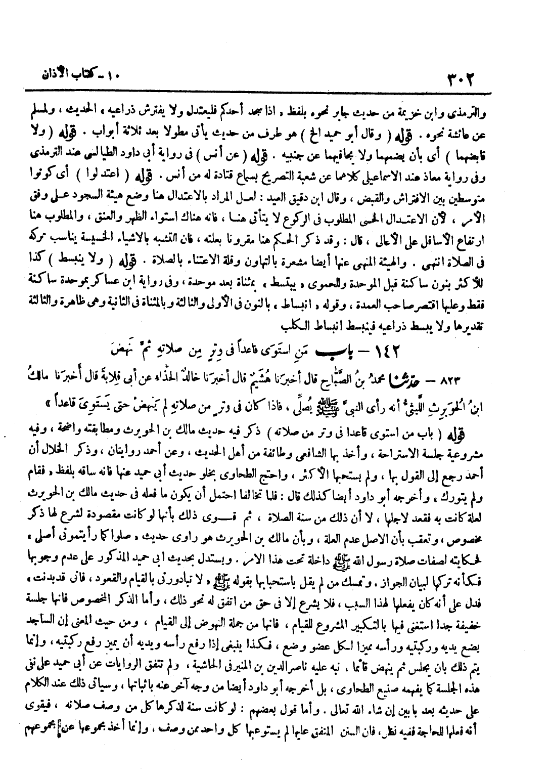 ذَكَرَ فِيهِ حَدِيثَ مَالِكِ بْنِ الْحُوَيْرِثِ وَمُطَابَقَتُهُ وَاضِحَةٌ وَفِيهِ مَشْرُوعِيَّةُ جِلْسَةِ الِاسْتِرَاحَةِ وَأَخَذَ بِهَا الشَّافِعِيُّ وَطَائِفَةٌ مِنْ أَهْلِ الْحَدِيثِ وَعَنْ أَحْمَدَ رِوَايَتَانِ وَذَكَرَ الْخَلَّالُ أَنَّ أَحْمَدَ رَجَعَ إِلَى الْقَوْلِ بِهَا وَلَمْ يَسْتَحِبَّهَا الْأَكْثَرُ وَاحْتَجَّ الطَّحَاوِيُّ بِخُلُوِّ حَدِيثِ أَبِي حُمَيْدٍ عَنْهَا فَإِنَّهُ سَاقَهُ بِلَفْظِ فَقَامَ وَلَمْ يَتَوَرَّكْ وَأَخْرَجَهُ أَبُو دَاوُدَ أَيْضًا كَذَلِكَ قَالَ فَلَمَّا تَخَالَفَا احْتَمَلَ أَنْ يَكُونَ مَا فَعَلَهُ فِي حَدِيثِ مَالِكِ بْنِ الْحُوَيْرِثِ لِعِلَّةٍ كَانَتْ بِهِ فَقَعَدَ لِأَجْلِهَا لَا أَنَّ ذَلِكَ مِنْ سُنَّةِ الصَّلَاةِ ثُمَّ قَوَّى ذَلِكَ بِأَنَّهَا لَوْ كَانَتْ مَقْصُودَةً لَشُرِعَ لَهَا ذِكْرٌ مَخْصُوصٌ وَتُعُقِّبَ بِأَنَّ الْأَصْلَ عَدَمُ الْعِلَّةِ وَبِأَنَّ مَالِكَ بْنَ الْحُوَيْرِثِ هُوَ رَاوِي حَدِيثِ صَلُّوا كَمَا رَأَيْتُمُونِي أُصَلِّي فَحِكَايَتُهُ لِصِفَاتِ صَلَاةُ رَسُولِ اللَّهِ صَلَّى اللَّهُ عَلَيْهِ وَسَلَّمَ دَاخِلَةٌ تَحْتَ هَذَا الْأَمْرِ وَيُسْتَدَلُّ بِحَدِيثِ أَبِي حُمَيْدٍ الْمَذْكُورِ عَلَى عَدَمِ وُجُوبِهَا فَكَأَنَّهُ تَرَكَهَا لِبَيَانِ الْجَوَازِ وَتَمَسَّكَ مَنْ لَمْ يَقُلْ بِاسْتِحْبَابِهَا بِقَوْلِهِ صَلَّى اللَّهُ عَلَيْهِ وَسَلَّمَ لَا تُبَادِرُونِي بِالْقِيَامِ وَالْقُعُودِ فَإِنِّي قَدْ بَدَّنْتُ فَدَلَّ عَلَى أَنَّهُ كَانَ يَفْعَلُهَا لِهَذَا السَّبَبِ فَلَا يُشْرَعُ إِلَّا فِي حَقِّ مَنِ اتَّفَقَ لَهُ نَحْوُ ذَلِكَ وَأَمَّا الذِّكْرُ الْمَخْصُوصُ فَإِنَّهَا جِلْسَةٌ خَفِيفَةٌ جِدًّا اسْتُغْنِيَ فِيهَا بِالتَّكْبِيرِ الْمَشْرُوعِ لِلْقِيَامِ فَإِنَّهَا مِنْ جُمْلَةِ النُّهُوضِ إِلَى الْقِيَامِ وَمِنْ حَيْثُ الْمَعْنَى إِنَّ السَّاجِدَ يَضَعُ يَدَيْهِ وَرُكْبَتَيْهِ وَرَأْسَهُ مُمَيِّزًا لِكُلِّ عُضْوٍ وَضَعَ فَكَذَا يَنْبَغِي إِذَا رَفَعَ رَأْسَهُ وَيَدَيْهِ أَنْ يُمَيِّزَ رَفْعَ رُكْبَتَيْهِ وَإِنَّمَا يَتِمُّ ذَلِكَ بِأَنْ يَجْلِسَ ثُمَّ يَنْهَضَ قَائِمًا نَبَّهَ عَلَيْهِ نَاصِرُ الدِّينِ بْنُ الْمُنِيرِ فِي الْحَاشِيَةِ وَلَمْ تَتَّفِقِ الرِّوَايَاتُ عَنْ أَبِي حُمَيْدٍ عَلَى نَفْيِ هَذِهِ الْجِلْسَةِ كَمَا يُفْهِمُهُ صَنِيعُ الطَّحَاوِيِّ بَلْ أَخْرَجَهُ أَبُو دَاوُدَ أَيْضًا مِنْ وَجْهٍ آخَرَ عَنْهُ بِإِثْبَاتِهَا وَسَيَأْتِي ذَلِكَ عِنْدَ الْكَلَامِ عَلَى حَدِيثِهِ بَعْدَ بَابَيْنِ إِنْ شَاءَ اللَّهُ تَعَالَى وَأَمَّا قَوْلُ بَعْضِهِمْ لَوْ كَانَتْ سُنَّةً لَذَكَرَهَا كُلُّ مَنْ وَصَفَ صَلَاتَهُ فَيُقَوِّي أَنَّهُ فَعَلَهَا لِلْحَاجَةِ فَفِيهِ نَظَرٌ فَإِنَّ السُّنَنَ الْمُتَّفَقَ عَلَيْهَا لَمْ يَسْتَوْعِبْهَا كُلُّ وَاحِدٍ مِمَّنْ وَصَفَ وَإِنَّمَا أُخِذَ مَجْمُوعُهَا عَنْ مجموعهم