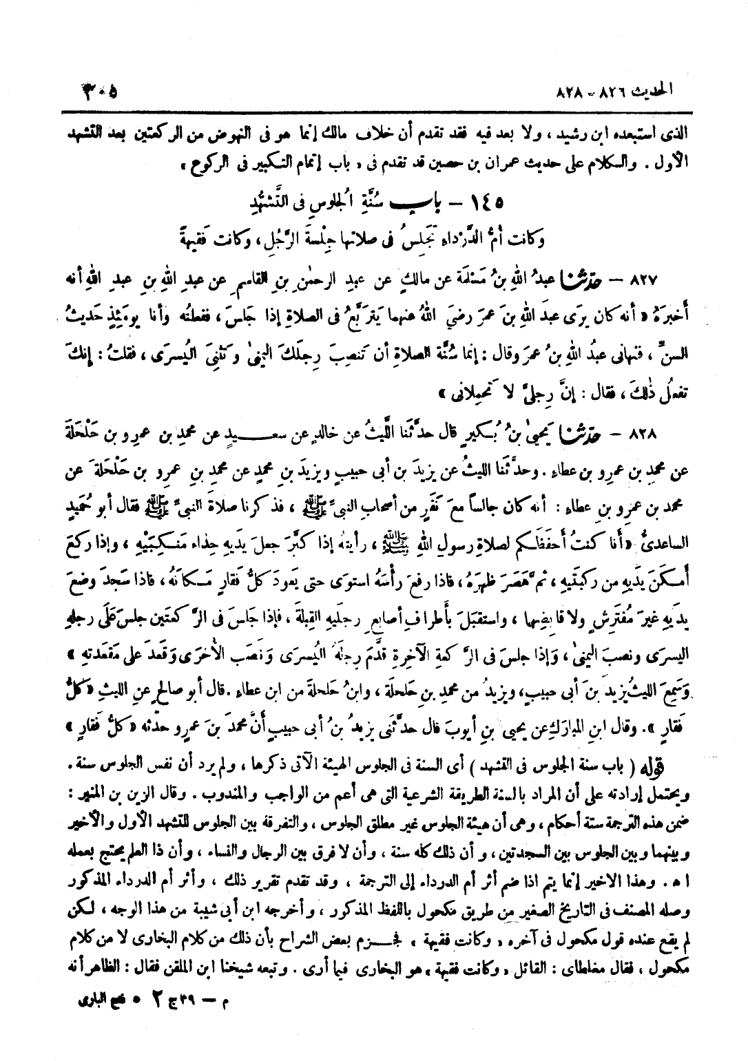 أَيِ السُّنَّةُ فِي الْجُلُوسِ الْهَيْئَةُ الْآتِي ذِكْرُهَا وَلَمْ يَرِدْ أَنَّ نَفْسَ الْجُلُوسِ سُنَّةٌ وَيَحْتَمِلُ إِرَادَتَهُ عَلَى أَنَّ الْمُرَادَ بِالسُّنَّةِ الطَّرِيقَةُ الشَّرْعِيَّةُ الَّتِي هِيَ أَعم مِنَ الْوَاجِبِ وَالْمَنْدُوبِ وَقَالَ الزَّيْنُ بْنُ الْمُنِيرِ ضَمَّنَ هَذِهِ التَّرْجَمَةَ سِتَّةَ أَحْكَامٍ وَهِيَ أَنَّ هَيْئَةَ الْجُلُوسِ غَيْرُ مُطْلَقِ الْجُلُوسِ وَالتَّفْرِقَةُ بَيْنَ الْجُلُوسِ لِلتَّشَهُّدِ الْأَوَّلِ وَالْأَخِيرِ وَبَيْنَهُمَا وَبَيْنَ الْجُلُوسِ بَيْنَ السَّجْدَتَيْنِ وَأَنَّ ذَلِكَ كُلَّهُ سُنَّةٌ وَأَنْ لَا فَرْقَ بَيْنَ الرِّجَالِ وَالنِّسَاءِ وَأَنَّ ذَا الْعِلْمِ يُحْتَجُّ بِعَمَلِهِ اه وَهَذَا الْأَخِيرُ إِنَّمَا يَتِمُّ إِذَا ضُمَّ أَثَرُ أُمِّ الدَّرْدَاءِ إِلَى التَّرْجَمَةِ وَقَدْ تَقَدَّمَ تَقْرِيرُ ذَلِكَ وَأَثَرُ أُمِّ الدَّرْدَاءِ الْمَذْكُورُ وَصَلَهُ الْمُصَنِّفُ فِي التَّارِيخِ الصَّغِيرِ مِنْ طَرِيقِ مَكْحُول بِاللَّفْظِ الْمَذْكُور وَأخرجه بن أَبِي شَيْبَةَ مِنْ هَذَا الْوَجْهِ لَكِنْ لَمْ يَقَعْ عِنْدَهُ قَوْلُ مَكْحُولٍ فِي آخِرِهِ وَكَانَتْ فَقِيهَةً فَجَزَمَ بَعْضُ الشُّرَّاحِ بِأَنَّ ذَلِكَ مِنْ كَلَامِ الْبُخَارِيِّ لَا مِنْ كَلَامِ مَكْحُولٍ فَقَالَ مُغَلْطَايْ الْقَائِلُ وَكَانَتْ فَقِيهَةً هُوَ الْبُخَارِيُّ فِيمَا أرى وَتَبعهُ شَيخنَا بن الْمُلَقِّنِ فَقَالَ الظَّاهِرُ أَنَّهُ
