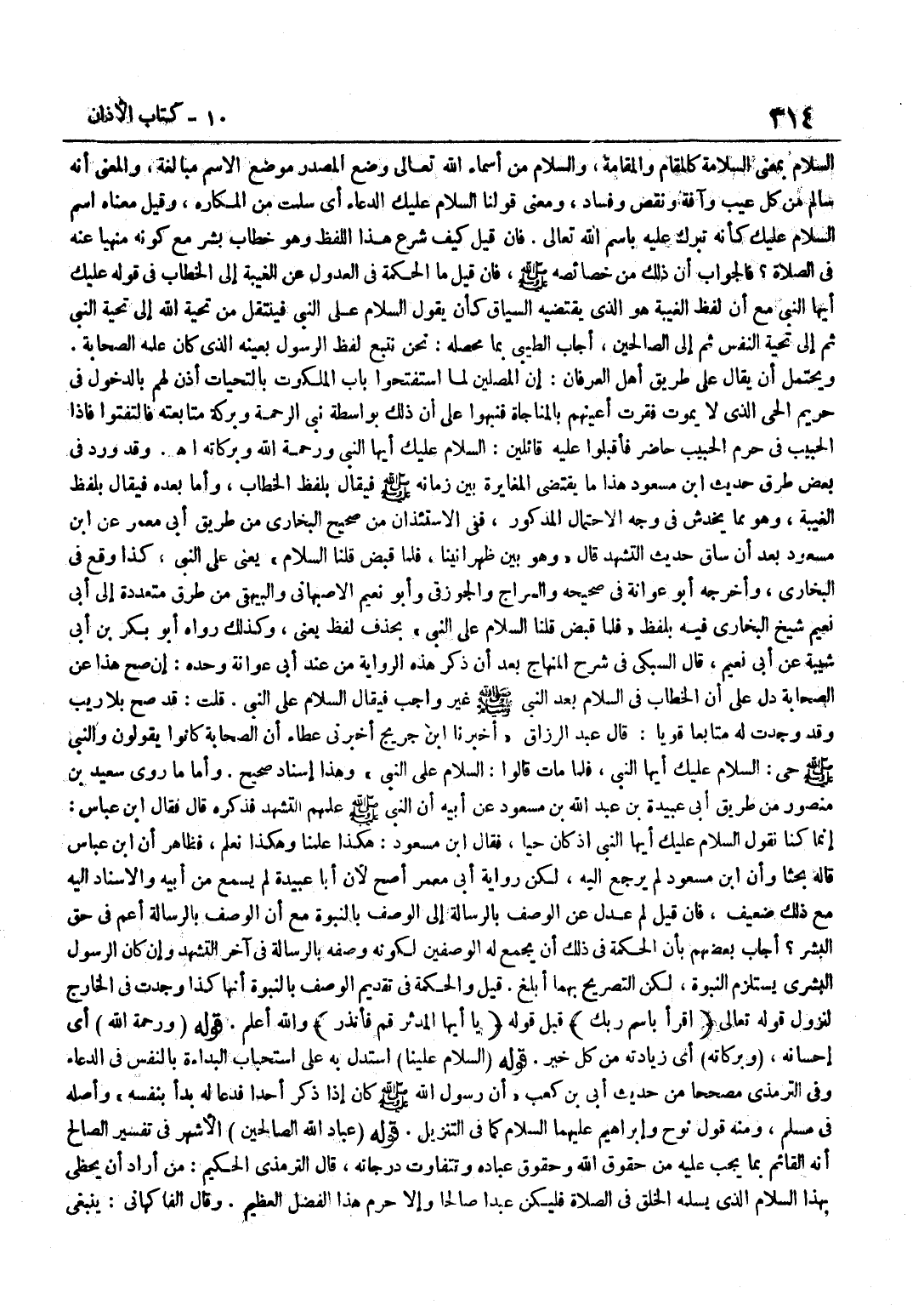 السَّلَامُ بِمَعْنَى السَّلَامَةِ كَالْمَقَامِ وَالْمَقَامَةِ وَالسَّلَامُ مِنْ أَسْمَاءِ اللَّهِ تَعَالَى وُضِعَ الْمَصْدَرُ مَوْضِعَ الِاسْمِ مُبَالَغَةً وَالْمَعْنَى أَنَّهُ سَالِمٌ مِنْ كُلِّ عَيْبٍ وَآفَةٍ وَنَقْصٍ وَفَسَادٍ وَمَعْنَى قَوْلِنَا السَّلَامُ عَلَيْكَ الدُّعَاءُ أَيْ سَلِمْتَ مِنَ الْمَكَارِهِ وَقِيلَ مَعْنَاهُ اسْمُ السَّلَامِ عَلَيْكَ كَأَنَّهُ تَبَرَّكَ عَلَيْهِ بِاسْمِ اللَّهِ تَعَالَى فَإِنْ قِيلَ كَيْفَ شُرِعَ هَذَا اللَّفْظُ وَهُوَ خِطَابُ بَشَرٍ مَعَ كَوْنِهِ مَنْهِيًّا عَنْهُ فِي الصَّلَاةِ فَالْجَوَابُ أَنَّ ذَلِكَ مِنْ خَصَائِصِهِ صَلَّى اللَّهُ عَلَيْهِ وَسَلَّمَ فَإِنْ قِيلَ مَا الْحِكْمَةُ فِي الْعُدُولِ عَنِ الْغَيْبَةِ إِلَى الْخِطَابِ فِي قَوْلِهِ عَلَيْكَ أَيُّهَا النَّبِيُّ مَعَ أَنَّ لَفْظَ الْغَيْبَةِ هُوَ الَّذِي يَقْتَضِيهِ السِّيَاقُ كَأَنْ يَقُولَ السَّلَامُ عَلَى النَّبِيِّ فَيَنْتَقِلُ مِنْ تَحِيَّةِ اللَّهِ إِلَى تَحِيَّةِ النَّبِيِّ ثُمَّ إِلَى تَحِيَّةِ النَّفْسِ ثُمَّ إِلَى الصَّالِحِينَ أَجَابَ الطِّيبِيُّ بِمَا مُحَصَّلُهُ نَحْنُ نَتَّبِعُ لَفْظَ الرَّسُولِ بِعَيْنِهِ الَّذِي كَانَ عَلَّمَهُ الصَّحَابَةَ وَيَحْتَمِلُ أَنْ يُقَالَ عَلَى طَرِيقِ أَهْلِ الْعِرْفَانِ إِنَّ الْمُصَلِّينَ لَمَّا اسْتَفْتَحُوا بَابَ الْمَلَكُوتِ بِالتَّحِيَّاتِ أُذِنَ لَهُمْ بِالدُّخُولِ فِي حَرِيمِ الْحَيِّ الَّذِي لَا يَمُوتُ فَقَرَّتْ أَعْيُنُهُمْ بِالْمُنَاجَاةِ فَنُبِّهُوا عَلَى أَنَّ ذَلِكَ بِوَاسِطَةِ نَبِيِّ الرَّحْمَةِ وَبَرَكَةِ مُتَابَعَتِهِ فَالْتَفَتُوا فَإِذَا الْحَبِيبُ فِي حَرَمِ الْحَبِيبِ حَاضِرٌ فَأَقْبَلُوا عَلَيْهِ قَائِلِينَ السَّلَامُ عَلَيْكَ أَيُّهَا النَّبِيُّ وَرَحْمَةُ اللَّهِ وَبَرَكَاتُهُ اه وَقَدْ وَرَدَ فِي بَعْضِ طُرُقِ حَدِيثِ بن مَسْعُودٍ هَذَا مَا يَقْتَضِي الْمُغَايَرَةَ بَيْنَ زَمَانِهِ صَلَّى اللَّهُ عَلَيْهِ وَسَلَّمَ فَيُقَالُ بِلَفْظِ الْخِطَابِ وَأَمَّا بَعْدَهُ فَيُقَالُ بِلَفْظِ الْغَيْبَةِ وَهُوَ مِمَّا يُخْدَشُ فِي وَجْهِ الِاحْتِمَالِ الْمَذْكُورِ فَفِي الِاسْتِئْذَانِ مِنْ صَحِيحِ الْبُخَارِيِّ مِنْ طَرِيقِ أَبِي مَعْمَرٍ عَن بن مَسْعُودٍ بَعْدَ أَنْ سَاقَ حَدِيثَ التَّشَهُّدِ قَالَ وَهُوَ بَيْنَ ظَهْرَانَيْنَا فَلَمَّا قُبِضَ قُلْنَا السَّلَامُ يَعْنِي عَلَى النَّبِيِّ كَذَا وَقَعَ فِي الْبُخَارِيِّ وَأَخْرَجَهُ أَبُو عَوَانَةَ فِي صَحِيحِهِ وَالسَّرَّاجُ وَالْجَوْزَقِيُّ وَأَبُو نُعَيْمٍ الْأَصْبَهَانِيُّ وَالْبَيْهَقِيُّ مِنْ طُرُقٍ مُتَعَدِّدَةٍ إِلَى أَبِي نُعَيْمٍ شَيْخِ الْبُخَارِيِّ فِيهِ بِلَفْظِ فَلَمَّا قُبِضَ قُلْنَا السَّلَامُ عَلَى النَّبِيِّ بِحَذْفِ لَفْظِ يَعْنِي وَكَذَلِكَ رَوَاهُ أَبُو بَكْرِ بْنُ أَبِي شَيْبَةَ عَنْ أَبِي نُعَيْمٍ قَالَ السُّبْكِيُّ فِي شَرْحِ الْمِنْهَاجِ بَعْدَ أَنْ ذَكَرَ هَذِهِ الرِّوَايَةَ مِنْ عِنْدِ أَبِي عَوَانَةَ وَحْدَهُ إِنْ صَحَّ هَذَا عَنِ الصَّحَابَةِ دَلَّ عَلَى أَنَّ الْخِطَابَ فِي السَّلَامِ بَعْدَ النَّبِيِّ صَلَّى اللَّهُ عَلَيْهِ وَسَلَّمَ غَيْرُ وَاجِبٍ فَيُقَالُ السَّلَامُ عَلَى النَّبِيِّ قُلْتُ قَدْ صَحَّ بِلَا رَيْبٍ وَقَدْ وَجَدْتُ لَهُ مُتَابِعًا قَوِيًّا قَالَ عَبْدُ الرَّزَّاقِ أخبرنَا بن جُرَيْجٍ أَخْبَرَنِي عَطَاءٌ أَنَّ الصَّحَابَةَ كَانُوا يَقُولُونَ وَالنَّبِيُّ صَلَّى اللَّهُ عَلَيْهِ وَسَلَّمَ حَيٌّ السَّلَامُ عَلَيْكَ أَيُّهَا النَّبِيُّ فَلَمَّا مَاتَ قَالُوا السَّلَامُ عَلَى النَّبِيِّ وَهَذَا إِسْنَادٌ صَحِيحٌ وَأَمَّا مَا رَوَى سَعِيدُ بْنُ مَنْصُورٍ مِنْ طَرِيقِ أَبِي عُبَيْ