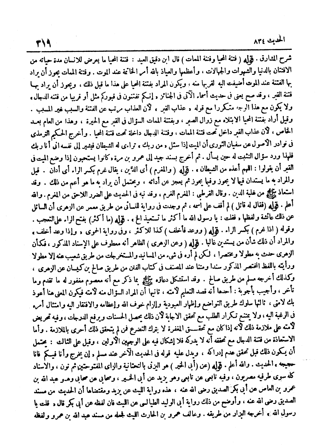 شَرْحِ الْمَشَارِقِ قَوْلُهُ فِتْنَةِ الْمَحْيَا وَفِتْنَةِ الْمَمَاتِ قَالَ بن دَقِيقِ الْعِيدِ فِتْنَةُ الْمَحْيَا مَا يَعْرِضُ لِلْإِنْسَانِ مُدَّةَ حَيَاتِهِ مِنَ الِافْتِتَانِ بِالدُّنْيَا وَالشَّهَوَاتِ وَالْجَهَالَاتِ وَأَعْظَمُهَا وَالْعِيَاذُ بِاللَّهِ أَمْرُ الْخَاتِمَةِ عِنْدَ الْمَوْتِ وَفِتْنَةُ الْمَمَاتِ يَجُوزُ أَنْ يُرَادَ بِهَا الْفِتْنَةُ عِنْدَ الْمَوْتِ أُضِيفَتْ إِلَيْهِ لِقُرْبِهَا مِنْهُ وَيَكُونُ الْمُرَادُ بِفِتْنَةِ الْمَحْيَا عَلَى هَذَا مَا قَبْلَ ذَلِكَ وَيَجُوزُ أَنْ يُرَادَ بِهَا فِتْنَةُ الْقَبْرِ وَقَدْ صَحَّ يَعْنِي فِي حَدِيثِ أَسْمَاءَ الْآتِي فِي الْجَنَائِزِ إِنَّكُمْ تُفْتَنُونَ فِي قُبُورِكُمْ مِثْلَ أَوْ قَرِيبًا مِنْ فِتْنَةِ الدَّجَّالِ وَلَا يَكُونُ مَعَ هَذَا الْوَجْهِ مُتَكَرِّرًا مَعَ قَوْلِهِ عَذَابِ الْقَبْرِ لِأَنَّ الْعَذَابَ مُرَتَّبٌ عَنِ الْفِتْنَةِ وَالسَّبَبُ غَيْرُ الْمُسَبَّبِ وَقِيلَ أَرَادَ بِفِتْنَةِ الْمَحْيَا الِابْتِلَاءَ مَعَ زَوَالِ الصَّبْرِ وَبِفِتْنَةِ الْمَمَاتِ السُّؤَالَ فِي الْقَبْرِ مَعَ الْحِيرَةِ وَهَذَا مِنَ الْعَامِّ بَعْدَ الْخَاصِّ لِأَنَّ عَذَابَ الْقَبْرِ دَاخِلٌ تَحْتَ فِتْنَةِ الْمَمَاتِ وَفِتْنَةُ الدَّجَّالِ دَاخِلَةٌ تَحْتَ فِتْنَةِ الْمَحْيَا وَأَخْرَجَ الْحَكِيمُ التِّرْمِذِيُّ فِي نَوَادِرِ الْأُصُولِ عَنْ سُفْيَانَ الثَّوْرِيِّ أَنَّ الْمَيِّتَ إِذَا سُئِلَ مَنْ رَبُّكَ تَرَاءَى لَهُ الشَّيْطَانُ فَيُشِيرُ إِلَى نَفْسِهِ إِنِّي أَنَا رَبُّكَ فَلِهَذَا وَرَدَ سُؤَالُ التَّثَبُّتِ لَهُ حِينَ يُسْأَلُ ثُمَّ أَخْرَجَ بِسَنَدٍ جَيِّدٍ إِلَى عَمْرِو بْنِ مُرَّةَ كَانُوا يَسْتَحِبُّونَ إِذَا وُضِعَ الْمَيِّتُ فِي الْقَبْرِ أَنْ يَقُولُوا اللَّهُمَّ أَعِذْهُ مِنَ الشَّيْطَانِ قَوْلُهُ وَالْمَغْرَمِ أَيِ الدَّيْنِ يُقَالُ غَرِمَ بِكَسْرِ الرَّاءِ أَيِ ادَّانَ قِيلَ وَالْمُرَادُ بِهِ مَا يُسْتَدَانُ فِيمَا لَا يَجُوزُ وَفِيمَا يَجُوزُ ثُمَّ يَعْجِزُ عَنْ أَدَائِهِ وَيَحْتَمِلُ أَنْ يُرَادَ بِهِ مَا هُوَ أَعَمُّ مِنْ ذَلِكَ وَقَدِ اسْتَعَاذَ صَلَّى اللَّهُ عَلَيْهِ وَسَلَّمَ مِنْ غَلَبَةِ الدَّيْنِ وَقَالَ الْقُرْطُبِيُّ الْمَغْرَمُ الْغُرْمُ وَقَدْ نَبَّهَ فِي الْحَدِيثِ عَلَى الضَّرَرِ اللَّاحِقِ مِنَ الْمَغْرَمِ وَاللَّهُ أَعْلَمُ قَوْلُهُ فَقَالَ لَهُ قَائِلٌ لَمْ أَقِفْ عَلَى اسْمِهِ ثُمَّ وَجَدْتُ فِي رِوَايَةٍ لِلنَّسَائِيِّ مِنْ طَرِيقِ مَعْمَرٍ عَنِ الزُّهْرِيِّ أَنَّ السَّائِلَ عَنْ ذَلِكَ عَائِشَةُ وَلَفْظُهَا فَقُلْتُ يَا رَسُولَ اللَّهِ مَا أَكْثَرَ مَا تَسْتَعِيذُ إِلَخْ قَوْلُهُ مَا أَكْثَرَ بِفَتْحِ الرَّاءِ عَلَى التَّعَجُّبِ وقَوْلُهُ إِذَا غَرِمَ بِكَسْرِ الرَّاءِ قَوْلُهُ وَوَعَدَ فَأَخْلَفَ كَذَا لِلْأَكْثَرِ وَفِي رِوَايَةِ الْحَمَوِيِّ وَإِذَا وَعَدَ أَخْلَفَ وَالْمُرَادُ أَنَّ ذَلِكَ شَأْنُ مَنْ يَسْتَدِينُ غَالِبًا قَوْلُهُ وَعَنِ الزُّهْرِيِّ الظَّاهِرُ أَنَّهُ مَعْطُوفٌ عَلَى الْإِسْنَادِ الْمَذْكُورِ فَكَأَنَّ الزُّهْرِيَّ حَدَّثَ بِهِ مُطَوَّلًا وَمُخْتَصَرًا لَكِنْ لَمْ أَرَهُ فِي شَيْءٍ مِنَ الْمَسَانِيدِ وَالْمُسْتَخْرَجَاتِ مِنْ طَرِيقِ شُعَيْبٍ عَنْهُ إِلَّا مُطَوَّلًا وَرَأَيْتُهُ بِاللَّفْظِ الْمُخْتَصَرِ الْمَذْكُورِ سَنَدًا وَمَتْنًا عِنْدَ الْمُصَنِّفِ فِي كِتَابِ الْفِتَنِ مِنْ طَرِيقِ صَالِحِ بْنِ كَيْسَانَ عَنِ الزُّهْرِيِّ وَكَذَلِكَ أَخْرَجَهُ مُسْلِمٌ مِنْ طَرِيقِ صَالِحٍ وَقَدِ اسْتُشْكِلَ دُعَاؤُهُ صَلَّى اللَّهُ عَلَيْهِ وَسَلَّمَ بِمَا ذُكِرَ مَعَ أَنَّهُ مَعْصُومٌ مَغْفُورٌ لَهُ مَا تَقَدَّمَ وَمَا 