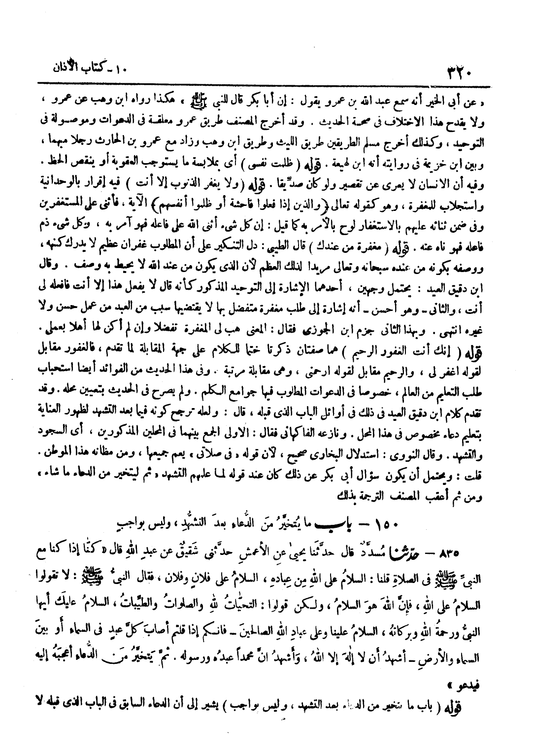 عَنْ أَبِي الْخَيْرِ أَنَّهُ سَمِعَ عَبْدَ اللَّهِ بْنَ عَمْرٍو يَقُولُ إِنَّ أَبَا بَكْرٍ قَالَ لِلنَّبِيِّ صَلَّى اللَّهُ عَلَيْهِ وَسَلَّمَ هَكَذَا رَوَاهُ بن وَهْبٍ عَنْ عَمْرٍو وَلَا يَقْدَحُ هَذَا الِاخْتِلَافُ فِي صِحَّةِ الْحَدِيثِ وَقَدْ أَخْرَجَ الْمُصَنِّفُ طَرِيقَ عَمْرٍو مُعَلَّقَةً فِي الدَّعَوَاتِ وَمَوْصُولَةً فِي التَّوْحِيدِ وَكَذَلِكَ أَخْرَجَ مُسْلِمٌ الطَّرِيقَيْنِ طَرِيقَ اللَّيْثِ وَطَرِيقَ بن وَهْبٍ وَزَادَ مَعَ عَمْرِو بْنِ الْحَارِثِ رَجُلًا مُبْهما وَبَين بن خُزَيْمَة فِي رِوَايَته أَنه بن لَهِيعَةَ قَوْلُهُ ظَلَمْتُ نَفْسِي أَيْ بِمُلَابَسَةِ مَا يَسْتَوْجِبُ الْعُقُوبَةَ أَوْ يُنْقِصُ الْحَظَّ وَفِيهِ أَنَّ الْإِنْسَانَ لَا يَعْرَى عَنْ تَقْصِيرٍ وَلَوْ كَانَ صِدِّيقًا قَوْلُهُ وَلَا يَغْفِرُ الذُّنُوبَ إِلَّا أَنْتَ فِيهِ إِقْرَارٌ بِالْوَحْدَانِيَّةِ وَاسْتِجْلَابٌ لِلْمَغْفِرَةِ وَهُوَ كَقَوْلِهِ تَعَالَى وَالَّذِينَ إِذَا فَعَلُوا فَاحِشَةً أَوْ ظَلَمُوا أَنْفُسَهُمْ الْآيَةُ فَأَثْنَى عَلَى الْمُسْتَغْفِرِينَ وَفِي ضِمْنِ ثَنَائِهِ عَلَيْهِمْ بِالِاسْتِغْفَارِ لَوَّحَ بِالْأَمْرِ بِهِ كَمَا قِيلَ إِنَّ كُلَّ شَيْءٍ أَثْنَى اللَّهُ عَلَى فَاعِلِهِ فَهُوَ آمِرٌ بِهِ وَكُلُّ شَيْءٍ ذَمَّ فَاعِلَهُ فَهُوَ نَاهٍ عَنْهُ قَوْلُهُ مَغْفِرَةً مِنْ عِنْدِكَ قَالَ الطِّيبِيُّ دَلَّ التَّنْكِيرُ عَلَى أَنَّ الْمَطْلُوبَ غُفْرَانٌ عَظِيمٌ لَا يُدْرَكُ كُنْهُهُ وَوَصَفَهُ بِكَوْنِهِ مِنْ عِنْدِهِ سُبْحَانَهُ وَتَعَالَى مُرِيدًا لِذَلِكَ الْعِظَمِ لِأَنَّ الَّذِي يَكُونُ مِنْ عِنْدِ اللَّهِ لَا يُحِيط بِهِ وصف وَقَالَ بن دَقِيقِ الْعِيدِ يَحْتَمِلُ وَجْهَيْنِ أَحَدُهُمَا الْإِشَارَةُ إِلَى التَّوْحِيدِ الْمَذْكُورِ كَأَنَّهُ قَالَ لَا يَفْعَلُ هَذَا إِلَّا أَنْتَ فَافْعَلْهُ لِي أَنْتَ وَالثَّانِي وَهُوَ أَحْسَنُ أَنَّهُ إِشَارَةٌ إِلَى طَلَبِ مَغْفِرَةٍ مُتَفَضَّلٍ بِهَا لَا يَقْتَضِيهَا سَبَبٌ مِنَ الْعَبْدِ مِنْ عَمَلٍ حَسَنٍ وَلَا غَيْرِهِ انْتَهَى وَبِهَذَا الثَّانِي جزم بن الْجَوْزِيِّ فَقَالَ الْمَعْنَى هَبْ لِيَ الْمَغْفِرَةَ تَفَضُّلًا وَإِنْ لَمْ أَكُنْ لَهَا أَهْلًا بِعَمَلِي قَوْلُهُ إِنَّكَ أَنْتَ الْغَفُورُ الرَّحِيمُ هُمَا صِفَتَانِ ذُكِرَتَا خَتْمًا لِلْكَلَامِ عَلَى جِهَةِ الْمُقَابَلَةِ لِمَا تَقَدَّمَ فَالْغَفُورُ مُقَابِلٌ لِقَوْلِهِ اغْفِرْ لِي وَالرَّحِيمُ مُقَابِلٌ لِقَوْلِهِ ارْحَمْنِي وَهِيَ مُقَابَلَةٌ مُرَتَّبَةٌ وَفِي هَذَا الْحَدِيثِ مِنَ الْفَوَائِدِ أَيْضًا اسْتِحْبَابُ طَلَبِ التَّعْلِيمِ مِنَ الْعَالِمِ خُصُوصًا فِي الدَّعَوَاتِ الْمَطْلُوبُ فِيهَا جَوَامِعُ الْكَلِمِ وَلَمْ يُصَرِّحْ فِي الْحَدِيثِ بِتَعْيِينِ مَحَله وَقد تقدم كَلَام بن دَقِيقِ الْعِيدِ فِي ذَلِكَ فِي أَوَائِلِ الْبَابِ الَّذِي قَبْلَهُ قَالَ وَلَعَلَّهُ تَرَجَّحَ كَوْنُهُ فِيمَا بَعْدَ التَّشَهُّدِ لِظُهُورِ الْعِنَايَةِ بِتَعْلِيمِ دُعَاءٍ مَخْصُوصٍ فِي هَذَا الْمَحَلِّ وَنَازَعَهُ الْفَاكِهَانِيُّ فَقَالَ الْأَوْلَى الْجَمْعُ بَيْنَهُمَا فِي الْمَحَلَّيْنِ الْمَذْكُورَيْنِ أَيِ السُّجُودِ وَالتَّشَهُّدِ وَقَالَ النَّوَوِيُّ اسْتِدْلَالُ الْبُخَارِيِّ صَحِيحٌ لِأَنَّ قَوْلَهُ فِي صَلَاتِي يَعُمُّ جَمِيعَهَا وَمِنْ مَظَانِّهِ هَذَا الْمَوْطِنُ قُلْتُ وَيَحْتَمِلُ أَنْ يَكُونَ سُؤَالُ أَبِي بَكْرٍ عَنْ ذَلِكَ كَانَ عِنْدَ قَوْلِهِ لَمَّا عَلَّمَهُمُ التَّشَهُّدَ ثُمَّ لْيَتَخَيَّرْ مِنَ الدُّعَاءِ مَا شَاءَ وَمِنْ ثَمَّ أَعْقَبَ الْمُصَنِّفُ التَّرْجَمَةَ بذلك
