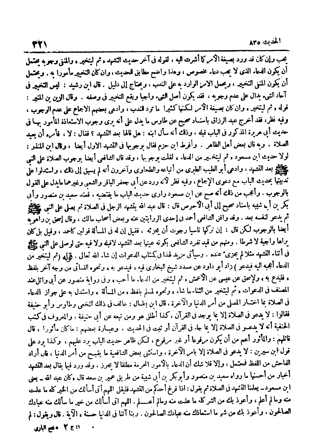 [835] قَوْلُهُ ثُمَّ لْيَتَخَيَّرْ وَإِنْ كَانَ بِصِيغَةِ الْأَمْرِ لَكِنَّهَا كَثِيرًا مَا تَرِدُ لِلنَّدْبِ وَادَّعَى بَعْضُهُمُ الْإِجْمَاعَ عَلَى عَدَمِ الْوُجُوبِ وَفِيهِ نَظَرٌ فَقَدْ أَخْرَجَ عَبْدُ الرَّزَّاقِ بِإِسْنَادٍ صَحِيحٍ عَنْ طَاوُسٍ مَا يَدُلُّ عَلَى أَنَّهُ يَرَى وُجُوبَ الِاسْتِعَاذَةِ الْمَأْمُورِ بِهَا فِي حَدِيثِ أَبِي هُرَيْرَةَ الْمَذْكُورِ فِي الْبَابِ قَبْلَهُ وَذَلِكَ أَنَّهُ سَأَلَ ابْنَهُ هَلْ قَالَهَا بَعْدَ التَّشَهُّدِ فَقَالَ لَا فَأَمَرَهُ أَنْ يُعِيدَ الصَّلَاةَ وَبِهِ قَالَ بعض أهل الظَّاهِر وأفرط بن حَزْمٍ فَقَالَ بِوُجُوبِهَا فِي التَّشَهُّدِ الْأَوَّلِ أَيْضًا وَقَالَ بن الْمُنْذر لَوْلَا حَدِيث بن مَسْعُودٍ ثُمَّ لْيَتَخَيَّرْ مِنَ الدُّعَاءِ لَقُلْتُ بِوُجُوبِهَا وَقَدْ قَالَ الشَّافِعِيُّ أَيْضًا بِوُجُوبِ الصَّلَاةِ عَلَى النَّبِيِّ صَلَّى اللَّهُ عَلَيْهِ وَسَلَّمَ بَعْدَ التَّشَهُّدِ وَادَّعَى أَبُو الطَّيِّبِ الطَّبَرِيُّ مِنْ أَتْبَاعِهِ وَالطَّحَاوِيُّ وَآخَرُونَ أَنَّهُ لَمْ يُسْبَقْ إِلَى ذَلِكَ وَاسْتَدَلُّوا عَلَى نَدْبِيَّتِهَا بِحَدِيثِ الْبَابِ مَعَ دَعْوَى الْإِجْمَاعِ وَفِيهِ نَظَرٌ لِأَنَّهُ وَرَدَ عَنْ أَبِي جَعْفَرٍ الْبَاقِرِ وَالشَّعْبِيِّ وَغَيْرِهِمَا مَا يَدُلُّ عَلَى الْقَوْلِ بِالْوُجُوبِ وَأَعْجَبُ مِنْ ذَلِكَ أَنَّهُ صَحَّ عَنِ بن مَسْعُودٍ رَاوِي حَدِيثِ الْبَابِ مَا يَقْتَضِيهِ فَعِنْدَ سَعِيدِ بْنِ مَنْصُورٍ وَأَبِي بَكْرِ بْنِ أَبِي شَيْبَةَ بِإِسْنَادٍ صَحِيحٍ إِلَى أَبِي الْأَحْوَصِ قَالَ قَالَ عَبْدُ اللَّهِ يَتَشَهَّدُ الرَّجُلُ فِي الصَّلَاةِ ثُمَّ يُصَلِّي عَلَى النَّبِيِّ صَلَّى اللَّهُ عَلَيْهِ وَسَلَّمَ ثُمَّ يَدْعُو لِنَفْسِهِ بَعْدُ وَقَدْ وَافَقَ الشَّافِعِيُّ أَحْمَدَ فِي إِحْدَى الرِّوَايَتَيْنِ عَنْهُ وَبَعْضُ أَصْحَابِ مَالِكٍ وَقَالَ إِسْحَاقُ بْنُ رَاهْوَيْهِ أَيْضًا بِالْوُجُوبِ لَكِنْ قَالَ إِنْ تَرَكَهَا نَاسِيًا رَجَوْتُ أَنْ يُجْزِئَهُ فَقِيلَ إِنَّ لَهُ فِي الْمَسْأَلَةِ قَوْلَيْنِ كَأَحْمَدَ وَقِيلَ بَلْ كَانَ يَرَاهَا وَاجِبَةً لَا شَرْطًا وَمِنْهُمْ مَنْ قَيَّدَ تَفَرُّدَ الشَّافِعِيِّ بِكَوْنِهِ عَيَّنَهَا بَعْدَ التَّشَهُّدِ لَا قَبْلَهُ وَلَا فِيهِ حَتَّى لَوْ صَلَّى عَلَى النَّبِيِّ صَلَّى اللَّهُ عَلَيْهِ وَسَلَّمَ فِي أَثْنَاءِ التَّشَهُّدِ مَثَلًا لَمْ يُجْزِئْ عِنْدَهُ وَسَيَأْتِي مَزِيدٌ لِهَذَا فِي كِتَابِ الدَّعَوَاتِ إِنْ شَاءَ اللَّهُ تَعَالَى قَوْلُهُ ثُمَّ لْيَتَخَيَّرْ مِنَ الدُّعَاءِ أَعْجَبَهُ إِلَيْهِ فَيَدْعُو زَادَ أَبُو دَاوُدَ عَنْ مُسَدَّدٍ شَيْخِ الْبُخَارِيِّ فِيهِ فَيَدْعُو بِهِ وَنَحْوَهُ النَّسَائِيُّ مِنْ وَجْهٍ آخر بِلَفْظ فَليدع بِهِ ولإسحق عَنْ عِيسَى عَنْ الْأَعْمَشِ ثُمَّ لْيَتَخَيَّرْ مِنَ الدُّعَاءِ مَا أَحَبَّ وَفِي رِوَايَةِ مَنْصُورٍ عَنْ أَبِي وَائِلٍ عِنْدَ الْمُصَنِّفِ فِي الدَّعَوَاتِ ثُمَّ لْيَتَخَيَّرْ مِنَ الثَّنَاءِ مَا شَاءَ وَنَحْوُهُ لِمُسْلِمٍ بِلَفْظِ مِنَ الْمَسْأَلَةِ وَاسْتُدِلَّ بِهِ عَلَى جَوَازِ الدُّعَاءِ فِي الصَّلَاةِ بِمَا اخْتَارَ الْمُصَلِّي مِنْ أَمر الدُّنْيَا وَالْآخِرَة قَالَ بن بَطَّالٍ خَالَفَ فِي ذَلِكَ النَّخَعِيُّ وَطَاوُسٌ وَأَبُو حَنِيفَةَ فَقَالُوا لَا يَدْعُو فِي الصَّلَاةِ إِلَّا بِمَا يُوجَدُ فِي الْقُرْآنِ كَذَا أَطْلَقَ هُوَ وَمَنْ تَبِعَهُ عَنْ أَبِي حَنِيفَةَ وَالْمَعْرُوفُ فِي كُتُبِ الْحَنَفِيَّةِ أَنَّهُ لَا يَدْعُو فِي الصَّلَاةِ إِلَّا بِمَا جَاءَ فِي الْقُرْآنِ أَوْ ثَبَتَ فِي الْحَدِيثِ وَعِبَارَةُ بَعْضِهِمْ مَا كَانَ مَأْثُورًا قَالَ قَائِلهُمْ وَا