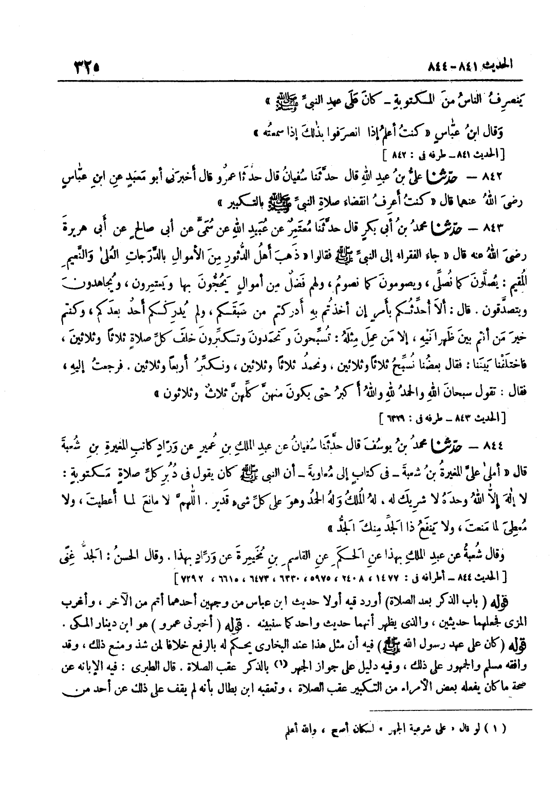 [841] قَوْلُهُ أَخْبَرَنِي عَمْرٌو هُوَ بن دِينَارٍ الْمَكِّيُّ قَوْلُهُ كَانَ عَلَى عَهْدِ رَسُولِ اللَّهِ صَلَّى اللَّهُ عَلَيْهِ وَسَلَّمَ فِيهِ أَنَّ مِثْلَ هَذَا عِنْدَ الْبُخَارِيِّ يُحْكَمُ لَهُ بِالرَّفْعِ خِلَافًا لِمَنْ شَذَّ وَمَنَعَ ذَلِكَ وَقَدْ وَافَقَهُ مُسْلِمٌ وَالْجُمْهُورُ عَلَى ذَلِكَ وَفِيهِ دَلِيلٌ عَلَى جَوَازِ الْجَهْرِ بِالذِّكْرِ عَقِبَ الصَّلَاةِ قَالَ الطَّبَرِيُّ فِيهِ الْإِبَانَةُ عَنْ صِحَّةِ مَا كَانَ يَفْعَلُهُ بَعْضُ الْأُمَرَاءِ مِنَ التَّكْبِيرِ عَقِبَ الصَّلَاةِ وَتَعَقَّبَهُ بن بَطَّالٍ بِأَنَّهُ لَمْ يَقِفْ عَلَى ذَلِكَ عَنْ أحد من