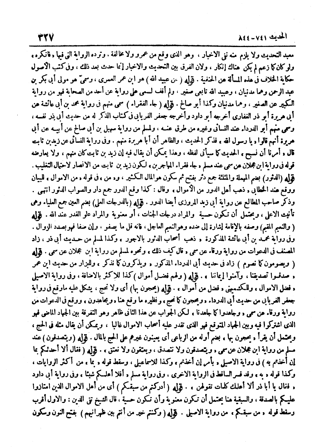[843] قَوْلُهُ عَنْ عُبَيْدِ الله هُوَ بن عُمَرَ الْعُمَرِيُّ وَسُمَيٌّ هُوَ مَوْلَى أَبِي بَكْرِ بْنِ عَبْدِ الرَّحْمَنِ وَهُمَا مَدَنِيَّانِ وَعُبَيْدُ اللَّهِ تَابِعِيٌّ صَغِيرٌ وَلَمْ أَقِفْ لِسُمَيٍّ عَلَى رِوَايَةٍ عَنْ أَحَدٍ مِنَ الصَّحَابَةِ فَهُوَ مِنْ رِوَايَةِ الْكَبِيرِ عَنِ الصَّغِيرِ وَهُمَا مَدَنِيَّانِ وَكَذَا أَبُو صَالِحٍ قَوْلُهُ جَاءَ الْفُقَرَاءُ سُمِّيَ مِنْهُمْ فِي رِوَايَةِ مُحَمَّدِ بْنِ أَبِي عَائِشَةَ عَنْ أَبِي هُرَيْرَةَ أَبُو ذَرٍّ الْغِفَارِيُّ أَخْرَجَهُ أَبُو دَاوُدَ وَأَخْرَجَهُ جَعْفَرٌ الْفِرْيَابِيُّ فِي كِتَابِ الذِّكْرِ لَهُ مِنْ حَدِيثِ أَبِي ذَرٍّ نَفْسِهِ وَسُمِّيَ مِنْهُمْ أَبُو الدَّرْدَاءِ عِنْدَ النَّسَائِيِّ وَغَيْرِهِ مِنْ طُرُقٍ عَنْهُ وَلِمُسْلِمٍ مِنْ رِوَايَةِ سُهَيْلِ بْنِ أَبِي صَالِحٍ عَنْ أَبِيهِ عَنْ أَبِي هُرَيْرَةَ أَنَّهُمْ قَالُوا يَا رَسُولَ اللَّهِ فَذَكَرَ الْحَدِيثَ وَالظَّاهِرُ أَنَّ أَبَا هُرَيْرَةَ مِنْهُمْ وَفِي رِوَايَةِ النَّسَائِيِّ عَنْ زَيْدِ بْنِ ثَابِتٍ قَالَ أُمِرْنَا أَنْ نُسَبِّحَ الْحَدِيثَ كَمَا سَيَأْتِي لَفْظُهُ وَهَذَا يُمْكِنُ أَنْ يُقَالَ فِيهِ إِنَّ زَيْدَ بْنَ ثَابِتٍ كَانَ مِنْهُمْ وَلَا يُعَارِضُهُ قَوْلُهُ فِي رِوَايَةِ بن عَجْلَانَ عَنْ سُمَيٍّ عِنْدَ مُسْلِمٍ جَاءَ فُقَرَاءُ الْمُهَاجِرِينَ لِكَوْنِ زَيْدِ بْنِ ثَابِتٍ مِنَ الْأَنْصَارِ لِاحْتِمَالِ التَّغْلِيبِ قَوْلُهُ الدُّثُورِ بِضَمِّ الْمُهْمَلَةِ وَالْمُثَلَّثَةِ جَمْعُ دَثْرٍ بِفَتْحٍ ثُمَّ سُكُونٍ هُوَ الْمَالُ الْكثير وَمن فِي قَوْلِهِ مِنَ الْأَمْوَالِ لِلْبَيَانِ وَوَقَعَ عِنْدَ الْخَطَّابِيِّ ذَهَبَ أَهْلُ الدُّورِ مِنَ الْأَمْوَالِ وَقَالَ كَذَا وَقَعَ الدُّورُ جَمْعُ دَارٍ وَالصَّوَابُ الدُّثُورُ انْتَهَى وَذَكَرَ صَاحِبُ الْمَطَالِعِ عَنْ رِوَايَةِ أَبِي زَيْدٍ الْمَرْوَزِيِّ أَيْضًا الدُّورَ قَوْلُهُ بِالدَّرَجَاتِ الْعُلَى بِضَمِّ الْعَيْنِ جَمْعُ الْعَلْيَاءِ وَهِيَ تَأْنِيثُ الْأَعْلَى وَيَحْتَمِلُ أَنْ تَكُونَ حِسِّيَّةً وَالْمُرَادُ دَرَجَاتُ الْجَنَّاتِ أَوْ مَعْنَوِيَّةً وَالْمُرَادُ عُلُوُّ الْقَدْرِ عِنْدَ اللَّهِ قَوْلُهُ وَالنَّعِيمِ الْمُقِيمِ وَصَفَهُ بِالْإِقَامَةِ إِشَارَةً إِلَى ضِدِّهِ وَهُوَ النَّعِيمُ الْعَاجِلُ فَإِنَّهُ قَلَّ مَا يَصْفُو وَإِنْ صَفَا فَهُوَ بِصَدَدِ الزَّوَالِ وَفِي رِوَايَةِ مُحَمَّدِ بْنِ أَبِي عَائِشَةَ الْمَذْكُورَةِ ذَهَبَ أَصْحَابُ الدُّثُورِ بِالْأُجُورِ وَكَذَا لِمُسْلِمٍ مِنْ حَدِيثِ أَبِي ذَرٍّ زَادَ الْمُصَنِّفُ فِي الدَّعَوَاتِ مِنْ رِوَايَةِ وَرْقَاءَ عَنْ سُمَيٍّ قَالَ كَيْفَ ذَلِكَ وَنَحْوه لمُسلم من رِوَايَة بن عَجْلَانَ عَنْ سُمَيٍّ قَوْلُهُ وَيَصُومُونَ كَمَا نَصُومُ زَادَ فِي حَدِيثِ أَبِي الدَّرْدَاءِ الْمَذْكُورِ وَيَذْكُرُونَ كَمَا نذْكر وللبزار من حَدِيث بن عُمَرَ صَدَّقُوا تَصْدِيقَنَا وَآمَنُوا إِيمَانَنَا قَوْلُهُ وَلَهُمْ فَضْلُ أَمْوَالٍ كَذَا لِلْأَكْثَرِ بِالْإِضَافَةِ وَفِي رِوَايَةِ الْأَصِيلِيِّ فَضْلُ الْأَمْوَالِ ولِلْكُشْمِيهَنِيِّ فَضْلٌ مِنْ أَمْوَالٍ قَوْلُهُ يَحُجُّونَ بِهَا أَيْ وَلَا نَحُجُّ يُشْكِلُ عَلَيْهِ مَا وَقَعَ فِي رِوَايَةِ جَعْفَرٍ الْفِرْيَابِيِّ مِنْ حَدِيثِ أَبِي الدَّرْدَاءِ وَيَحُجُّونَ كَمَا نَحُجُّ وَنَظِيرُهُ مَا وَقَعَ هُنَا وَيُجَاهِدُونَ وَوَقَعَ فِي الدَّعَوَاتِ مِنْ رِوَايَةِ وَرْقَاءَ عَنْ سُمَيٍّ وَجَاهَدُوا كَمَا جَاهَدْنَا لَكِنَّ الْجَوَابَ عَنْ هَذَا الثَّانِي ظَاهِرٌ وَهُوَ التَّفْرِقَةُ بَيْنَ الْجِهَادِ الْمَاضِي فَهُوَ الَّذِي اشْتَرَكُوا فِيهِ وَبَيْنَ الْجِهَا