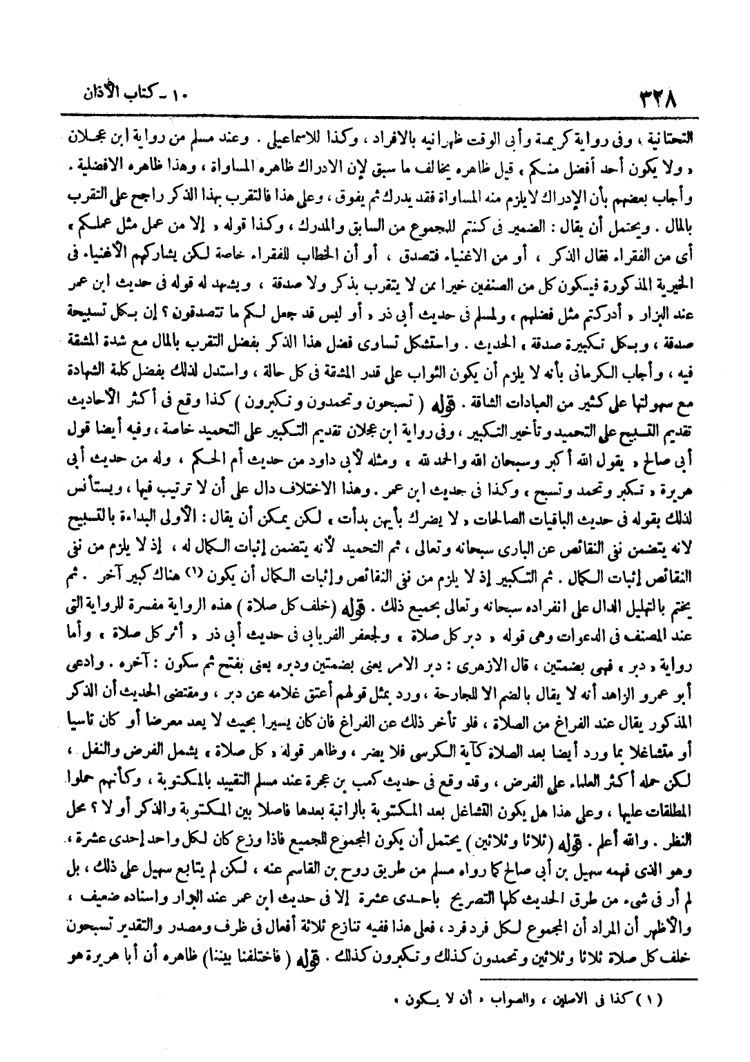 التَّحْتَانِيَّةِ وَفِي رِوَايَةِ كَرِيمَةَ وَأَبِي الْوَقْتِ ظَهْرَانَيْهِ بِالْإِفْرَادِ وَكَذَا لِلْإِسْمَاعِيلِيِّ وَعِنْدَ مُسْلِمٍ مِنْ رِوَايَةِ بن عَجْلَانَ وَلَا يَكُونُ أَحَدٌ أَفْضَلَ مِنْكُمْ قِيلَ ظَاهِرُهُ يُخَالِفُ مَا سَبَقَ لِأَنَّ الْإِدْرَاكَ ظَاهِرُهُ الْمُسَاوَاةُ وَهَذَا ظَاهِرُهُ الْأَفْضَلِيَّةُ وَأَجَابَ بَعْضُهُمْ بِأَنَّ الْإِدْرَاكَ لَا يَلْزَمُ مِنْهُ الْمُسَاوَاةُ فَقَدْ يُدْرِكُ ثُمَّ يَفُوقُ وَعَلَى هَذَا فَالتَّقَرُّبُ بِهَذَا الذِّكْرِ رَاجِحٌ عَلَى التَّقَرُّبِ بِالْمَالِ وَيَحْتَمِلُ أَنْ يُقَالَ الضَّمِيُرُ فِي كُنْتُمْ لِلْمَجْمُوعِ مِنَ السَّابِقِ وَالْمُدْرِكِ وَكَذَا قَوْلُهُ إِلَّا مَنْ عَمِلَ مِثْلَ عَمَلِكُمْ أَيْ مِنَ الْفُقَرَاءِ فَقَالَ الذِّكْرُ أَوْ مِنَ الْأَغْنِيَاءِ فَتَصَدَّقَ أَوْ أَنَّ الْخِطَابَ لِلْفُقَرَاءِ خَاصَّةً لَكِنْ يُشَارِكُهُمُ الْأَغْنِيَاءُ فِي الْخَيْرِيَّةِ الْمَذْكُورَةِ فَيَكُونُ كُلٌّ مِنَ الصِّنْفَيْنِ خَيْرًا مِمَّنْ لَا يَتَقَرَّبُ بِذِكْرٍ وَلَا صَدَقَةٍ وَيَشْهَدُ لَهُ قَوْلُهُ فِي حَدِيث بن عُمَرَ عِنْدَ الْبَزَّارِ أَدْرَكْتُمْ مِثْلَ فَضْلِهِمْ وَلِمُسْلِمٍ فِي حَدِيث أبي ذَر أَو لَيْسَ قَدْ جَعَلَ لَكُمْ مَا تَتَصَدَّقُونَ إِنَّ بِكُلِّ تَسْبِيحَةٍ صَدَقَةً وَبِكُلِّ تَكْبِيرَةٍ صَدَقَةً الْحَدِيثُ وَاسْتُشْكِلَ تَسَاوِي فَضْلِ هَذَا الذِّكْرِ بِفَضْلِ التَّقَرُّبِ بِالْمَالِ مَعَ شِدَّةِ الْمَشَقَّةِ فِيهِ وَأَجَابَ الْكِرْمَانِيُّ بِأَنَّهُ لَا يَلْزَمُ أَنْ يَكُونَ الثَّوَابُ عَلَى قَدْرِ الْمَشَقَّةِ فِي كُلِّ حَالَةٍ وَاسْتُدِلَّ لِذَلِكَ بِفَضْلِ كَلِمَةِ الشَّهَادَةِ مَعَ سُهُولَتِهَا عَلَى كَثِيرٍ مِنَ الْعِبَادَات الشاقة قَوْله تسبحون وَتَحْمَدُونَ وَتُكَبِّرُونَ كَذَا وَقَعَ فِي أَكْثَرِ الْأَحَادِيثِ تَقْدِيمُ التَّسْبِيحِ عَلَى التَّحْمِيدِ وَتَأْخِيرُ التَّكْبِيرِ وَفِي رِوَايَة بن عَجْلَانَ تَقْدِيمُ التَّكْبِيرِ عَلَى التَّحْمِيدِ خَاصَّةً وَفِيهِ أَيْضًا قَوْلُ أَبِي صَالِحٍ يَقُولُ اللَّهُ أَكْبَرُ وَسُبْحَانَ اللَّهِ وَالْحَمْدُ لِلَّهِ وَمِثْلُهُ لِأَبِي دَاوُدَ مِنْ حَدِيثِ أُمِّ الْحَكَمِ وَلَهُ مِنْ حَدِيثِ أَبِي هُرَيْرَةَ تُكَبِّرُ وَتَحْمَدُ وَتُسَبِّحُ وَكَذَا فِي حَدِيث بن عُمَرَ وَهَذَا الِاخْتِلَافُ دَالٌّ عَلَى أَنْ لَا تَرْتِيبَ فِيهَا وَيُسْتَأْنَسُ لِذَلِكَ بِقَوْلِهِ فِي حَدِيثِ الْبَاقِيَاتِ الصَّالِحَاتِ لَا يَضُرُّكَ بِأَيِّهِنَّ بَدَأْتَ لَكِنْ يُمْكِنُ أَنْ يُقَالَ الْأَوْلَى الْبَدَاءَةُ بِالتَّسْبِيحِ لِأَنَّهُ يتَضَمَّن نفى النقائص عَنِ الْبَارِي سُبْحَانَهُ وَتَعَالَى ثُمَّ التَّحْمِيدُ لِأَنَّهُ يَتَضَمَّنُ إِثْبَاتَ الْكَمَالِ لَهُ إِذْ لَا يَلْزَمُ من نفى النقائص إِثْبَاتُ الْكَمَالِ ثُمَّ التَّكْبِيرُ إِذْ لَا يَلْزَمُ من نفى النقائص وَإِثْبَات الْكَمَال أَن يكون هُنَاكَ كَبِيرٌ آخَرُ ثُمَّ يَخْتِمُ بِالتَّهْلِيلِ الدَّالِّ عَلَى انْفِرَادِهِ سُبْحَانَهُ وَتَعَالَى بِجَمِيعِ ذَلِكَ قَوْلُهُ خَلْفَ كُلِّ صَلَاةٍ هَذِهِ الرِّوَايَةُ مُفَسِّرَةٌ لِلرِّوَايَةِ الَّتِي عِنْدَ الْمُصَنِّفِ فِي الدَّعَوَاتِ وَهِيَ