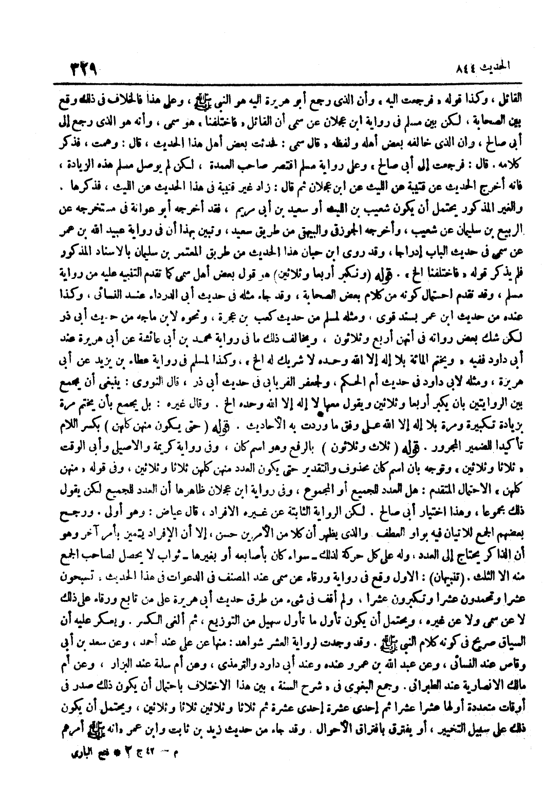 الْقَائِلُ وَكَذَا قَوْلُهُ فَرَجَعْتُ إِلَيْهِ وَأَنَّ الَّذِي رَجَعَ أَبُو هُرَيْرَةَ إِلَيْهِ هُوَ النَّبِيُّ صَلَّى اللَّهُ عَلَيْهِ وَسَلَّمَ وَعَلَى هَذَا فَالْخِلَافُ فِي ذَلِكَ وَقَعَ بَيْنَ الصَّحَابَةِ لَكِنْ بَيَّنَ مُسْلِمٌ فِي رِوَايَة بن عَجْلَانَ عَنْ سُمَيٍّ أَنَّ الْقَائِلَ فَاخْتَلَفْنَا هُوَ سُمَيٌّ وَأَنَّهُ هُوَ الَّذِي رَجَعَ إِلَى أَبِي صَالِحٍ وَأَنَّ الَّذِي خَالَفَهُ بَعْضُ أَهْلِهِ وَلَفْظُهُ قَالَ سُمَيٌّ فَحَدَّثْتُ بَعْضَ أَهْلِ هَذَا الْحَدِيثِ قَالَ وَهِمْتُ فَذَكَرَ كَلَامَهُ قَالَ فَرَجَعْتُ إِلَى أَبِي صَالِحٍ وَعَلَى رِوَايَةِ مُسْلِمٍ اقْتَصَرَ صَاحِبُ الْعُمْدَةٍ لَكِنْ لَمْ يُوصِلْ مُسْلِمٌ هَذِهِ الزِّيَادَةَ فَإِنَّهُ أَخْرَجَ الْحَدِيثَ عَنْ قُتَيْبَةَ عَنِ اللَّيْثِ عَن بن عَجْلَانَ ثُمَّ قَالَ زَادَ غَيْرُ قُتَيْبَةَ فِي هَذَا الْحَدِيثِ عَنِ اللَّيْثِ فَذَكَرَهَا وَالْغَيْرُ الْمَذْكُورُ يَحْتَمِلُ أَنْ يَكُونَ شُعَيْبَ بْنَ اللَّيْثِ أَوْ سَعِيدَ بْنَ أَبِي مَرْيَمَ فَقَدْ أَخْرَجَهُ أَبُو عَوَانَةَ فِي مُسْتَخْرَجِهِ عَنِ الرَّبِيعِ بْنِ سُلَيْمَانَ عَنْ شُعَيْبٍ وَأَخْرَجَهُ الْجَوْزَقِيُّ وَالْبَيْهَقِيُّ مِنْ طَرِيقِ سَعِيدٍ وَتَبَيَّنَ بِهَذَا أَنَّ فِي رِوَايَةِ عُبَيْدِ اللَّهِ بْنِ عُمَرَ عَنِ سُمَيٍّ فِي حَدِيثِ الْبَاب إدراجا وَقد روى بن حِبَّانَ هَذَا الْحَدِيثَ مِنْ طَرِيقِ الْمُعْتَمِرِ بْنِ سُلَيْمَانَ بِالْإِسْنَادِ الْمَذْكُورِ فَلَمْ يَذْكُرْ قَوْلَهُ فَاخْتَلَفْنَا الخ قَوْله وتكبر أَرْبَعًا وَثَلَاثِينَ هُوَ قَوْلُ بَعْضِ أَهْلِ سُمَيٍّ كَمَا تَقَدَّمَ التَّنْبِيهُ عَلَيْهِ مِنْ رِوَايَةِ مُسْلِمٍ وَقَدْ تَقَدَّمَ احْتِمَالُ كَوْنِهِ مِنْ كَلَامِ بَعْضِ الصَّحَابَةِ وَقَدْ جَاءَ مِثْلُهُ فِي حَدِيثِ أَبِي الدَّرْدَاءِ عِنْدَ النَّسَائِيِّ وَكَذَا عِنْدَهُ مِنْ حَدِيثِ بن عُمَرَ بِسَنَدٍ قَوِيٍّ وَمِثْلُهُ لِمُسْلِمٍ مِنْ حَدِيثِ كَعْبِ بْنِ عُجْرَةَ وَنَحْوُهُ لِابْنِ مَاجَهْ مِنْ حَدِيثِ أَبِي ذَرٍّ لَكِنْ شَكَّ بَعْضُ رُوَاتِهِ فِي أَنَّهُنَّ أَرْبَعٌ وَثَلَاثُونَ وَيُخَالِفُ ذَلِكَ مَا فِي رِوَايَةِ مُحَمَّدِ بْنِ أَبِي عَائِشَةَ عَنْ أَبِي هُرَيْرَةَ عِنْدَ أَبِي دَاوُدَ فَفِيهِ وَيَخْتِمُ الْمِائَةَ بِلَا إِلَهَ إِلَّا اللَّهُ وَحْدَهُ لَا شَرِيكَ لَهُ إِلَخْ وَكَذَا لِمُسْلِمٍ فِي رِوَايَةِ عَطَاءِ بْنِ يَزِيدَ عَنْ أَبِي هُرَيْرَةَ وَمِثْلُهُ لِأَبِي دَاوُدَ فِي حَدِيثِ أُمِّ الْحَكَمِ وَلِجَعْفَرٍ الْفِرْيَابِيِّ فِي حَدِيثِ أَبِي ذَرٍّ قَالَ النَّوَوِيُّ يَنْبَغِي أَنْ يُجْمَعَ بَيْنَ الرِّوَايَتَيْنِ بِأَنْ يُكَبِّرَ أَرْبَعًا وَثَلَاثِينَ وَيَقُولَ مَعَهَا لَا إِلَهَ إِلَّا اللَّهُ وَحْدَهُ إِلَخْ وَقَالَ غَيْرُهُ بَلْ يُجْمَعُ بِأَنْ يَخْتِمَ مَرَّةً بِزِيَادَةِ تَكْبِيرَةٍ وَمَرَّةً بِلَا إِلَهَ إِلَّا اللَّهُ عَلَى وَفْقِ مَا وَرَدَتْ بِهِ الْأَحَادِيثُ قَوْلُهُ حَتَّى يَكُونَ مِنْهُنَّ كُلِّهِنَّ بِكَسْرِ اللَّامِ تَأْكِيدًا لِلضَّمِيرِ الْمَجْرُورِ قَوْلُهُ ثَلَاثٌ وَثَلَاثُونَ بِالرَّفْعِ وَهُوَ اسْمُ كَانَ وَفِي رِوَايَةِ كَرِيمَةَ وَالْأَصِيلِيِّ وَأَبِي الْوَقْتِ ثَلَاثًا وَثَلَاثِينَ وَتَوَجَّهَ بِأَنَّ اسْمَ كَانَ مَحْذُوفٌ وَالتَّقْدِيرُ حَتَّى يَكُونَ الْعَدَدُ مِنْهُنَّ كُلِّهِنَّ ثَلَاثًا وَثَلَاثِينَ وَفِي قَوْلِهِ مِنْهُنَّ كُلِّهِنَّ الِاحْتِمَالُ الْمُتَقَدِّمُ هَلِ الْعَدَدُ لِلْجَمِيعِ أَو الْمَجْمُوع وَفِي رِوَايَة بن عَجْلَانَ ظَاهِرُهَا أَنَّ الْعَدَدَ لِلْجَمِيعِ لَكِنْ يَقُولُ ذَلِكَ مَجْمُوعًا وَهَذَا اخْتِيَارُ أَبِي صَالِحٍ لَكِنَ