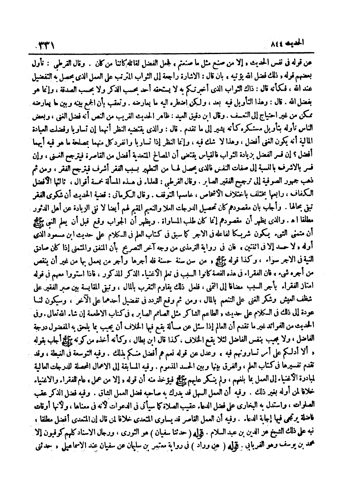 عَنْ قَوْلِهِ فِي نَفْسِ الْحَدِيثِ إِلَّا مَنْ صَنَعَ مِثْلَ مَا صَنَعْتُمْ فَجَعَلَ الْفَضْلَ لِقَائِلِهِ كَائِنًا مَنْ كَانَ وَقَالَ الْقُرْطُبِيُّ تَأَوَّلَ بَعْضُهُمْ قَوْله ذَلِك فضل الله يؤتيه بِأَنْ قَالَ الْإِشَارَةُ رَاجِعَةٌ إِلَى الثَّوَابِ الْمُتَرَتِّبِ عَلَى الْعَمَلِ الَّذِي يَحْصُلُ بِهِ التَّفْضِيلُ عِنْدَ اللَّهِ فَكَأَنَّهُ قَالَ ذَاكَ الثَّوَابُ الَّذِي أَخْبَرْتُكُمْ بِهِ لَا يَسْتَحِقُّهُ أَحَدٌ بِحَسَبِ الذِّكْرِ وَلَا بِحَسَبِ الصَّدَقَةِ وَإِنَّمَا هُوَ بِفَضْلِ اللَّهِ قَالَ وَهَذَا التَّأْوِيلُ فِيهِ بُعْدٌ وَلَكِنِ اضْطَرَّهُ إِلَيْهِ مَا يُعَارِضُهُ وَتُعُقِّبَ بِأَنَّ الْجَمْعَ بَيْنَهُ وَبَيْنَ مَا يُعَارِضُهُ مُمْكِنٌ مِنْ غَيْرِ احْتِيَاجٍ إِلَى التعسف وَقَالَ بن دَقِيقِ الْعِيدِ ظَاهِرُ الْحَدِيثِ الْقَرِيبُ مِنَ النَّصِّ أَنَّهُ فَضَّلَ الْغَنِيَّ وَبَعْضُ النَّاسِ تَأَوَّلَهُ بِتَأْوِيلٍ مُسْتَكْرَهٍ كَأَنَّهُ يُشِيرُ إِلَى مَا تَقَدَّمَ قَالَ وَالَّذِي يَقْتَضِيهِ النَّظَرُ أَنَّهُمَا إِنْ تَسَاوَيَا وَفُضِّلَتِ الْعِبَادَةُ الْمَالِيَّةُ أَنَّهُ يَكُونُ الْغَنِيُّ أَفْضَلَ وَهَذَا لَا شَكَّ فِيهِ وَإِنَّمَا النَّظَرُ إِذَا تَسَاوَيَا وَانْفَرَدَ كُلٌّ مِنْهُمَا بِمَصْلَحَةِ مَا هُوَ فِيهِ أَيُّهُمَا أَفْضَلُ إِنْ فُسِّرَ الْفَضْلُ بِزِيَادَةِ الثَّوَابِ فَالْقِيَاسُ يَقْتَضِي أَنَّ الْمَصَالِحَ الْمُتَعَدِّيَةَ أَفْضَلُ مِنَ الْقَاصِرَةِ فَيَتَرَجَّحُ الْغَنِيُّ وَإِنْ فُسِّرَ بِالْأَشْرَفِ بِالنِّسْبَةِ إِلَى صِفَاتِ النَّفْسِ فَالَّذِي يَحْصُلُ لَهَا مِنَ التَّطْهِيرِ بِسَبَبِ الْفَقْرِ أَشْرَفُ فَيَتَرَجَّحُ الْفَقْرُ وَمِنْ ثَمَّ ذَهَبَ جُمْهُورُ الصُّوفِيَّةِ إِلَى تَرْجِيحِ الْفَقِيرِ الصَّابِرِ وَقَالَ الْقُرْطُبِيُّ لِلْعُلَمَاءِ فِي هَذِهِ الْمَسْأَلَةِ خَمْسَةُ أَقْوَالٍ ثَالِثُهَا الْأَفْضَلُ الْكَفَافُ رَابِعُهَا يَخْتَلِفُ بِاخْتِلَافِ الْأَشْخَاصِ خَامِسُهَا التَّوَقُّفُ وَقَالَ الْكِرْمَانِيُّ قَضِيَّةُ الْحَدِيثِ أَنَّ شَكْوَى الْفَقْرِ تَبْقَى بِحَالِهَا وَأَجَابَ بِأَنَّ مَقْصُودَهُمْ كَانَ تَحْصِيلَ الدَّرَجَاتِ الْعُلَا وَالنَّعِيمِ الْمُقِيمِ لَهُمْ أَيْضًا لَا نَفْيَ الزِّيَادَةِ عَنْ أَهْلِ الدُّثُورِ مُطْلَقًا اه وَالَّذِي يَظْهَرُ أَنَّ مَقْصُودَهُمْ إِنَّمَا كَانَ طَلَبَ الْمُسَاوَاةِ وَيَظْهَرُ أَنَّ الْجَوَابَ وَقَعَ قَبْلَ أَنْ يَعْلَمَ النَّبِيُّ صَلَّى اللَّهُ عَلَيْهِ وَسَلَّمَ أَنَّ مُتَمَنِّيَ الشَّيْءِ يَكُونُ شَرِيكًا لِفَاعِلِهِ فِي الْأَجْرِ كَمَا سَبَقَ فِي كتاب الْعلم فِي الْكَلَام على حَدِيث بن مَسْعُودٍ الَّذِي أَوَّلُهُ لَا حَسَدَ إِلَّا فِي اثْنَتَيْنِ فَإِنَّ فِي رِوَايَةَ التِّرْمِذِيِّ مِنْ وَجْهٍ آخَرَ التَّصْرِيحَ بِأَنَّ الْمُنْفِقَ وَالْمُتَمَنِّيَ إِذَا كَانَ صَادِقَ النِّيَّةِ فِي الْأَجْرِ سَوَاءٌ وَكَذَا قَوْلُهُ صَلَّى اللَّهُ عَلَيْهِ وَسَلَّمَ مَنْ سَنَّ سُنَّةً حَسَنَةً فَلَهُ أَجْرُهَا وَأَجْرُ مَنْ يَعْمَلُ بِهَا مِنْ غَيْرِ أَنْ يَنْقُصَ مِنْ أَجْرِهِ شَيْءٌ فَإِنَّ الْفُقَرَاءَ فِي هَذِهِ الْقِصَّةِ كَانُوا السَّبَبَ فِي تَعَلُّمِ الْأَغْنِيَاءِ الذِّكْرَ الْمَذْكُورَ فَإِذَا اسْتَوَوْا مَعَهُمْ فِي قَوْلِهِ امْتَازَ الْفُقَرَاءُ بِأَجْرِ السَّبَبِ مُضَافًا إِلَى التَّمَنِّي فَلَعَلَّ ذَلِكَ يُقَاوِمُ التَّقَرُّبَ بِالْمَالِ وَتَبْقَى الْمُقَايَسَةُ بَيْنَ صَبْرِ الْفَقِيرِ عَلَى شَظَفِ الْعَيْشِ وَشُكْرِ الْغَنِيِّ عَلَى التَّنَعُّمِ بِالْمَالِ وَمِنْ ثَمَّ وَقَعَ التَّرَدُّدُ فِي تَفْضِيلِ أَحَدِهِمَا عَلَى الْآخَرِ وَسَ
